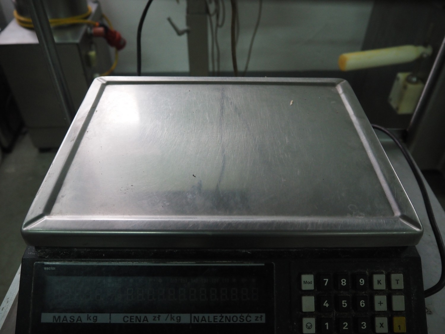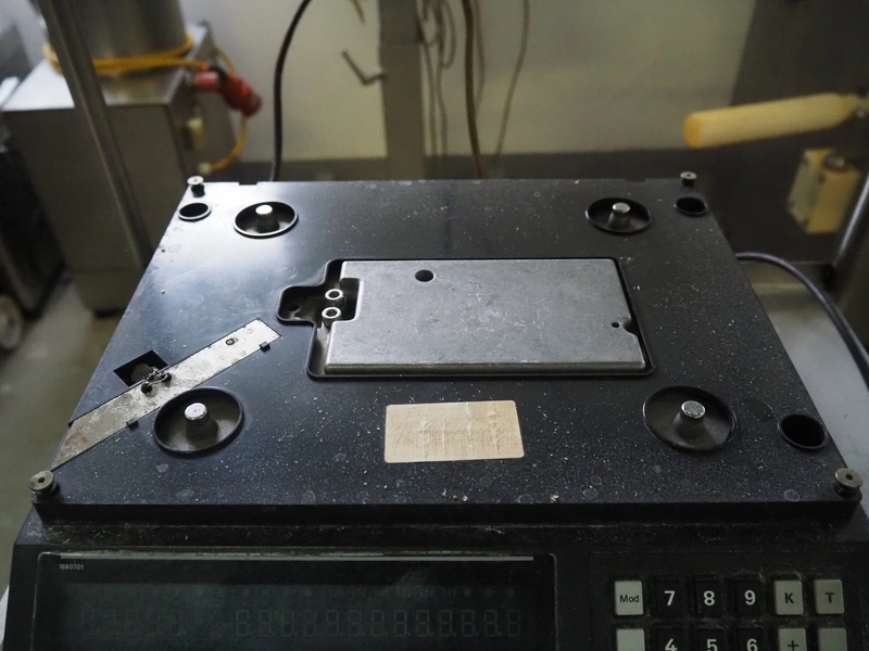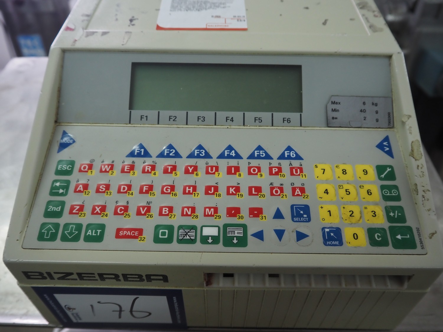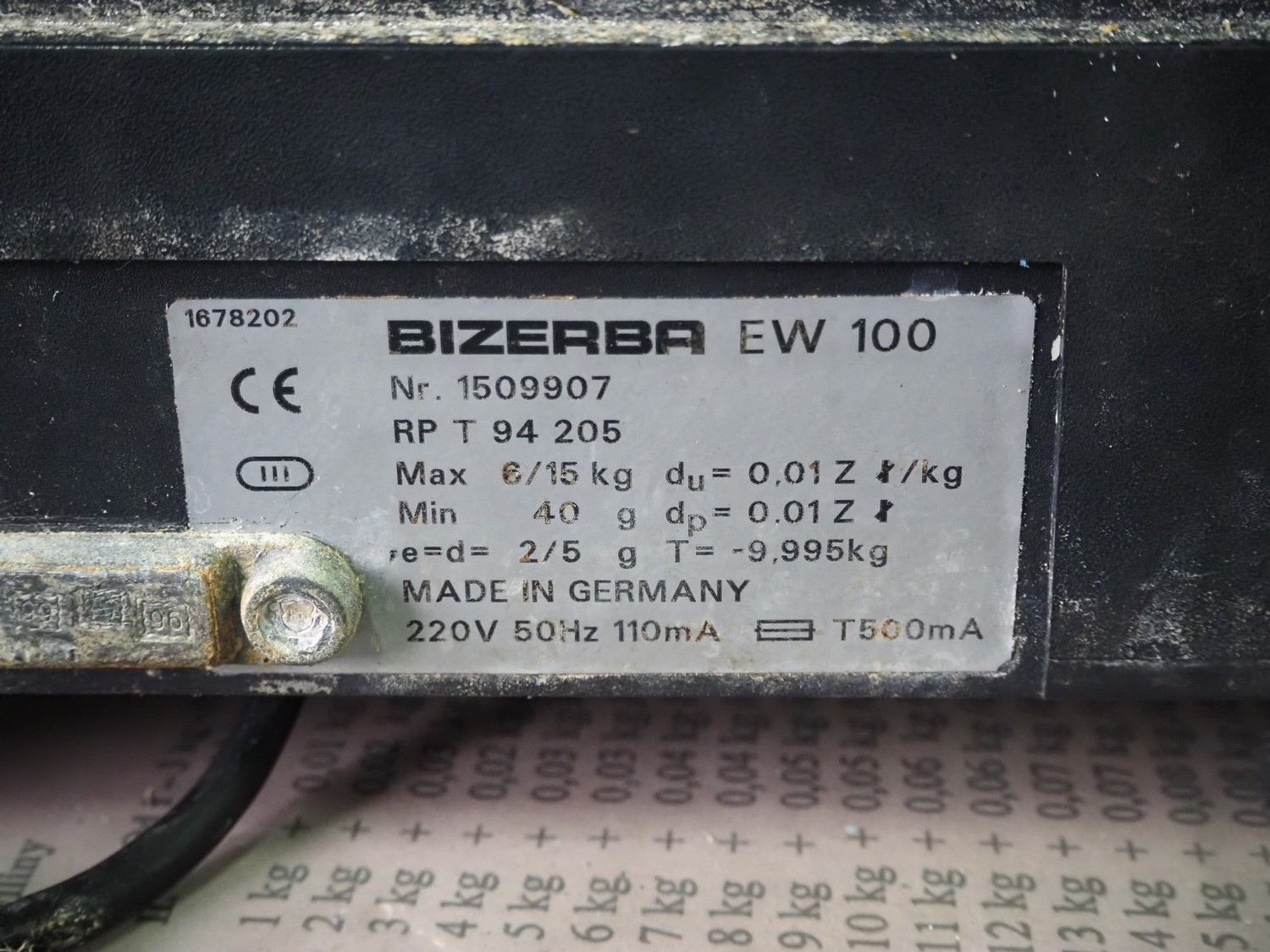 S/s frame with Bizerba weighing scale and label printer, scale type: EW 100, number: 1509907, 220 V, 50 Hz, maximum capacity: 6/15 kg, minimum capacity: 40 g, e=d= 2/5 g, scale dimensions: 340 mm x 260 mm, type label printer: GD, number: 1856007, 230 V, 50 Hz, 0.6 A, total dimensions: 600 mm x 500 mm x 1400 mm.