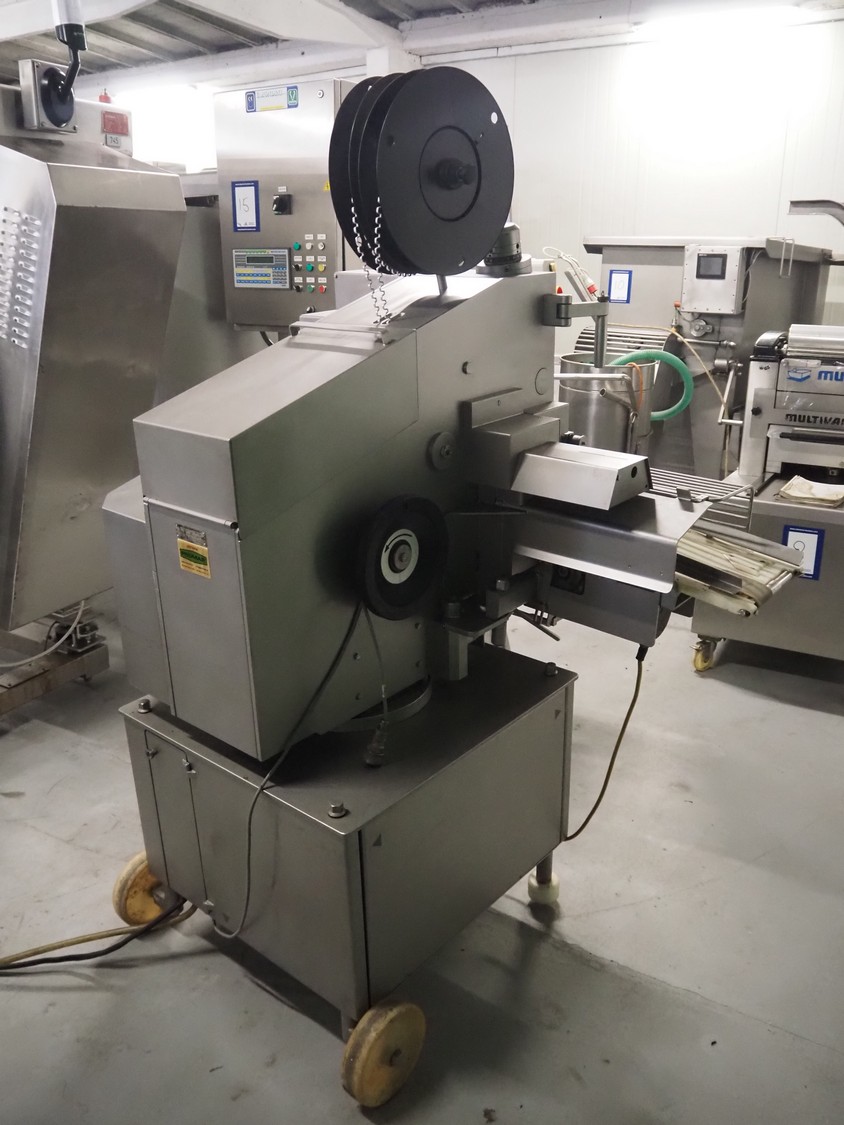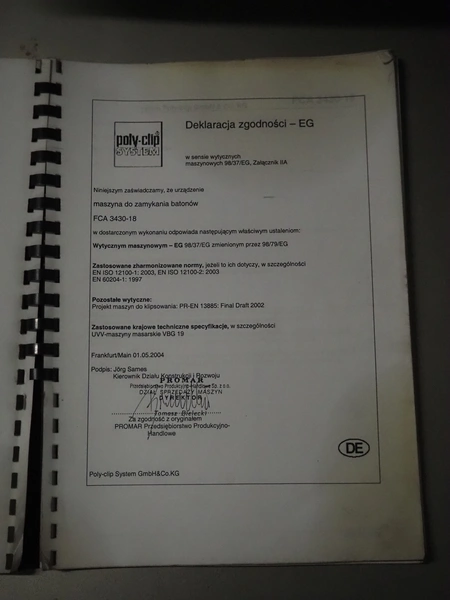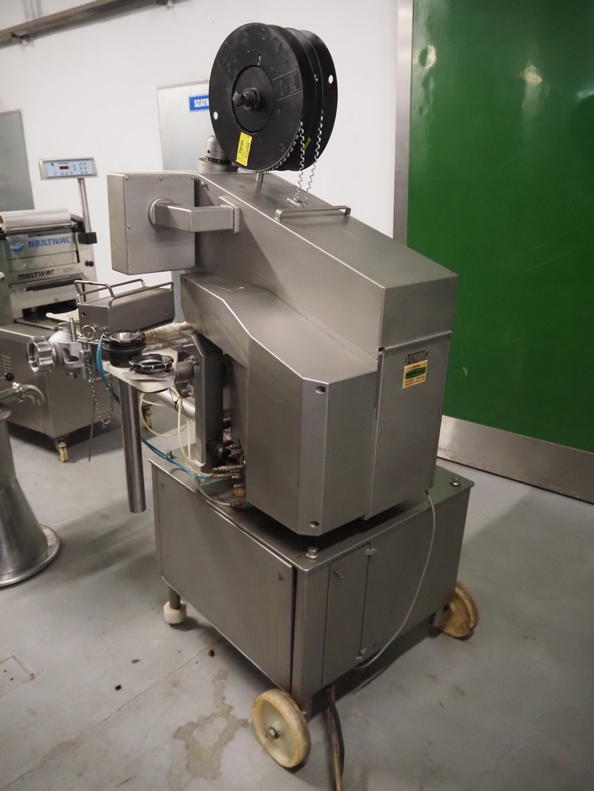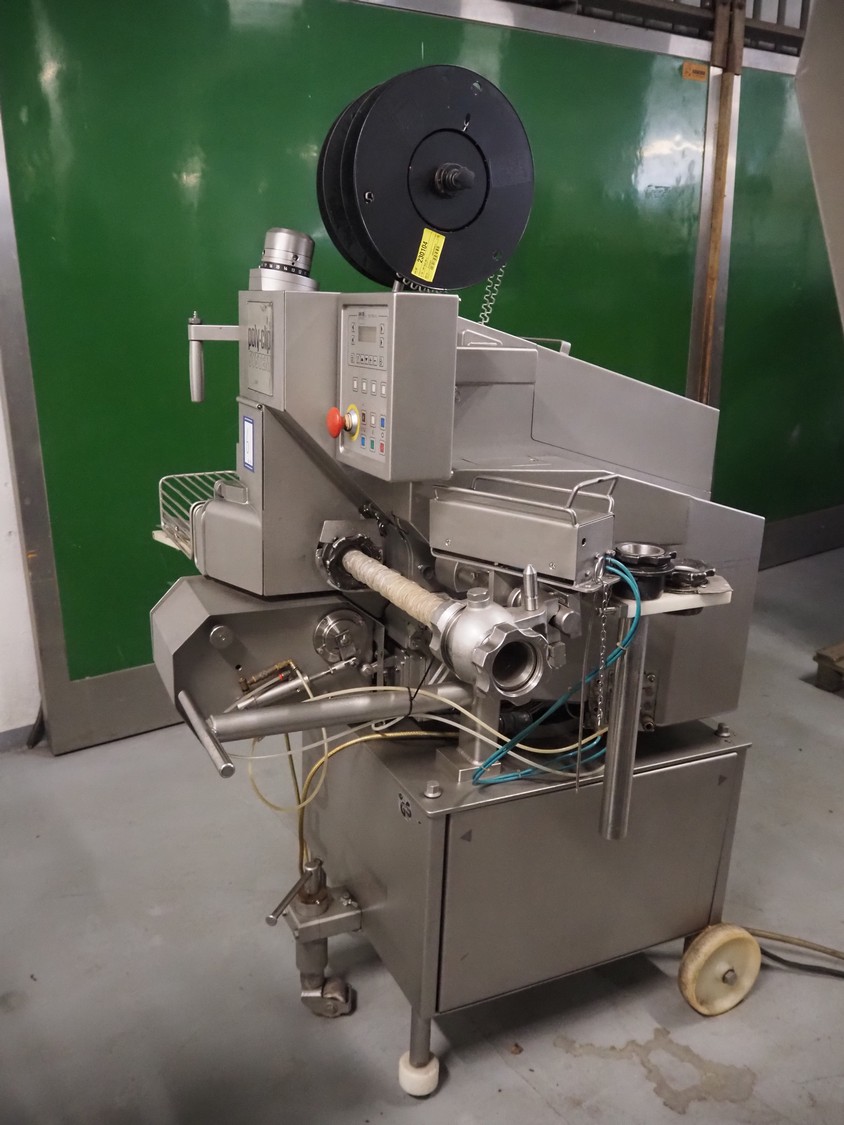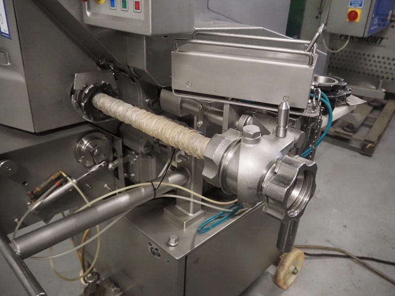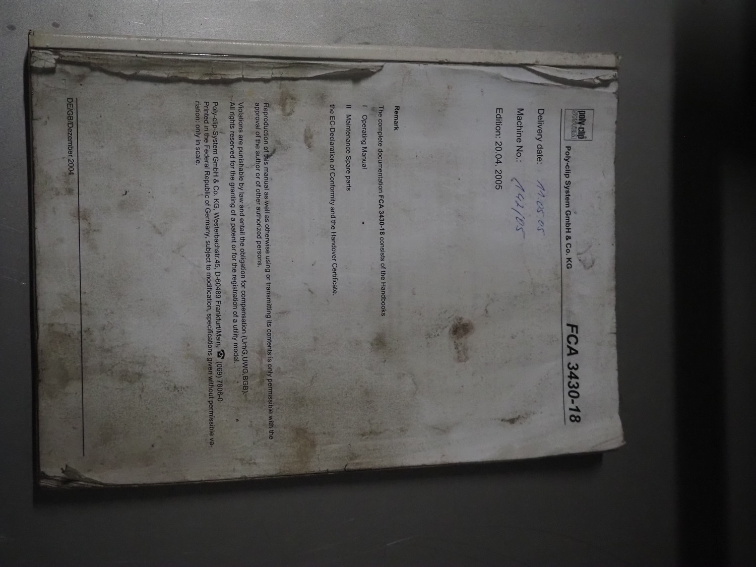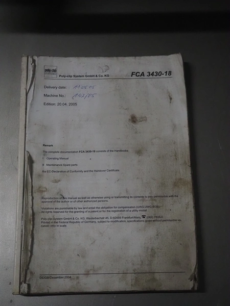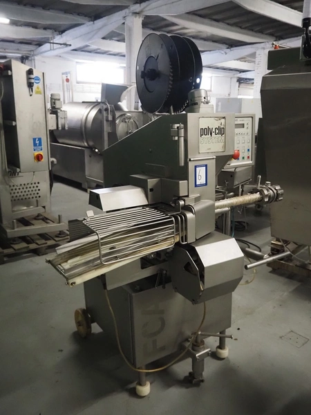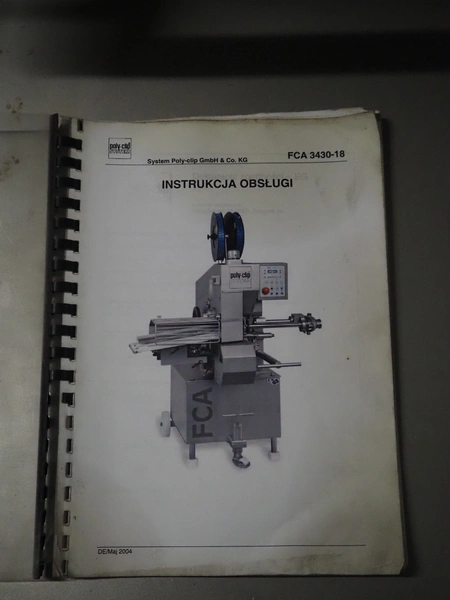 Poly-clip System GmbH & Co. KG mobile automatic double-clipper, type: FCA 3430-18, number: 142, year of construction: 2005, 400 V, 3 Ph, 50/60 Hz, 6 A, 40 kW, 5/7 bar, plastic outfeed belt, belt width: 75 mm, diameter pipe: 60 mm, total dimensions: 1440 mm x 1170 mm x 1920 mm.