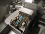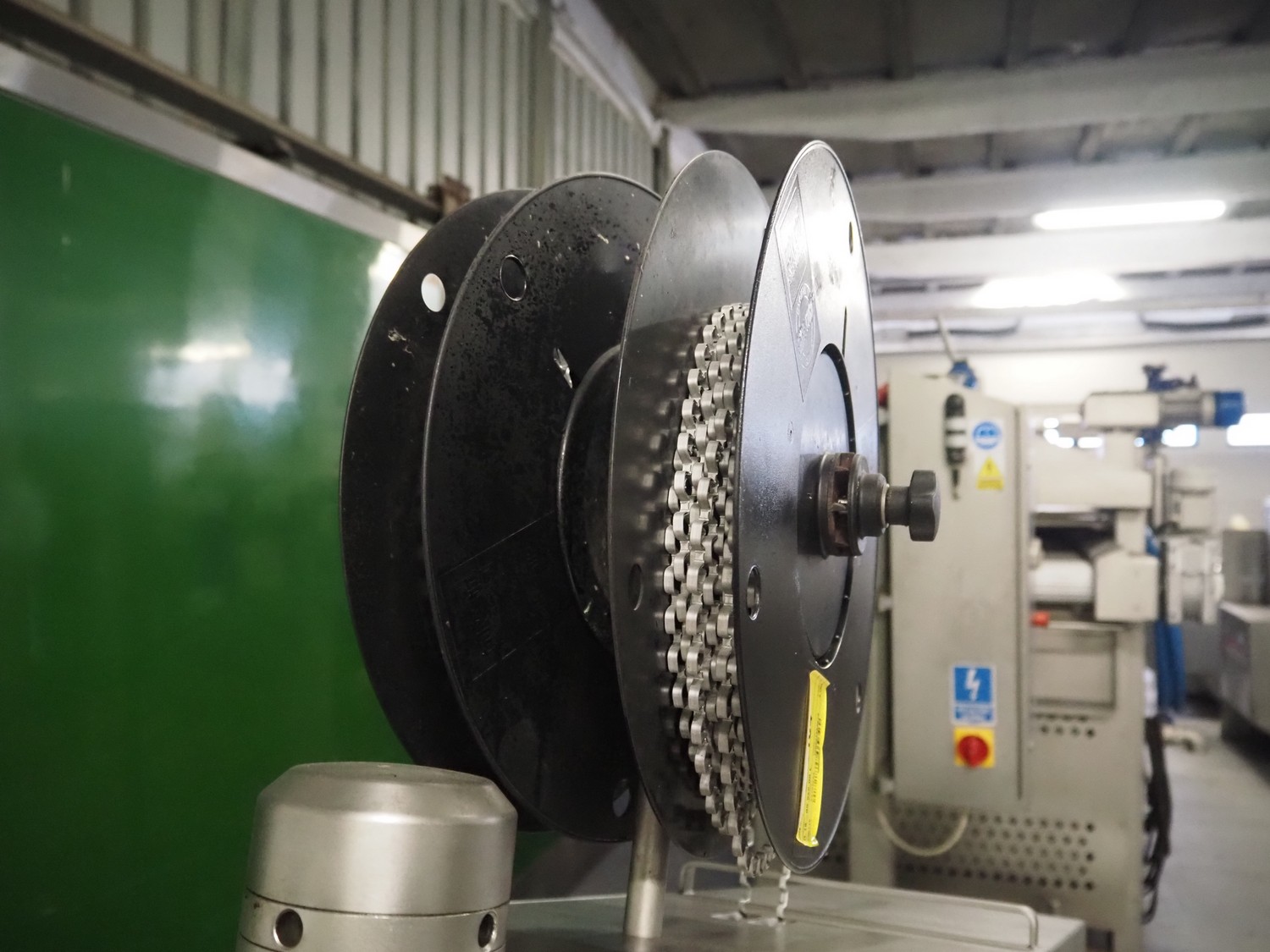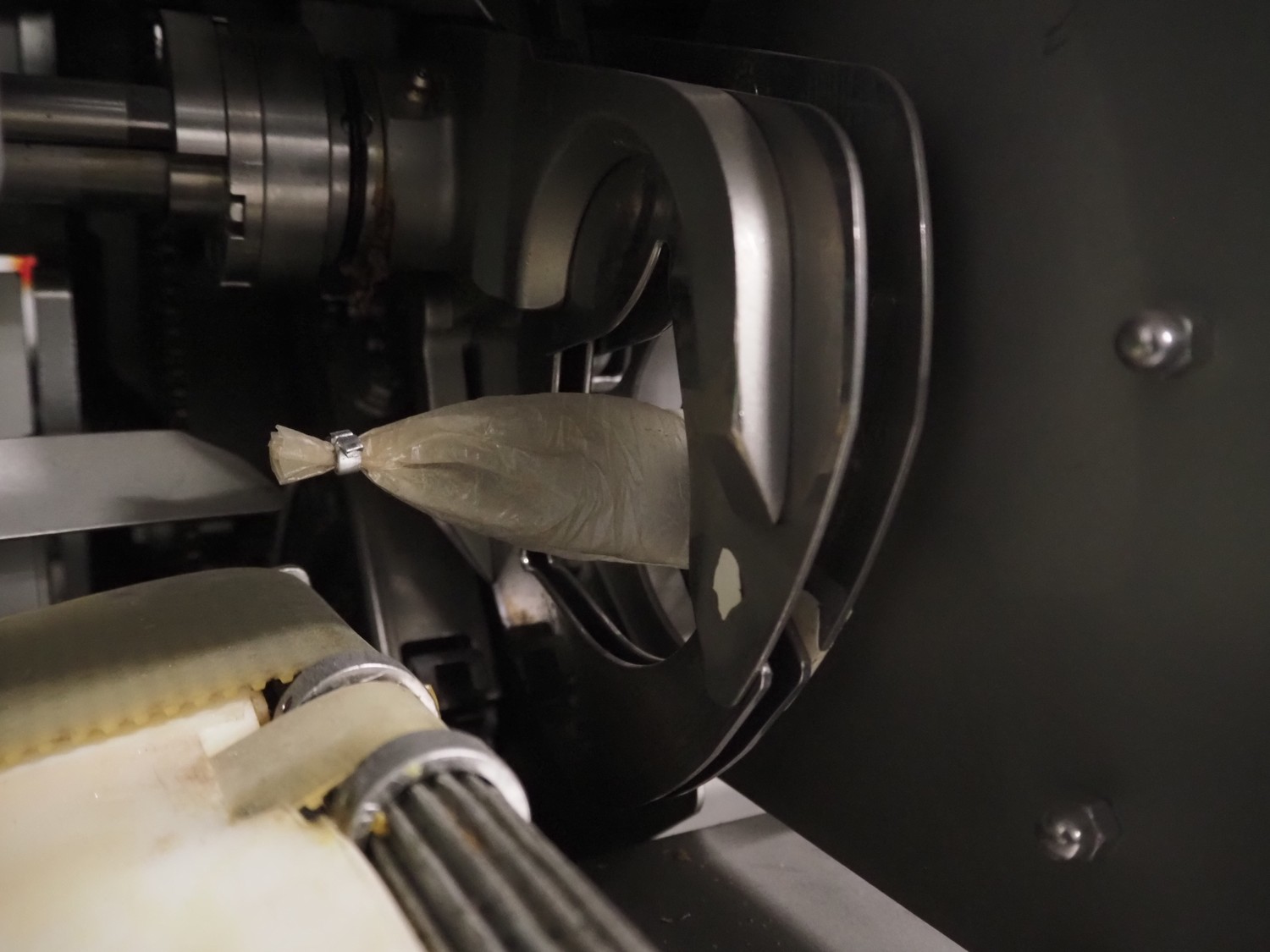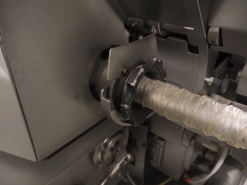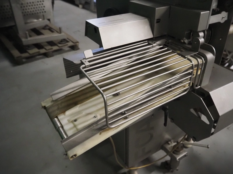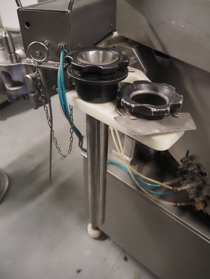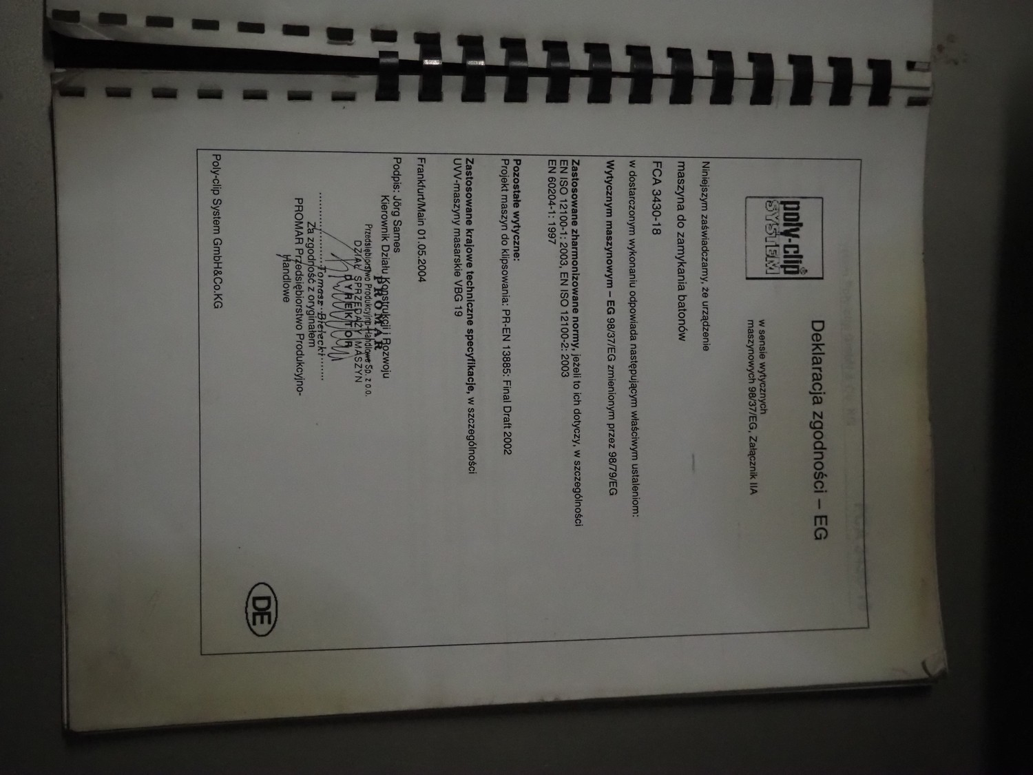 Poly-clip System GmbH & Co. KG mobile automatic double-clipper, type: FCA 3430-18, number: 142, year of construction: 2005, 400 V, 3 Ph, 50/60 Hz, 6 A, 40 kW, 5/7 bar, plastic outfeed belt, belt width: 75 mm, diameter pipe: 60 mm, total dimensions: 1440 mm x 1170 mm x 1920 mm.
