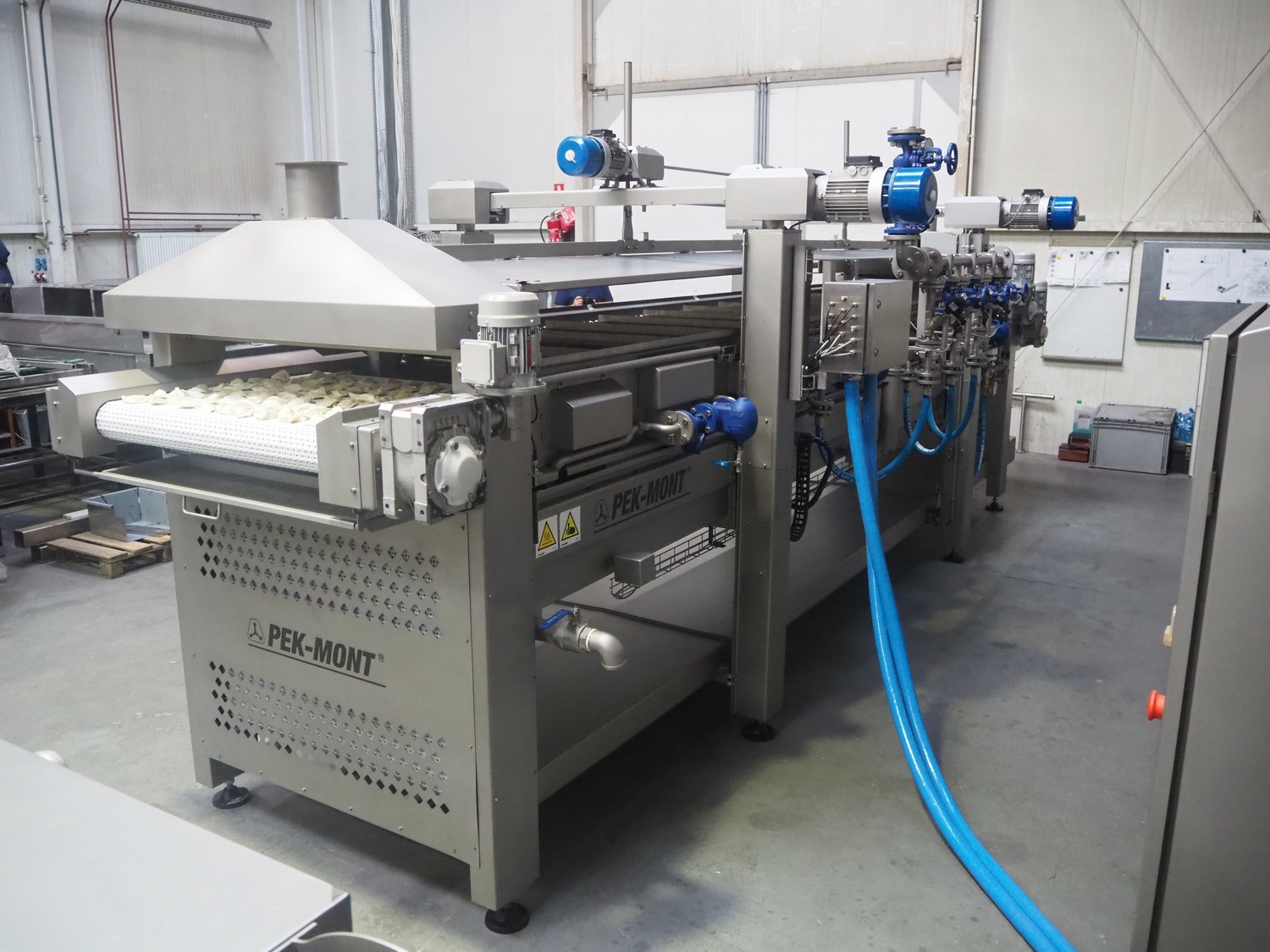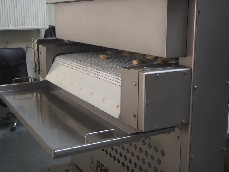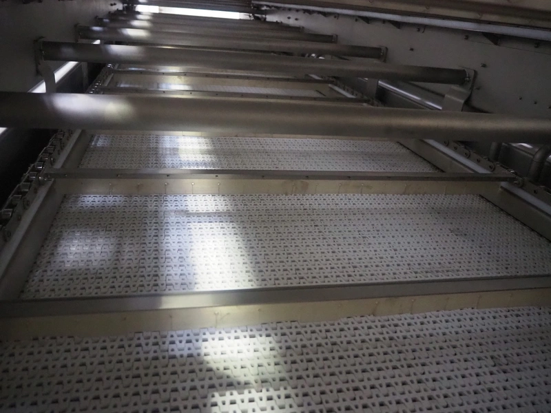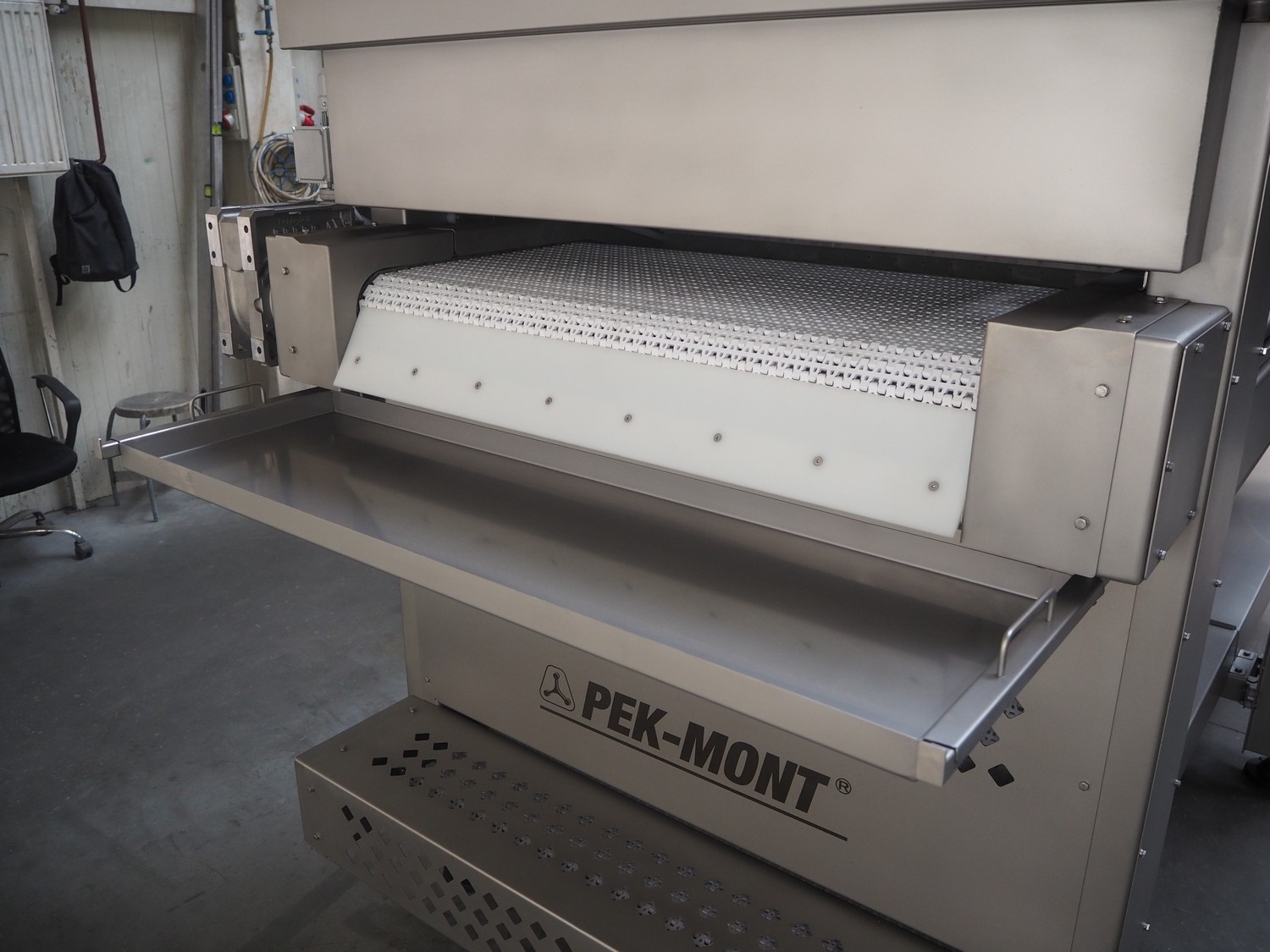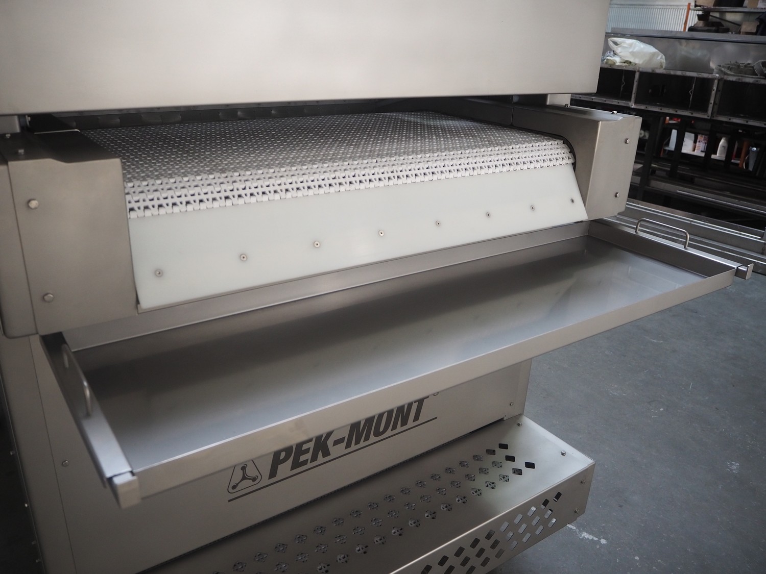 Pek-Mont belt cooker, type: GP-400, number: 11, year of construction: 2019, 400 V, steam heated, plastic mesh belt, belt width: 950 mm, dimensions belt cooker: 6600 mm x 1900 mm x 2550 mm, dimensions switch cabinet: 900 mm x 700 mm x 1880 mm. Never used.