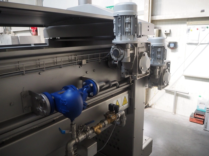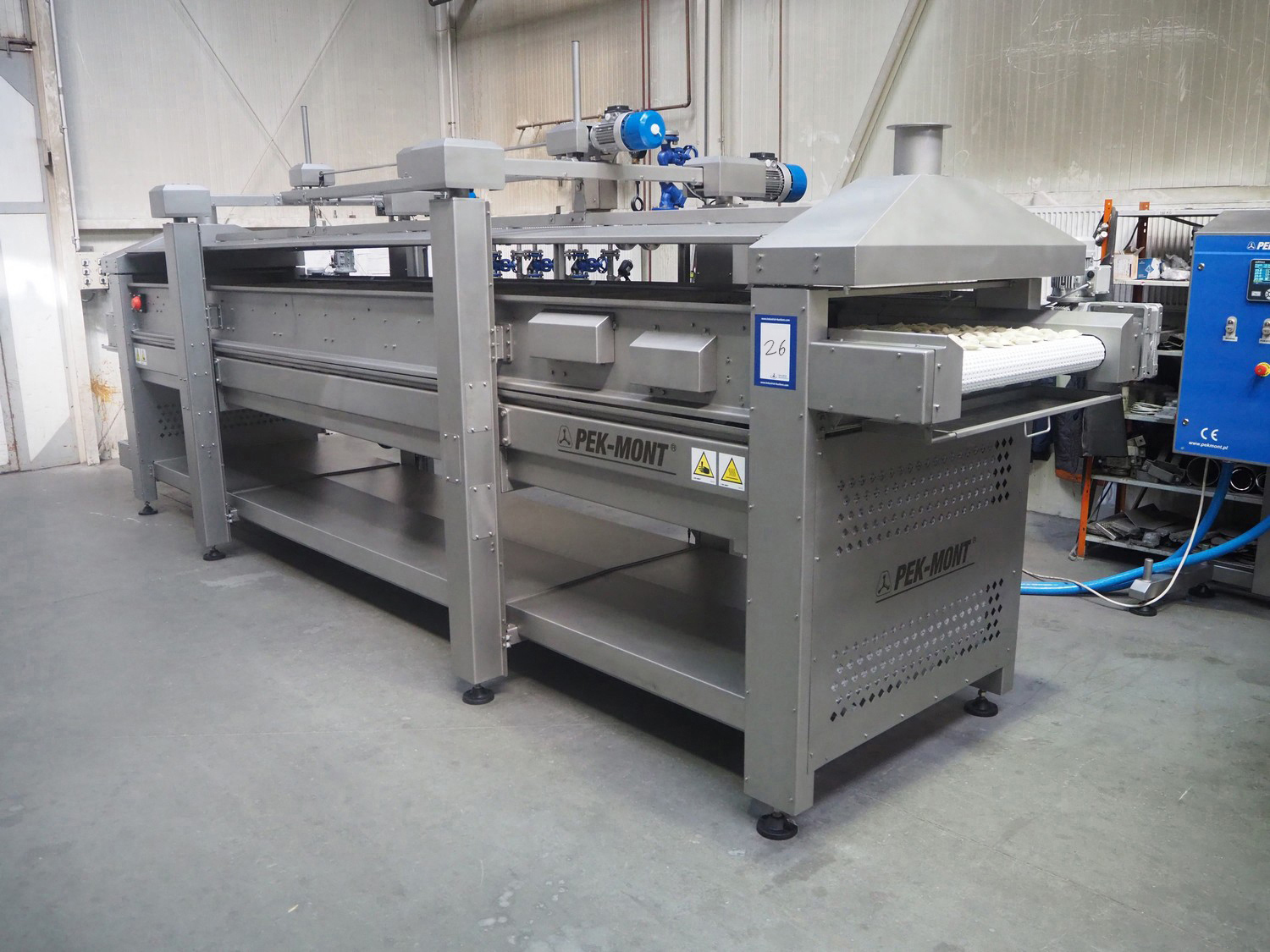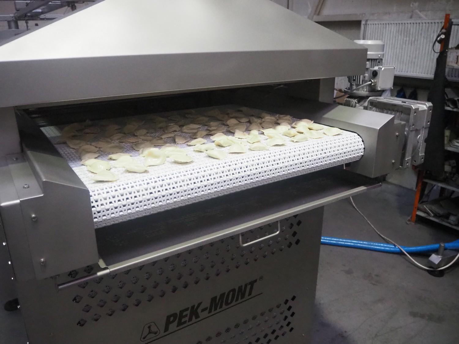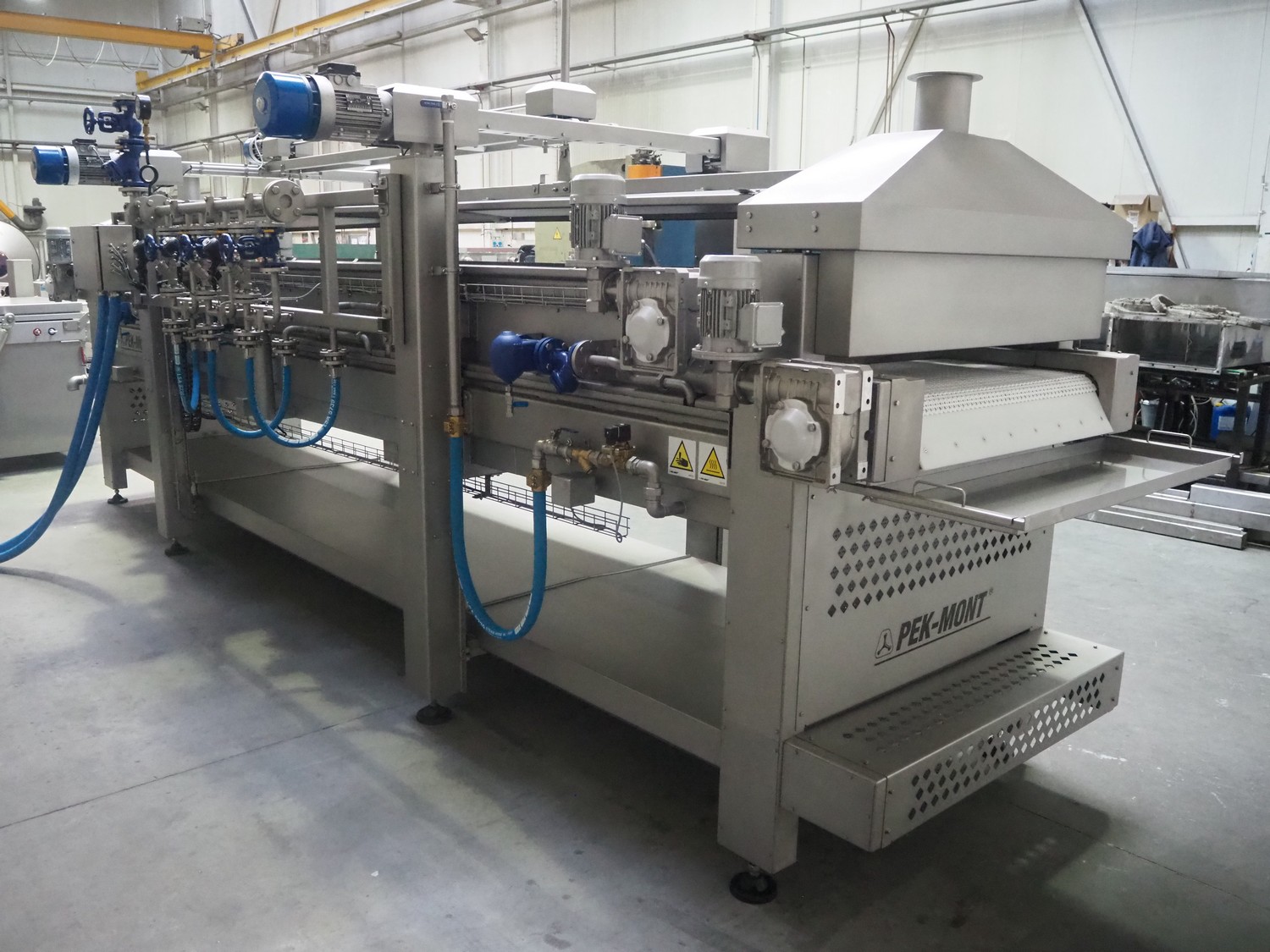 Pek-Mont belt cooker, type: GP-400, number: 11, year of construction: 2019, 400 V, steam heated, plastic mesh belt, belt width: 950 mm, dimensions belt cooker: 6600 mm x 1900 mm x 2550 mm, dimensions switch cabinet: 900 mm x 700 mm x 1880 mm. Never used.