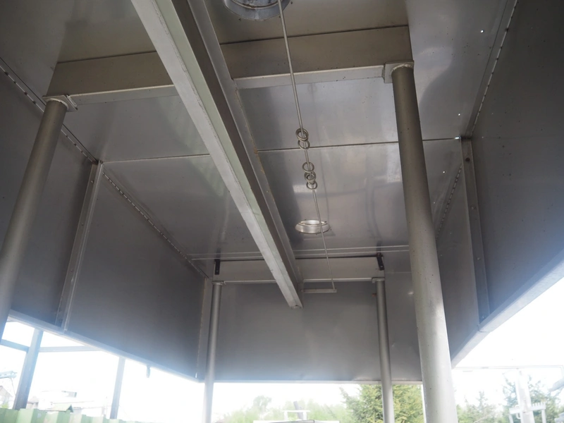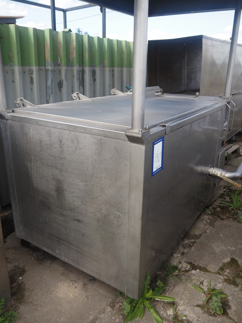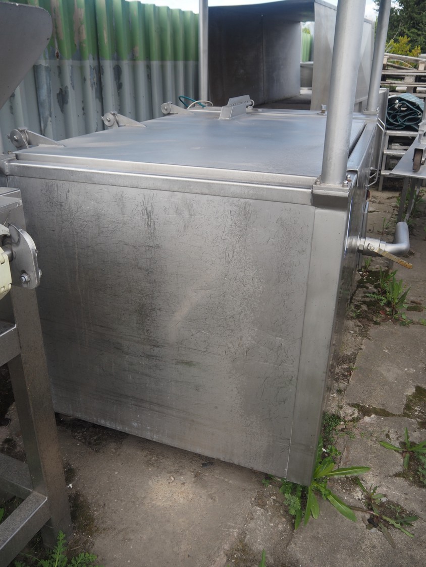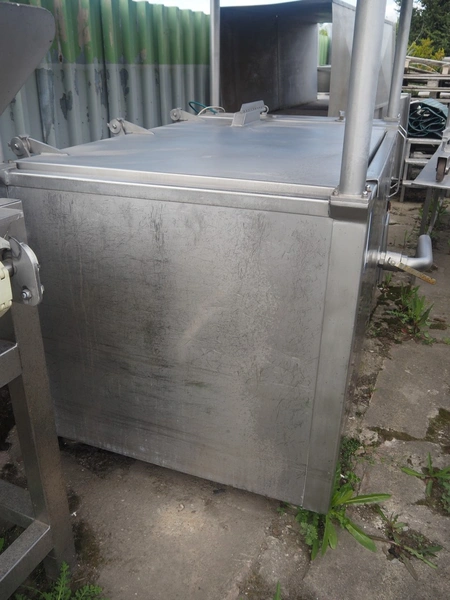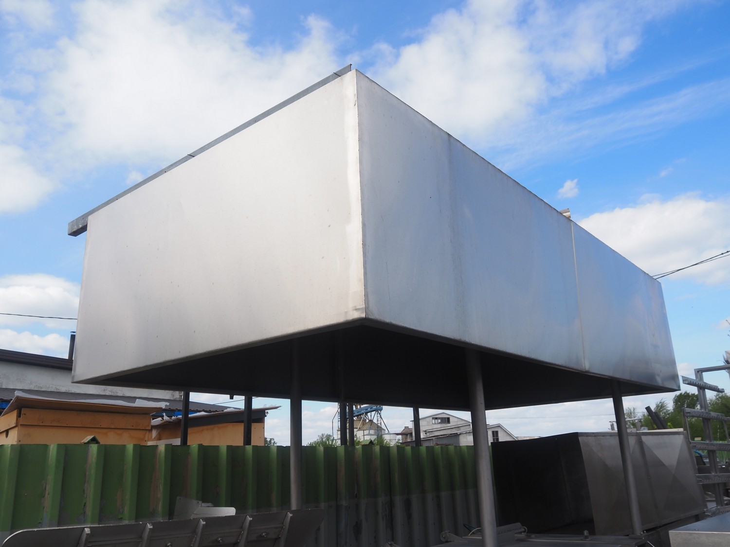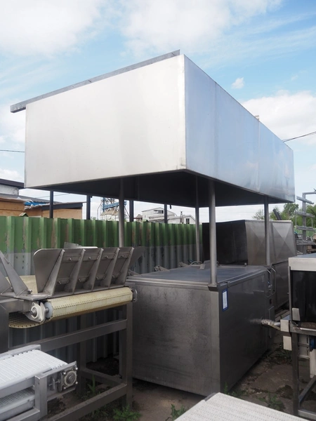 Cooking vessel with hood, dimensions cooking vessel: 2000 mm x 1450 mm x 1200 mm, total dimensions: 3150 mm x 1600 mm x 2800 mm.