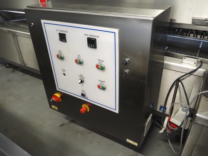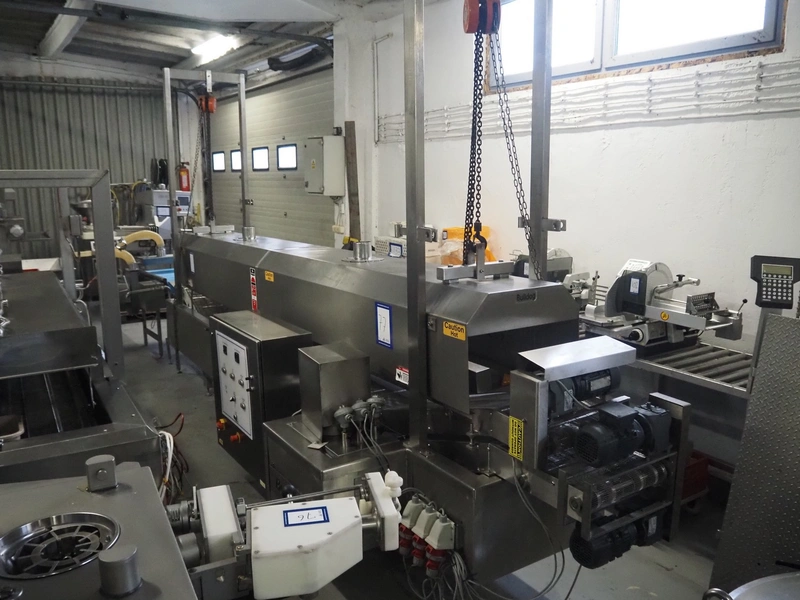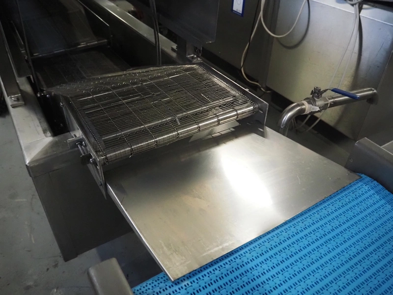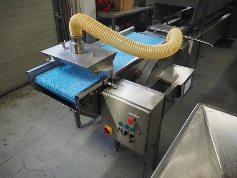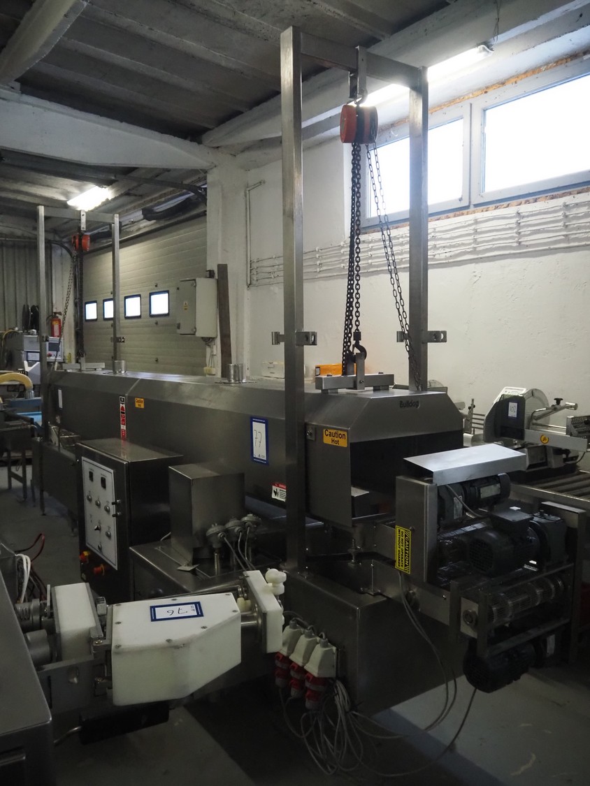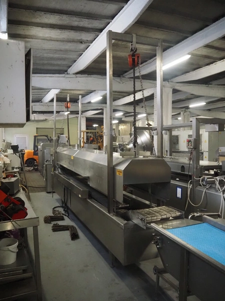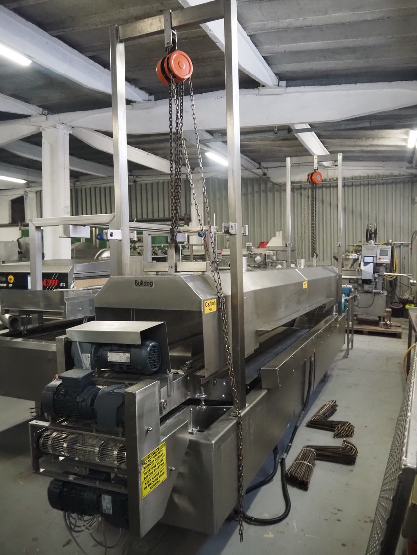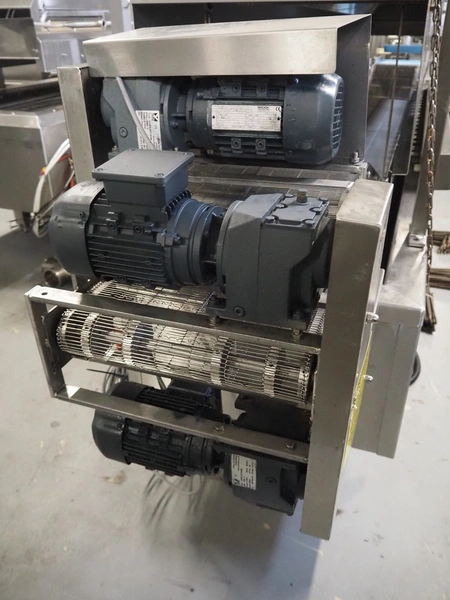 Bulldog frying tunnel, s/s mesh belt, belt width: 400 mm, total dimensions: 5600 mm x 1200 mm x 2800. Including Normit belt with blower, type: CC air-cooling belt, number: 298114, year of construction: 2017, plastic belt, belt width: 495 mm, total dimensions: 1500 mm x 1100 mm x 1300 mm.