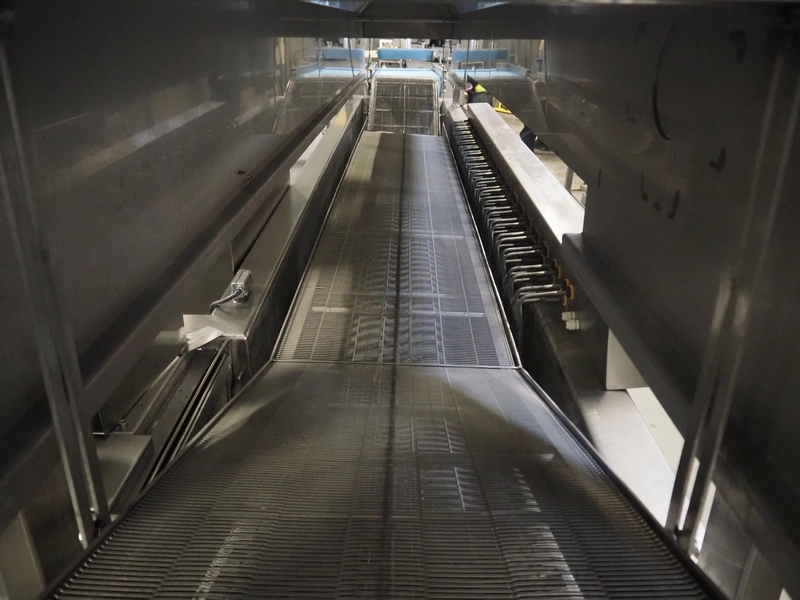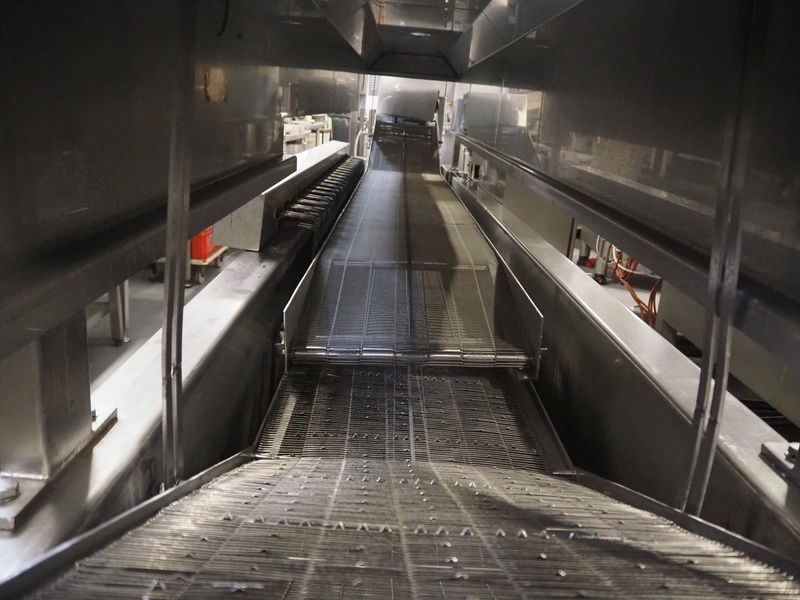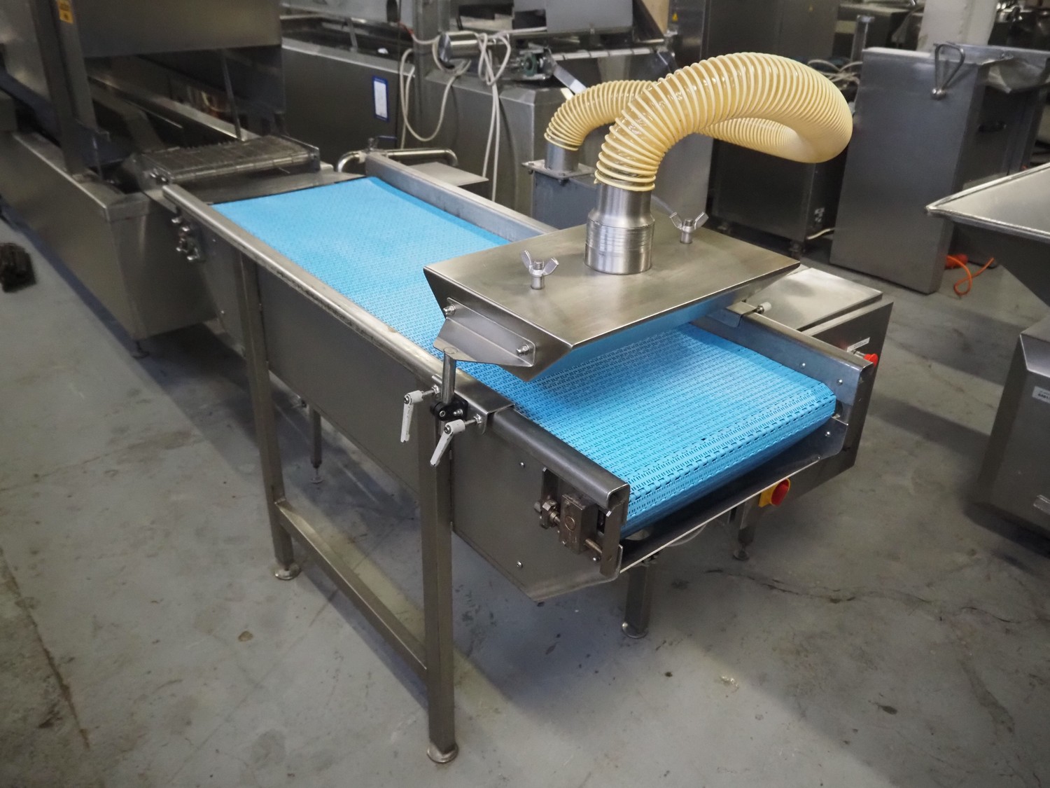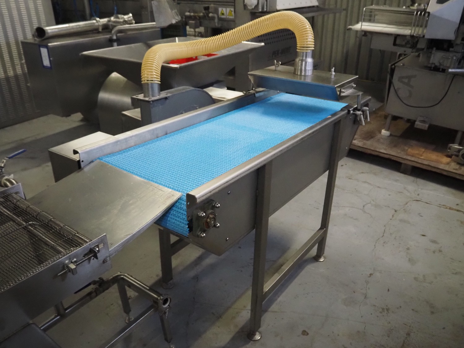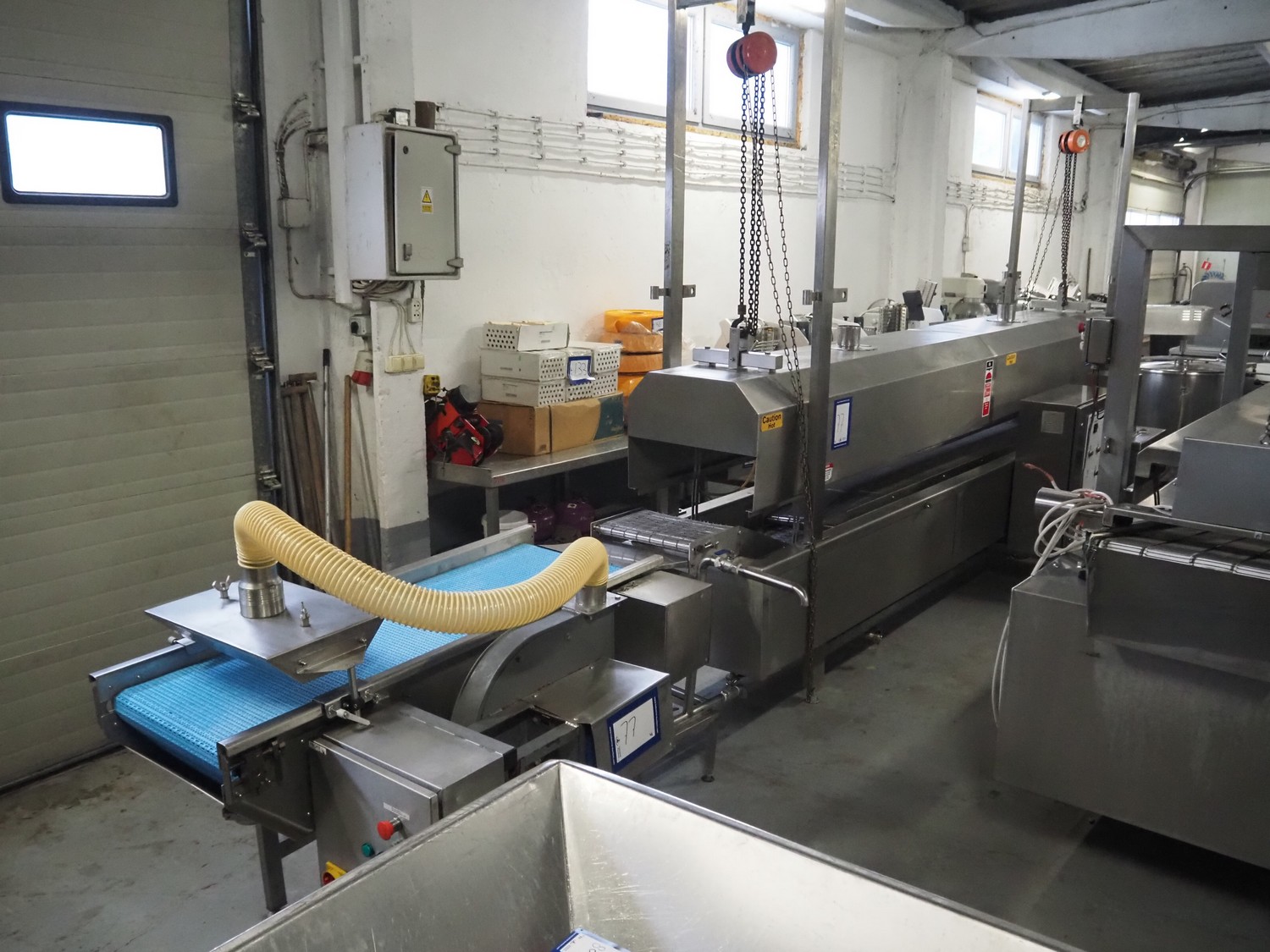 Bulldog frying tunnel, s/s mesh belt, belt width: 400 mm, total dimensions: 5600 mm x 1200 mm x 2800. Including Normit belt with blower, type: CC air-cooling belt, number: 298114, year of construction: 2017, plastic belt, belt width: 495 mm, total dimensions: 1500 mm x 1100 mm x 1300 mm.