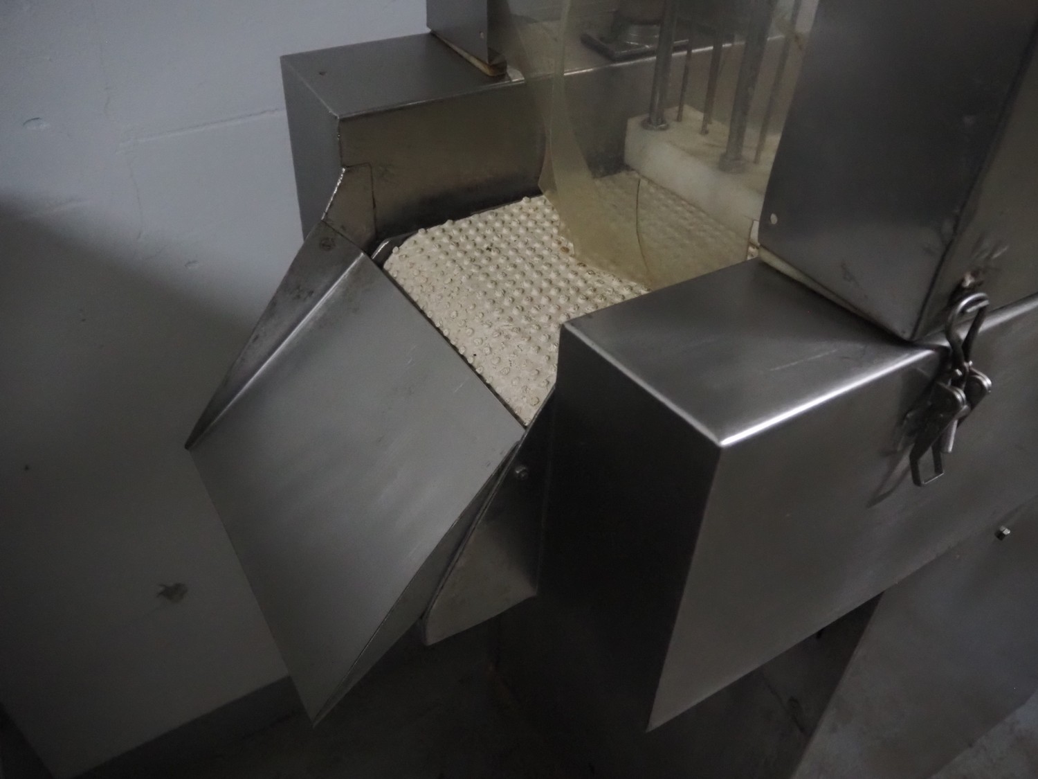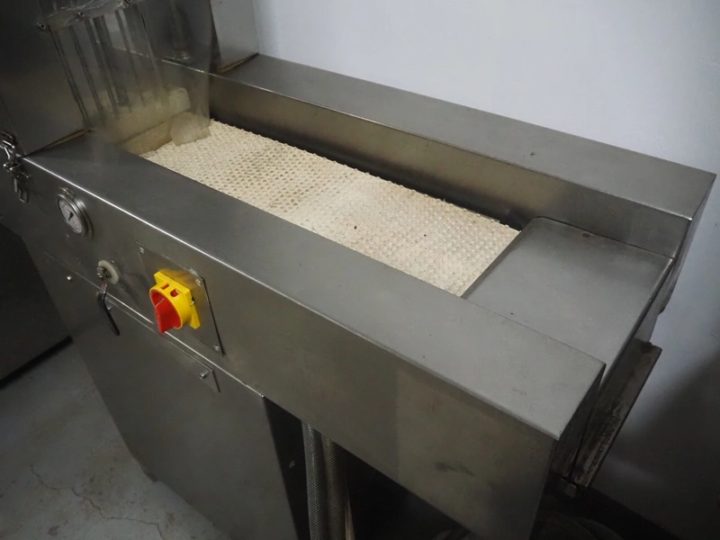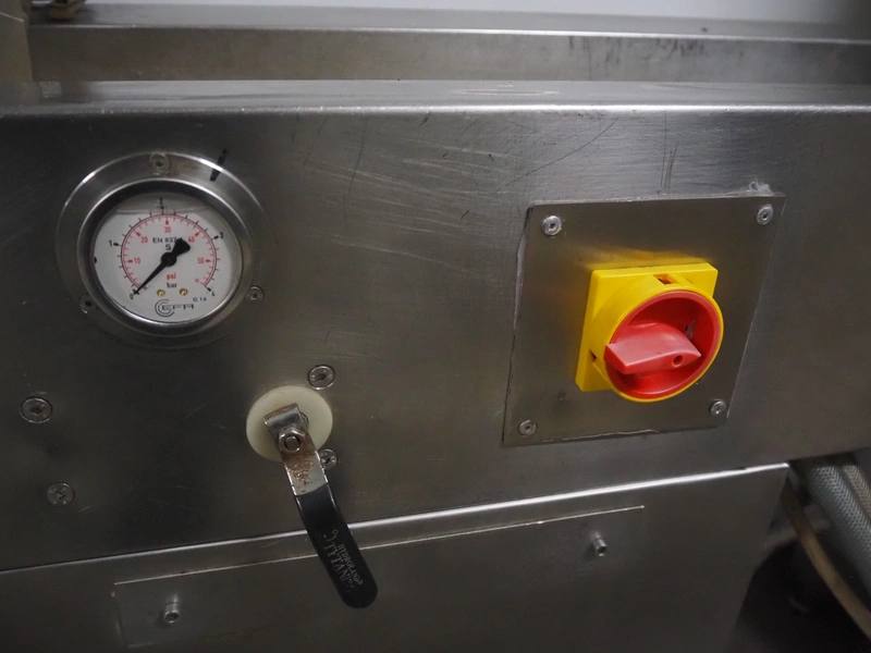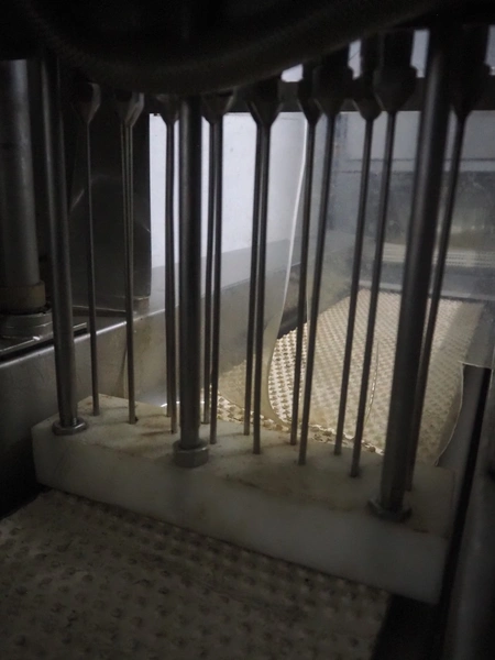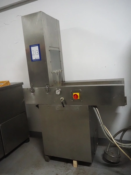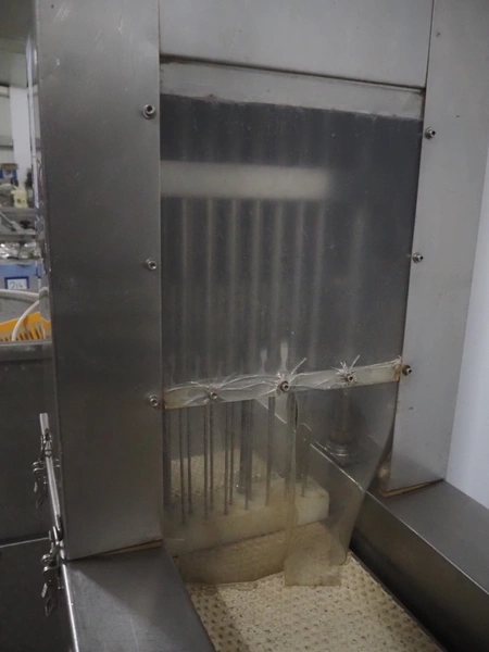 S/s injector, 15 needles, plastic mesh belt, belt width: 220 mm, clearance: 280 mm x 250 mm, dimensions: 1250 mm x 580 mm x 1860 mm.