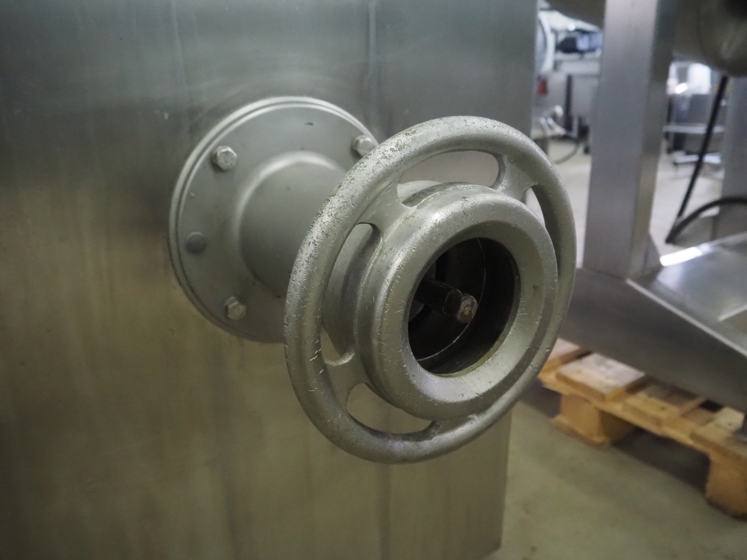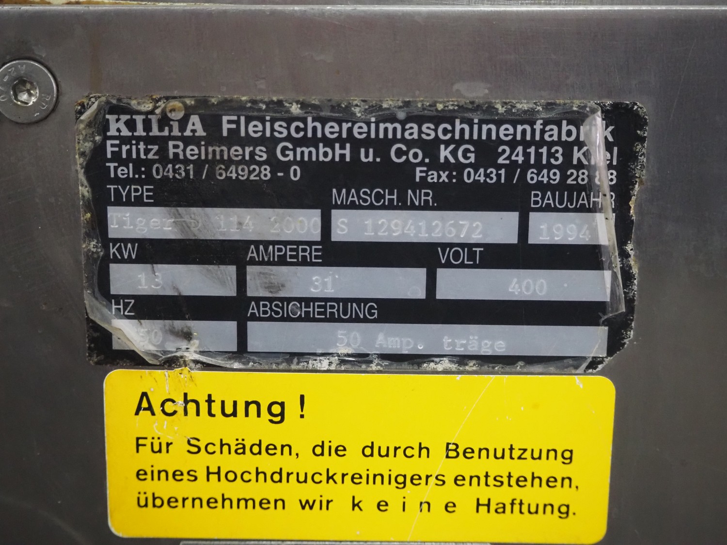 Kilia paddle mixer-grinder, type: Tiger 114 2000, machine number: S 129412672, year of construction: 1994, 400 V, 50 Hz, 31 A, 13 kW, maximum plate diameter: 114 mm, total dimensions: 1350 mm x 770 mm x 1320 mm. Without knives and plates.
