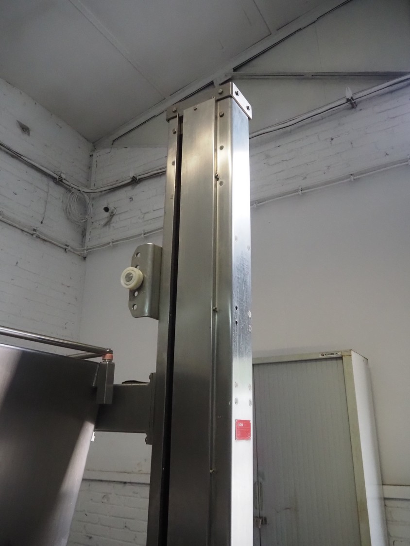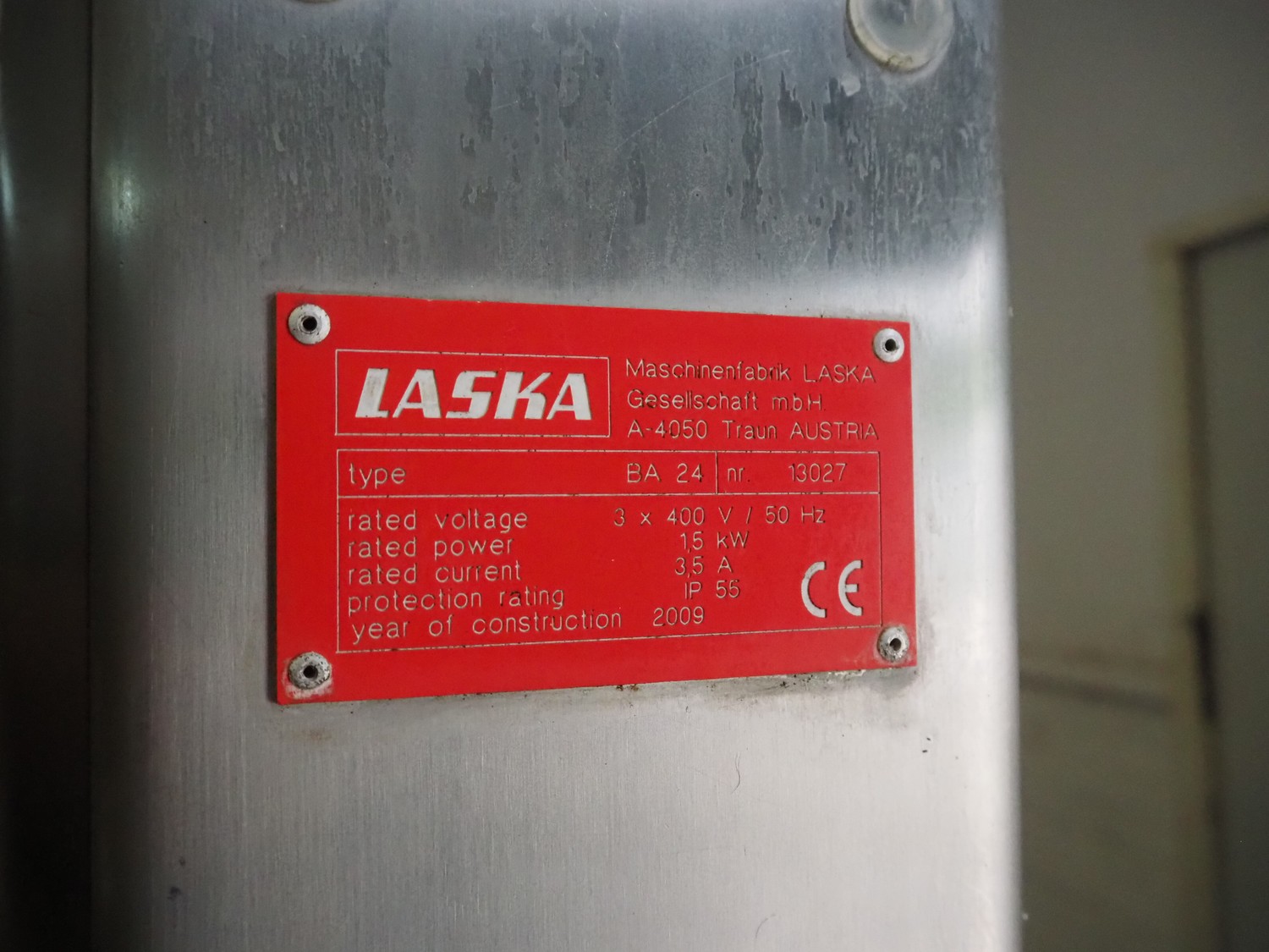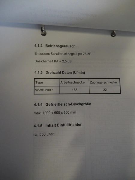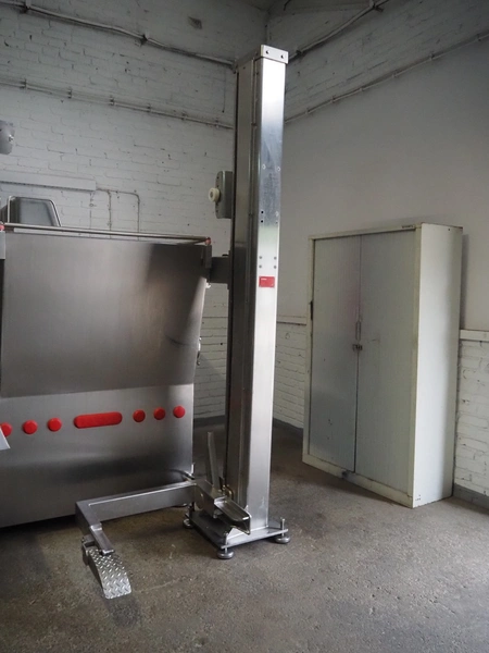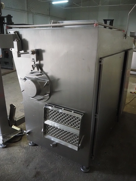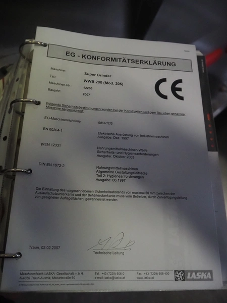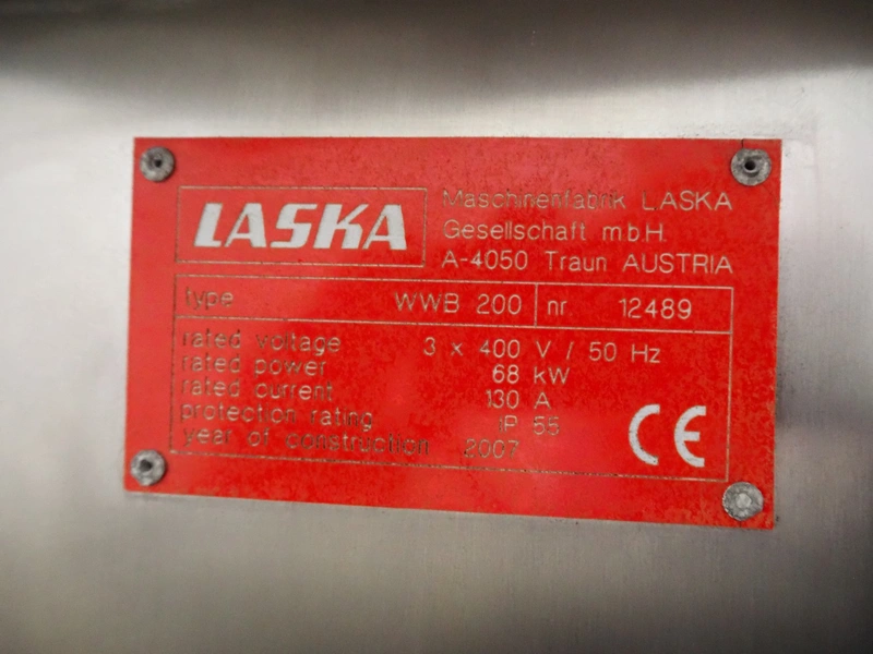 Laska Maschinenfabrik frozen block grinder with lifter for 200 liter meat bins, type: WWB 200, number: 12489, year of construction: 2007, 400 V, 3 Ph, 50 Hz, 130 A, 68 kW, 55 Ip, plate diameter: 200 mm, Laska Maschinenfabrik lifter, type: BA 24, number: 13027, year of construction: 2009, 400 V, 3 Ph, 50 Hz, 3.5 A, 1.5 kW, 55 Ip, lifting height: 2100 mm, total dimensions: 2500 mm x 2100 mm x 2850 mm.