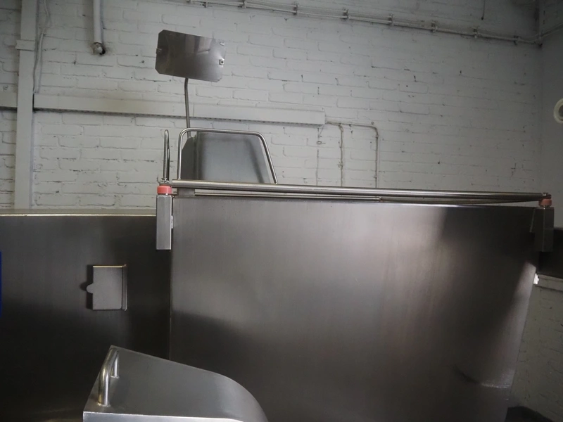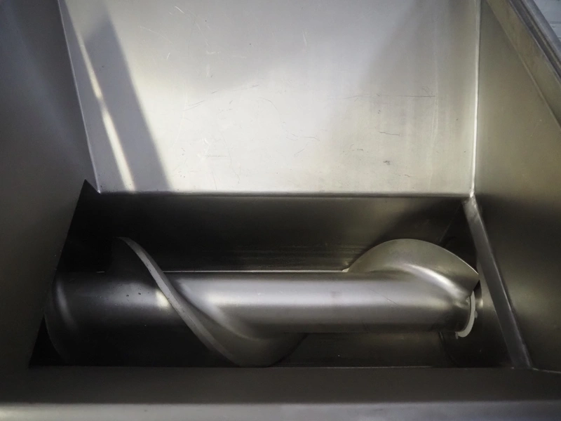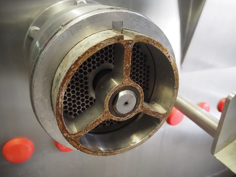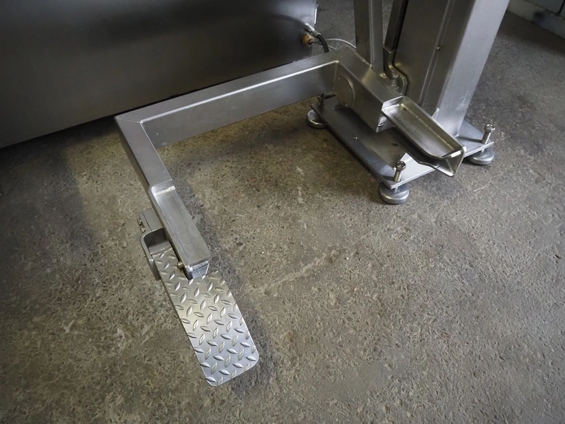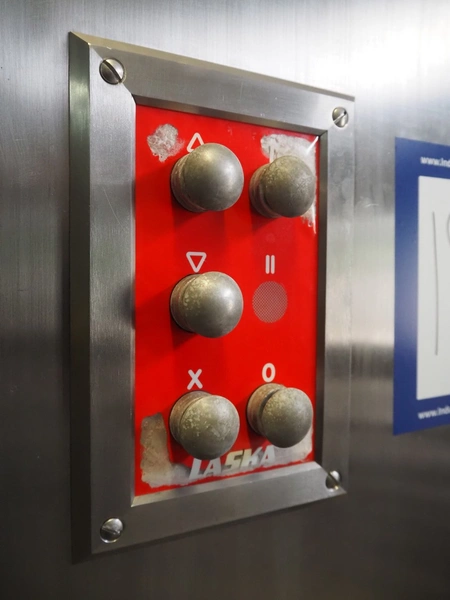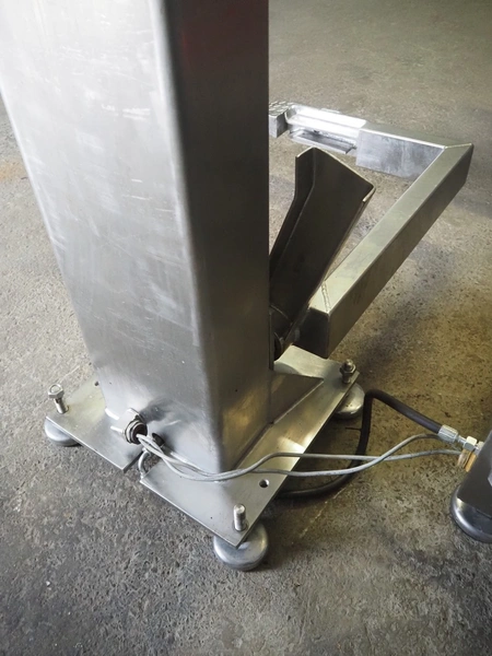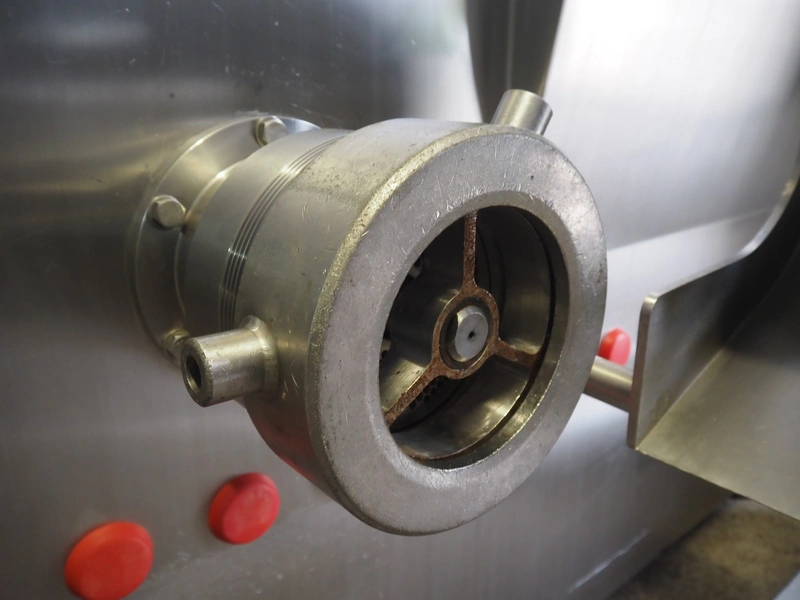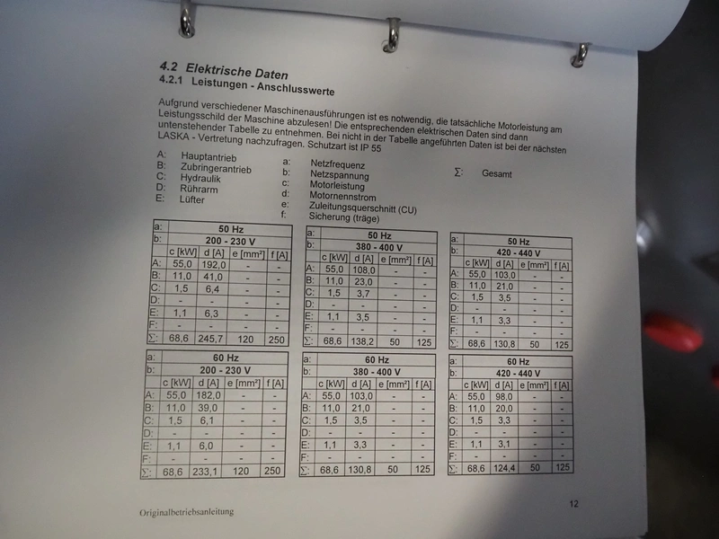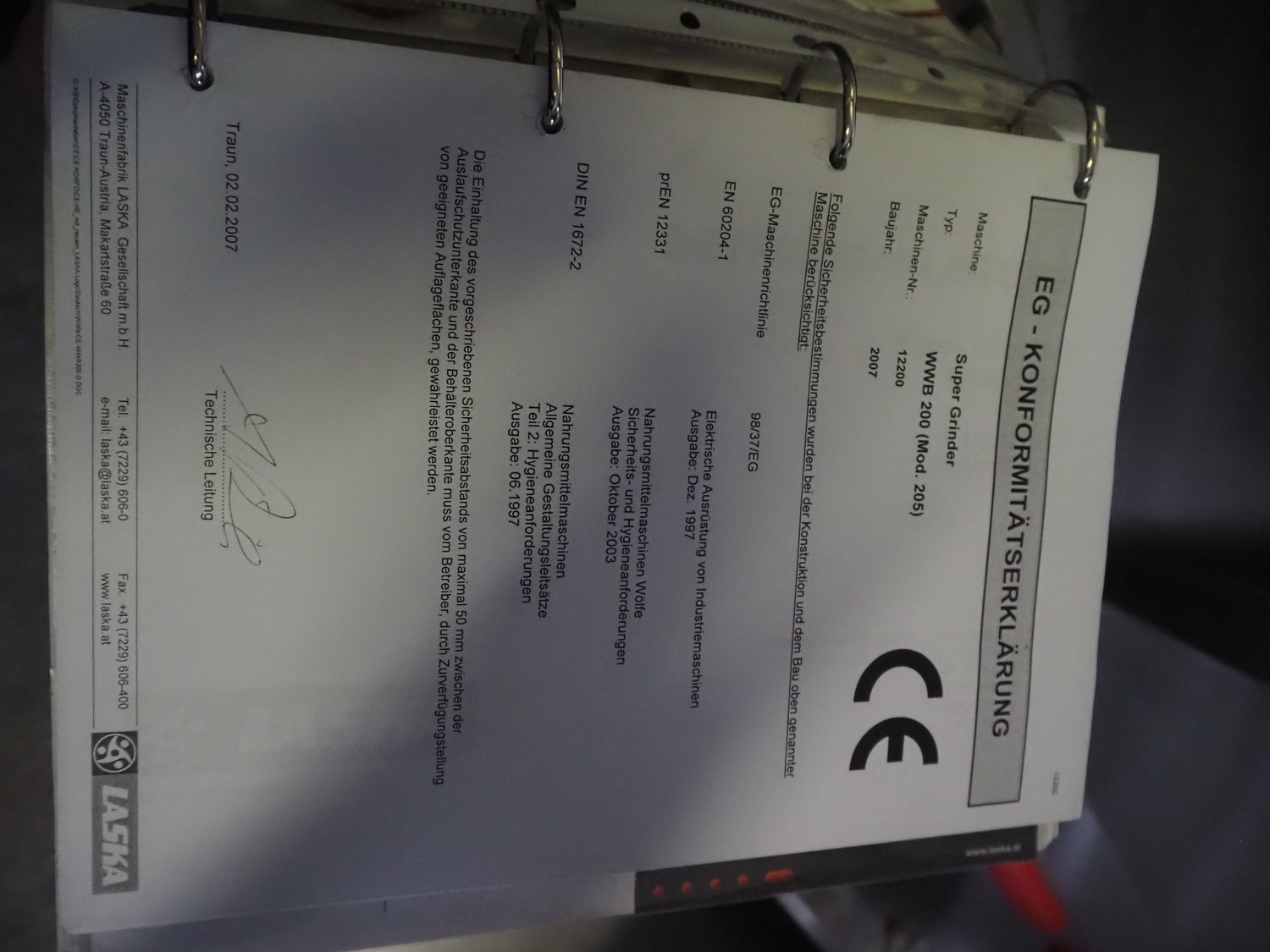 Laska Maschinenfabrik frozen block grinder with lifter for 200 liter meat bins, type: WWB 200, number: 12489, year of construction: 2007, 400 V, 3 Ph, 50 Hz, 130 A, 68 kW, 55 Ip, plate diameter: 200 mm, Laska Maschinenfabrik lifter, type: BA 24, number: 13027, year of construction: 2009, 400 V, 3 Ph, 50 Hz, 3.5 A, 1.5 kW, 55 Ip, lifting height: 2100 mm, total dimensions: 2500 mm x 2100 mm x 2850 mm.