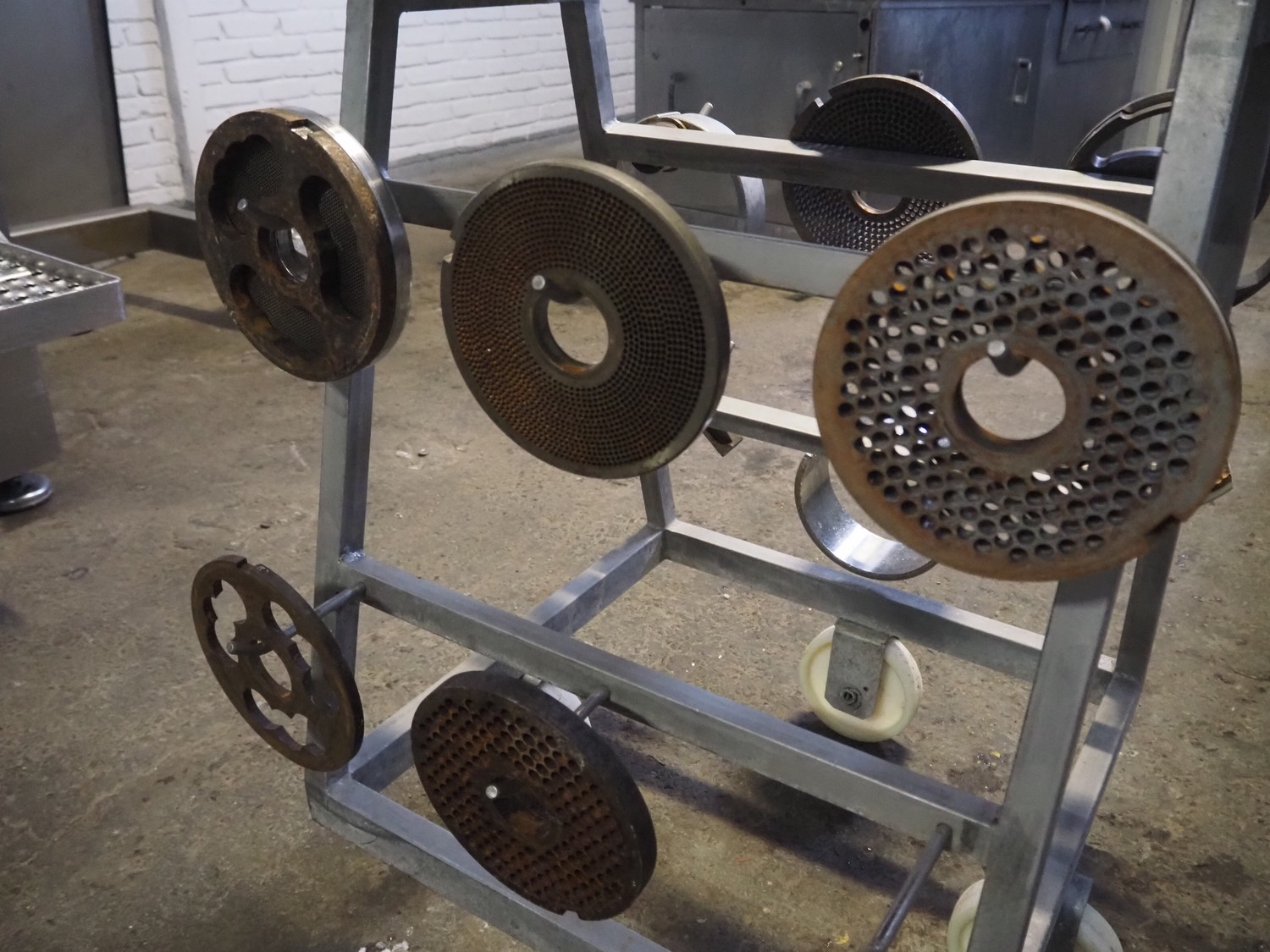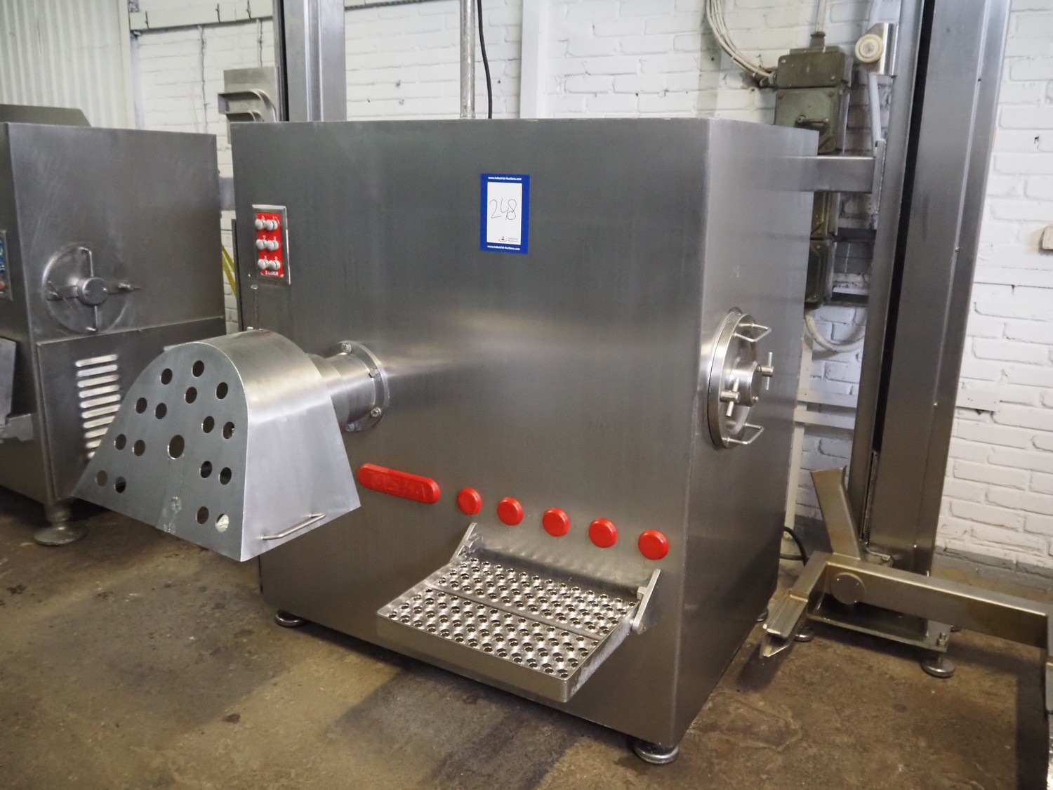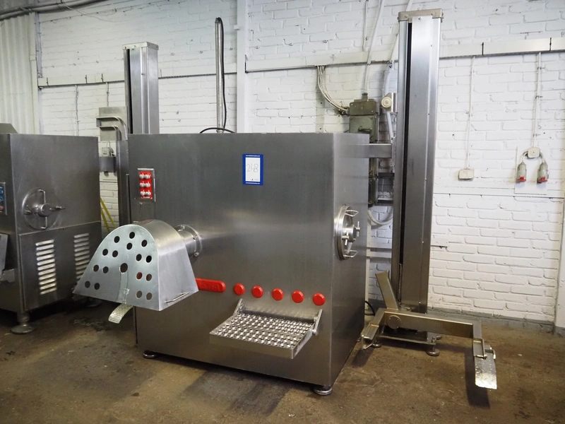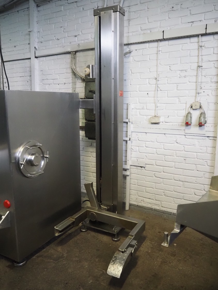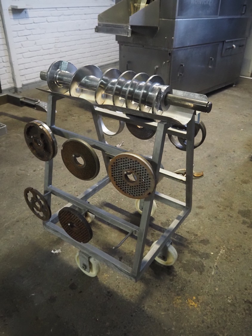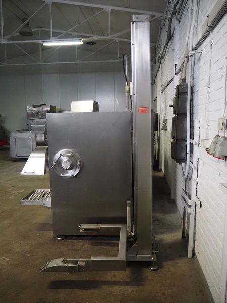 Laska Maschinenfabrik grinder with lifter for 200 liter meat bins, type: WW 200 2, number: M 6909, year of construction: 2000, 400 V, 3 Ph, 50 Hz, 85 A, 43 kW, plate diameter: 200, total dimensions: 2500 mm x 2200 mm x 2650 mm. Inlcuding tool trolley with worm, knives and plates, dimensions: 800 mm x 850 mm x 1000 mm.