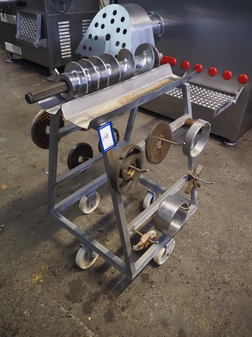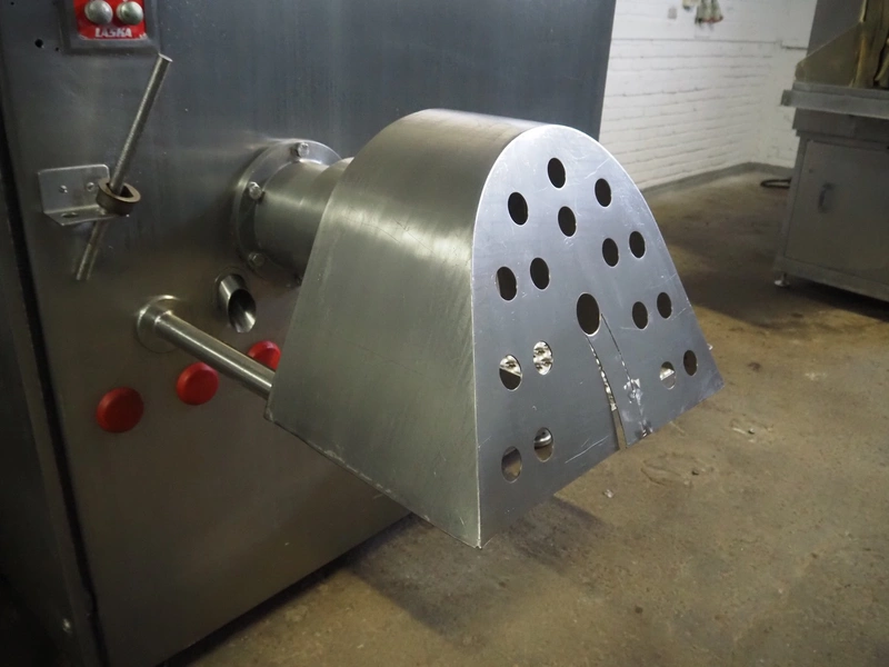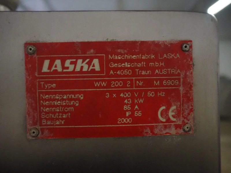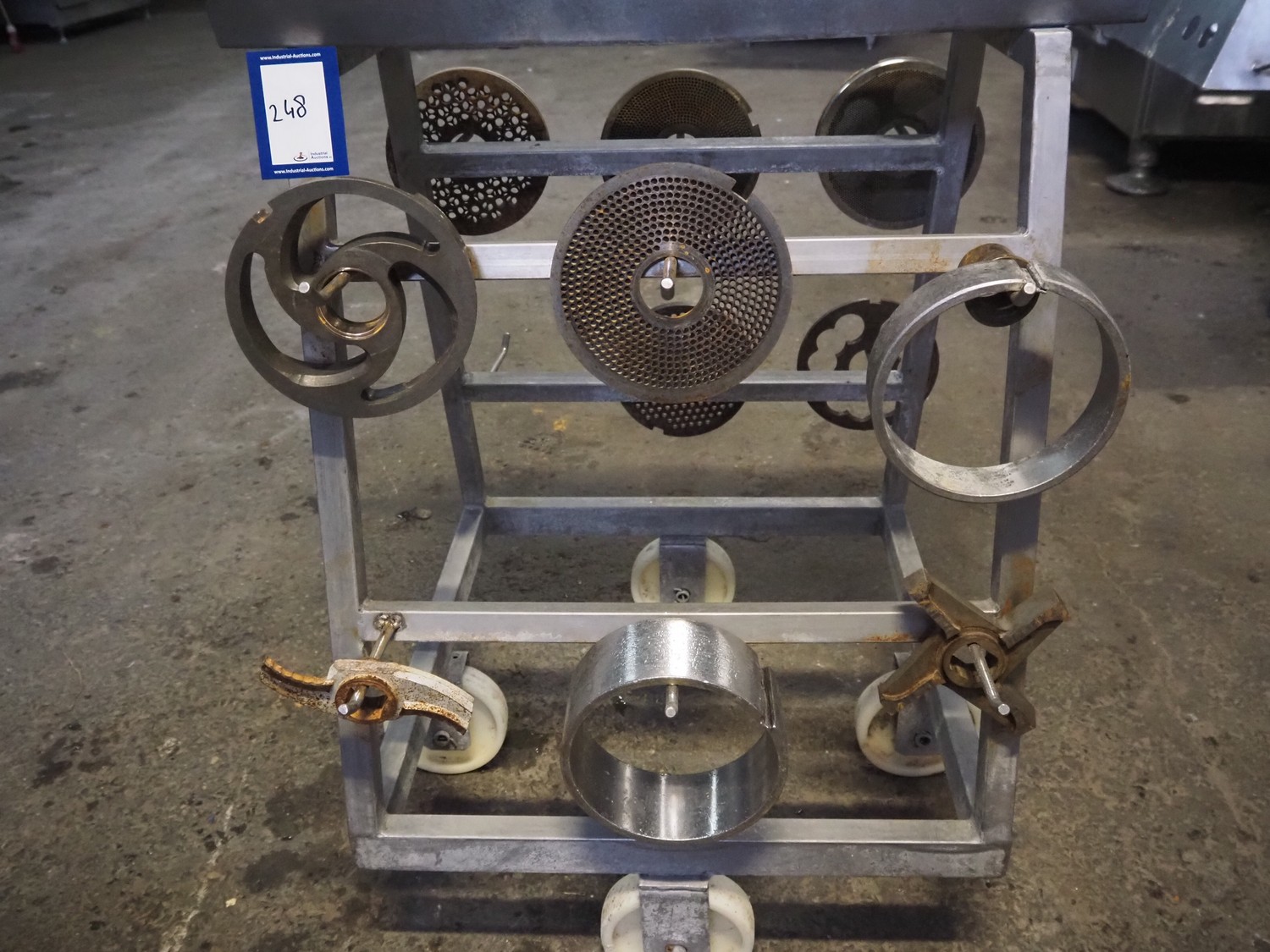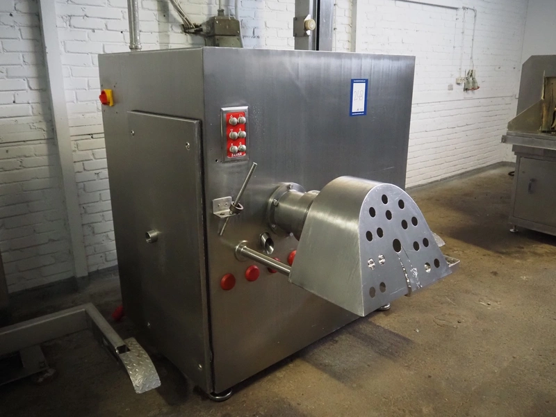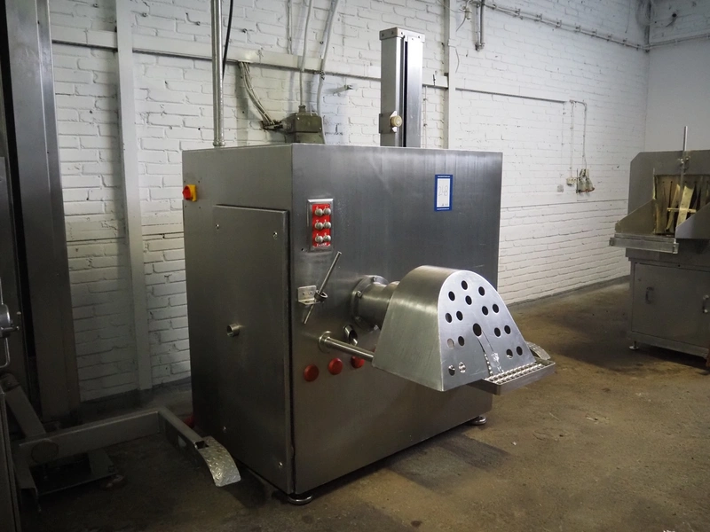 Laska Maschinenfabrik grinder with lifter for 200 liter meat bins, type: WW 200 2, number: M 6909, year of construction: 2000, 400 V, 3 Ph, 50 Hz, 85 A, 43 kW, plate diameter: 200, total dimensions: 2500 mm x 2200 mm x 2650 mm. Inlcuding tool trolley with worm, knives and plates, dimensions: 800 mm x 850 mm x 1000 mm.