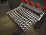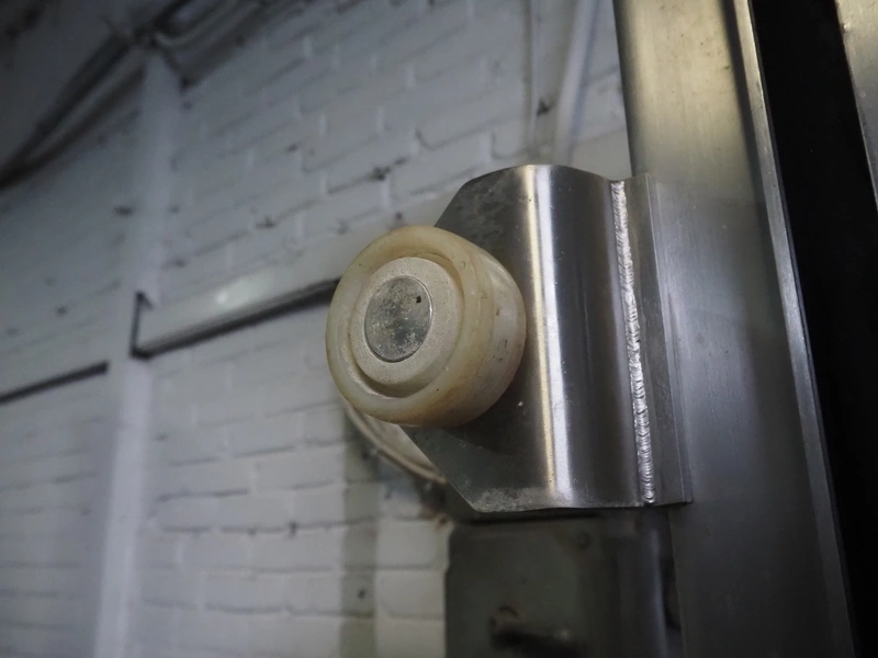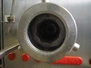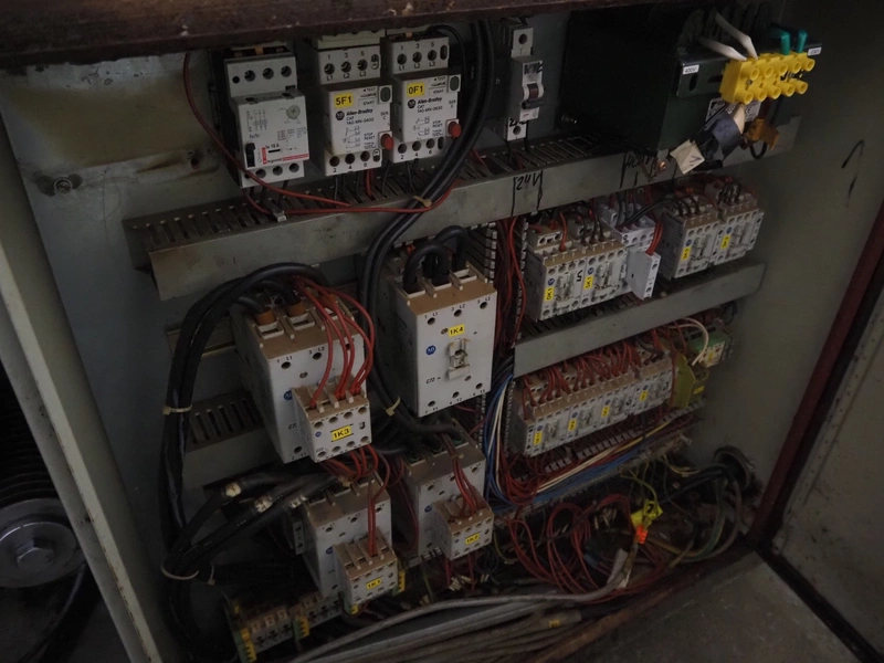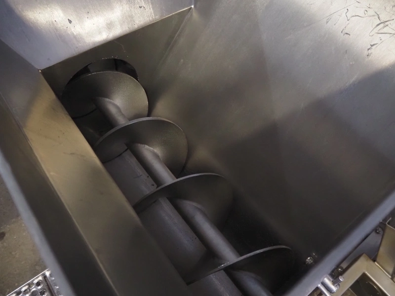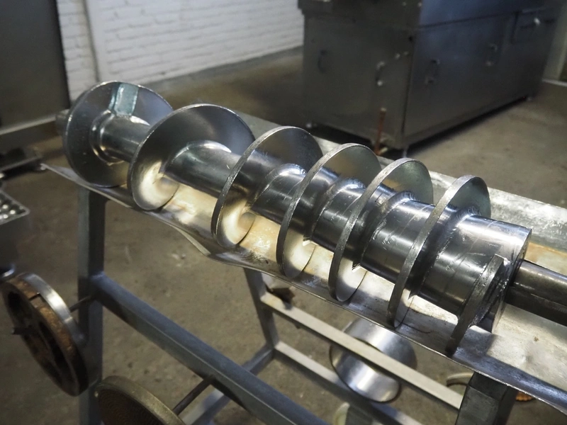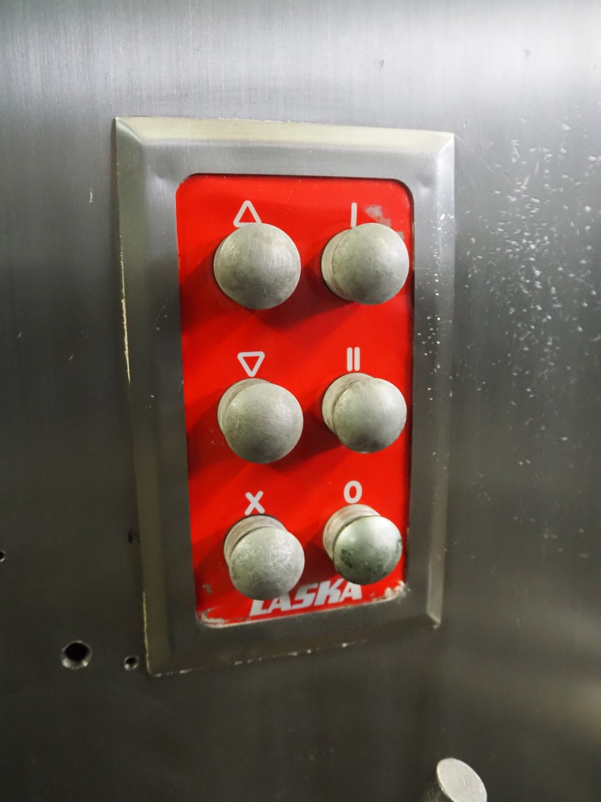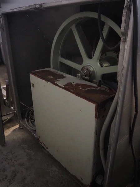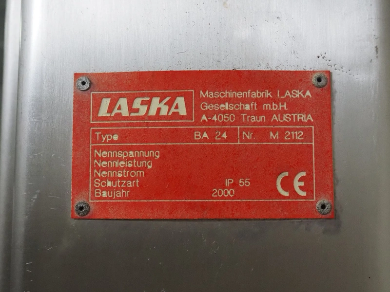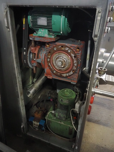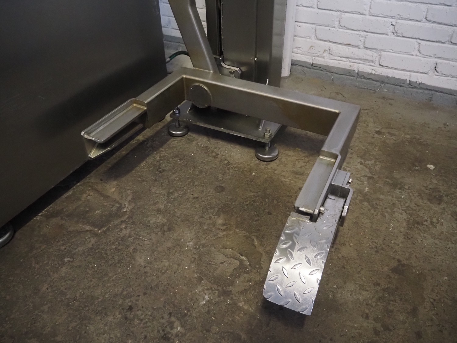 Laska Maschinenfabrik grinder with lifter for 200 liter meat bins, type: WW 200 2, number: M 6909, year of construction: 2000, 400 V, 3 Ph, 50 Hz, 85 A, 43 kW, plate diameter: 200, total dimensions: 2500 mm x 2200 mm x 2650 mm. Inlcuding tool trolley with worm, knives and plates, dimensions: 800 mm x 850 mm x 1000 mm.