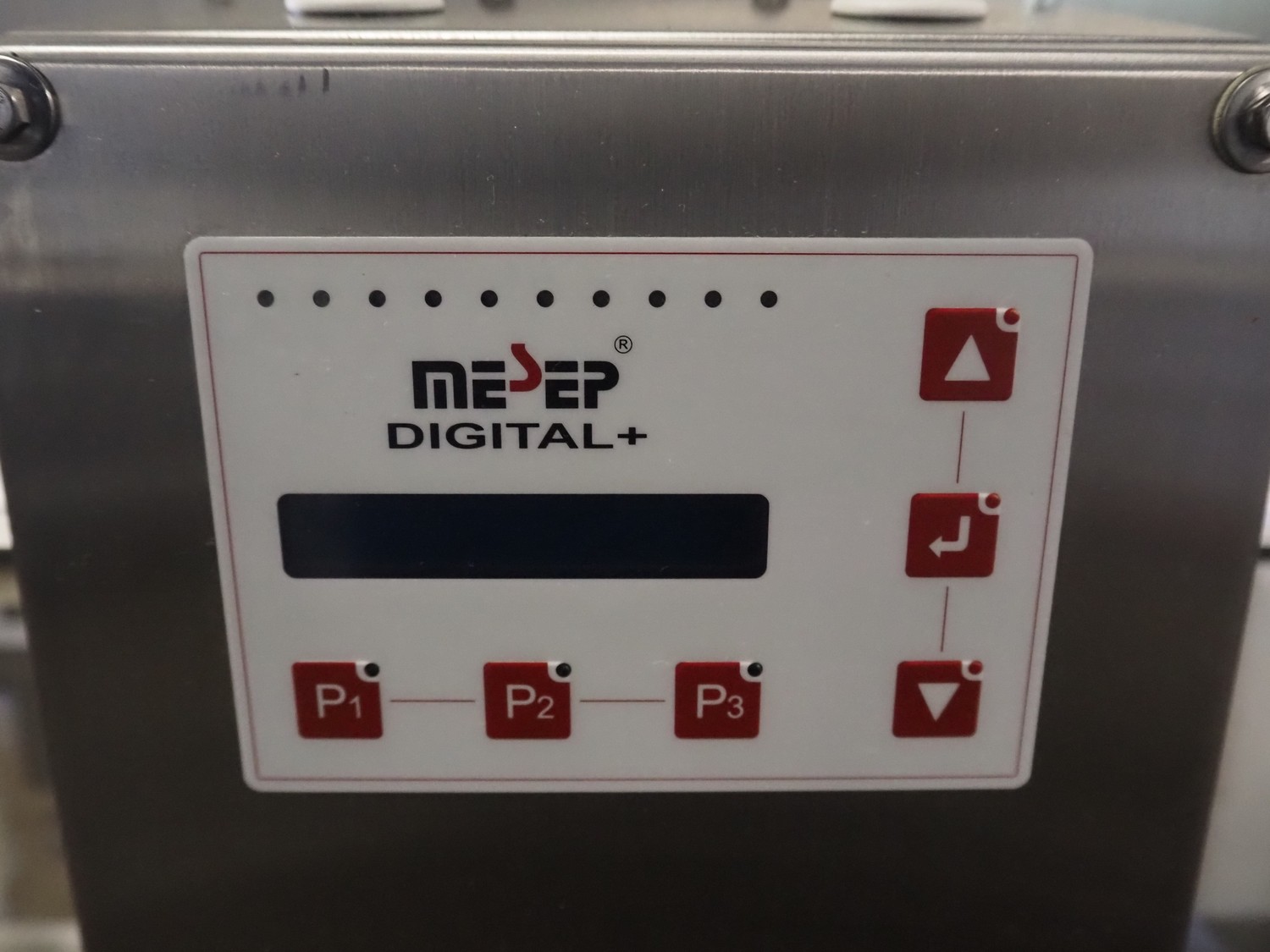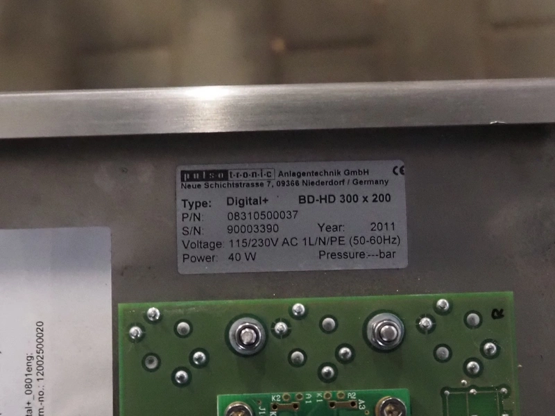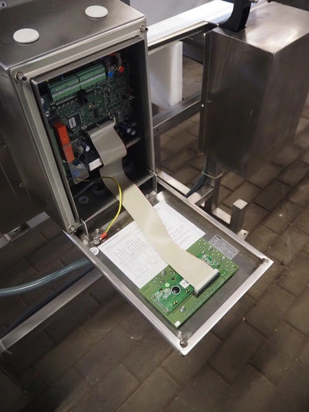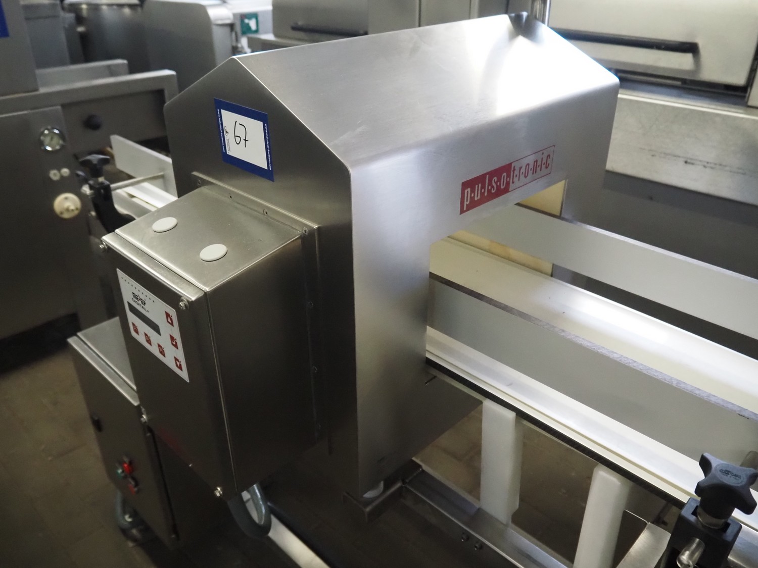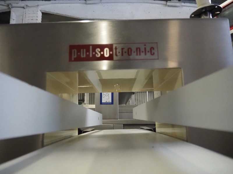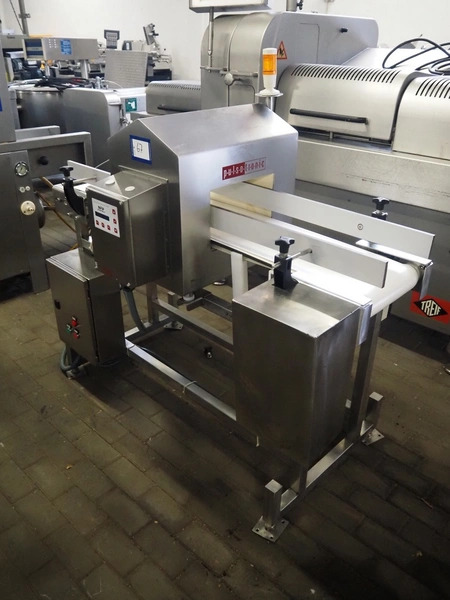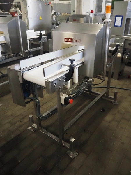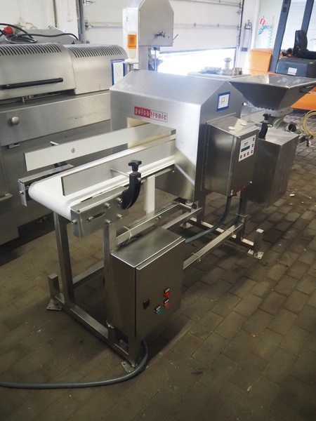 Pulsotronic metal detector, type: Digital+, serial number: 90003390, year of construction: 2011, 115/230 V, 1 Ph, 50/60 Hz, 40 W, clearance: 300 mm x 160 mm, plastic belt, belt width: 250 mm, total dimenisons: 1540 mm x 800 mm x 1300 mm.