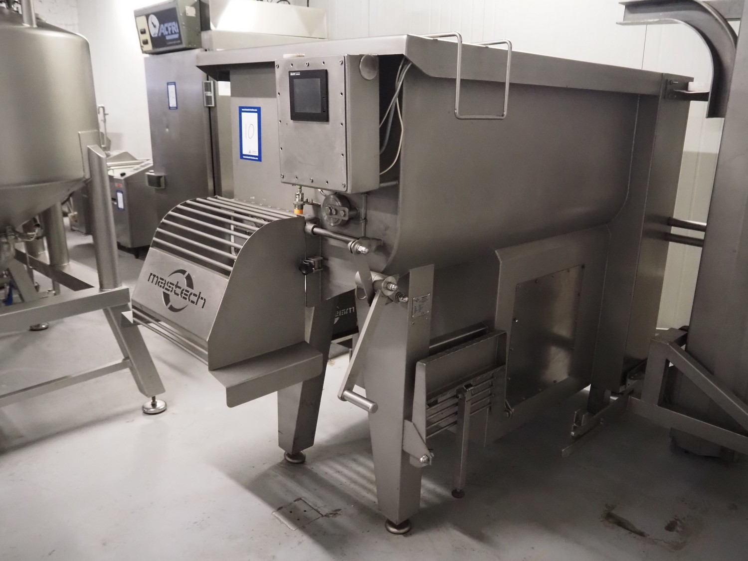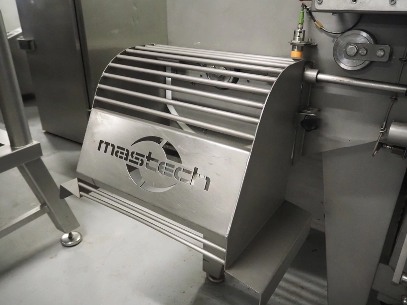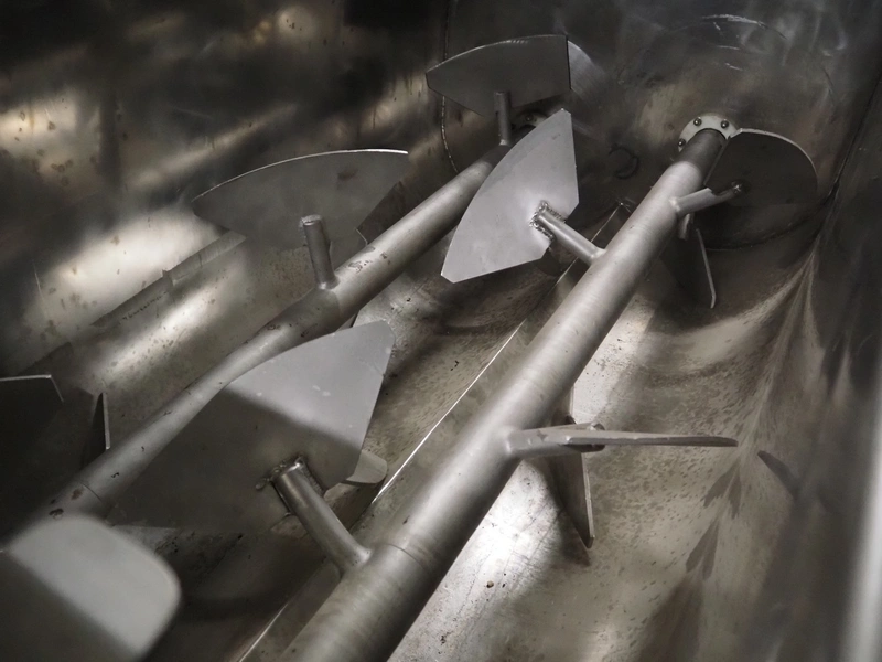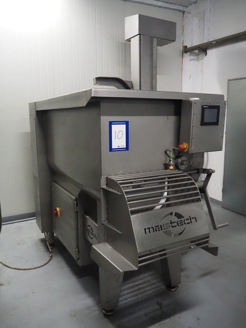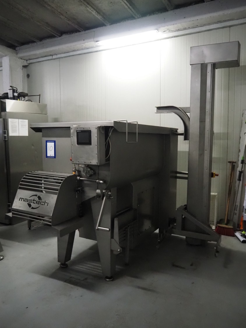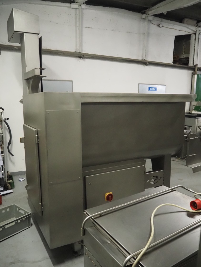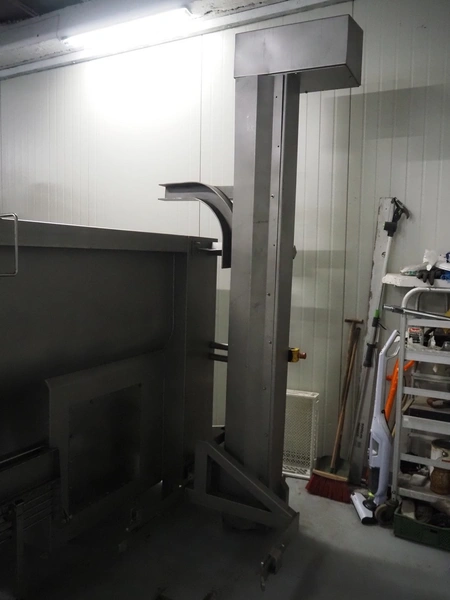 Mastech double shaft paddle mixer with lifter for 200 liter meat bins, type: MS-950, number: 001, year of construction: 2011, 400 V, weight: 1560 kg, volume: 950 liter, length paddles: (2x) 1500 mm, total dimensions: 2060 mm x 2100 mm x 2860 mm.