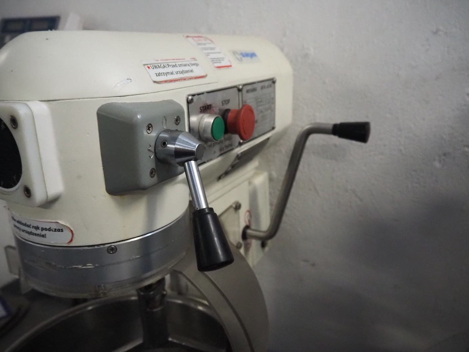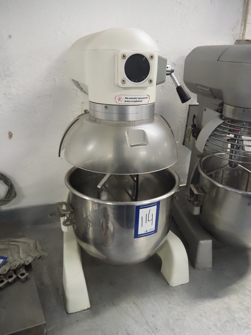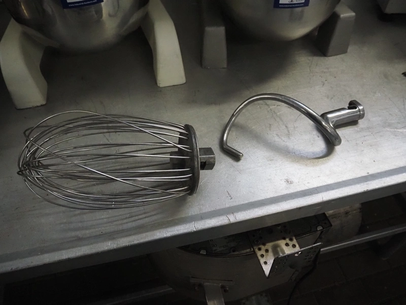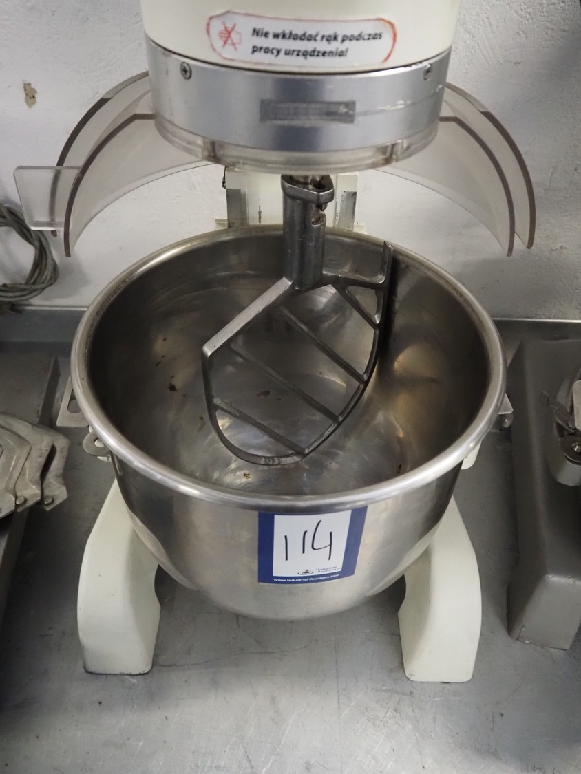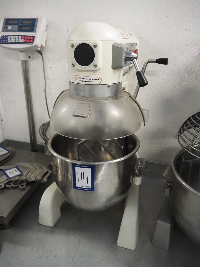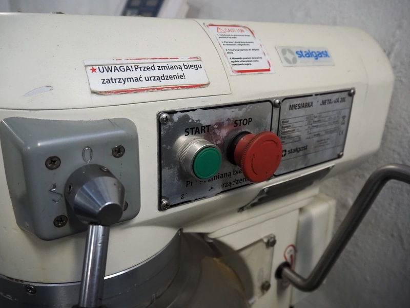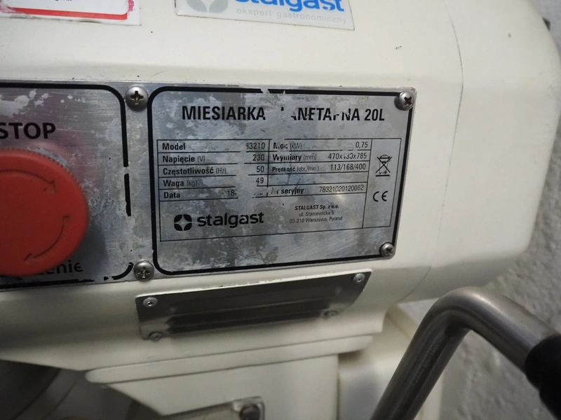 Stalgast SP. Z.o.o. table model mixer, model: 783210, serial number: 78321020120062, 230 V, 50 Hz, 0.75 kW, 49 kg, volume: 20 liter, dimensions: 450 mm x 550 mm x 780 mm. Including whisk, paddle and spiral.