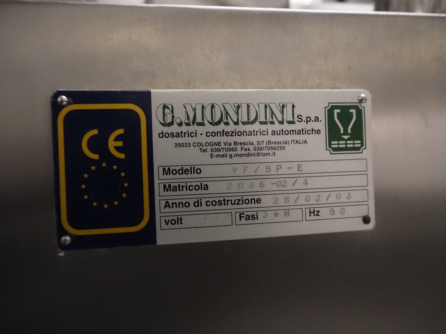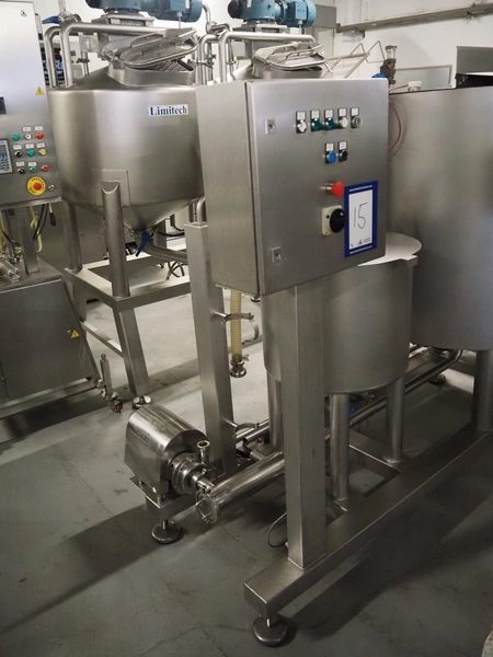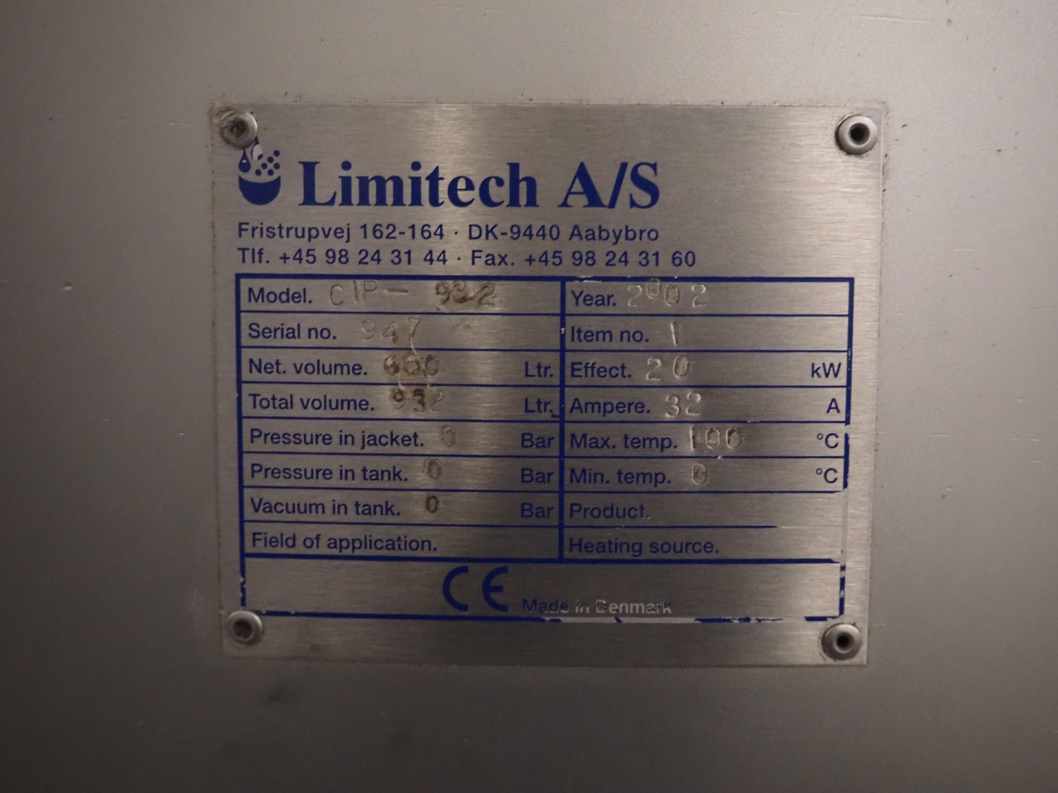 Limitech A/S cip unit, model: CIP-932, serial number: 947, year of construction: 2002, 32 A, 20 kW, netto volume: 660 liter, dimensions: 2400 mm x 1100 mm x 1950 mm. G.Mondini S.p.a. depositor, model: VF/SP-E, number: 2046-02/4, year of construction: 28/02/03, 400 V, 3 Ph, 50 Hz, dimensions: 1200 mmn x 750 mm x 2230 mm.