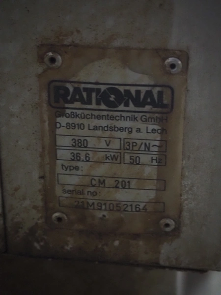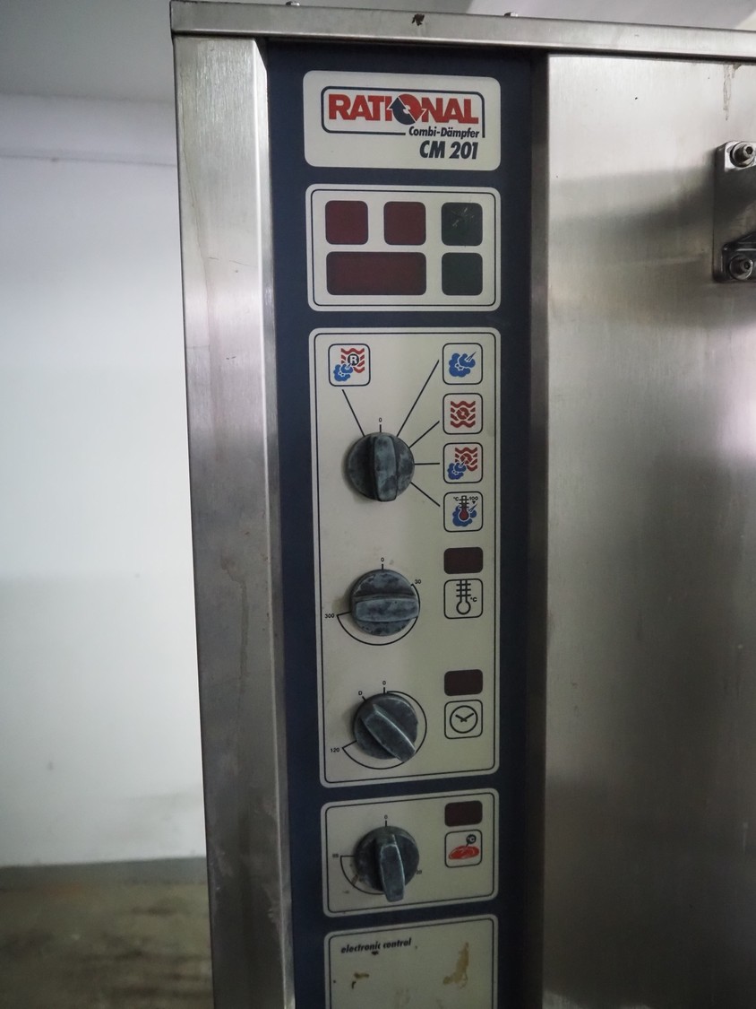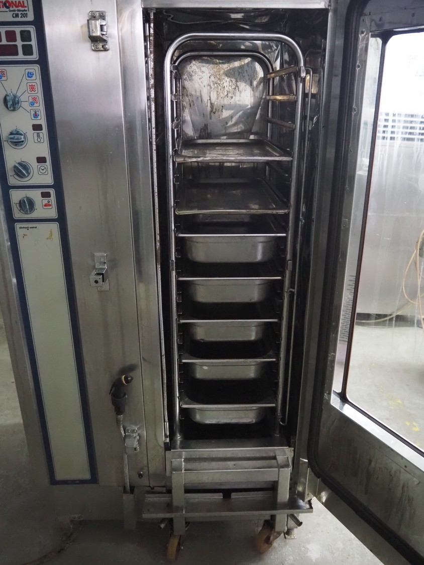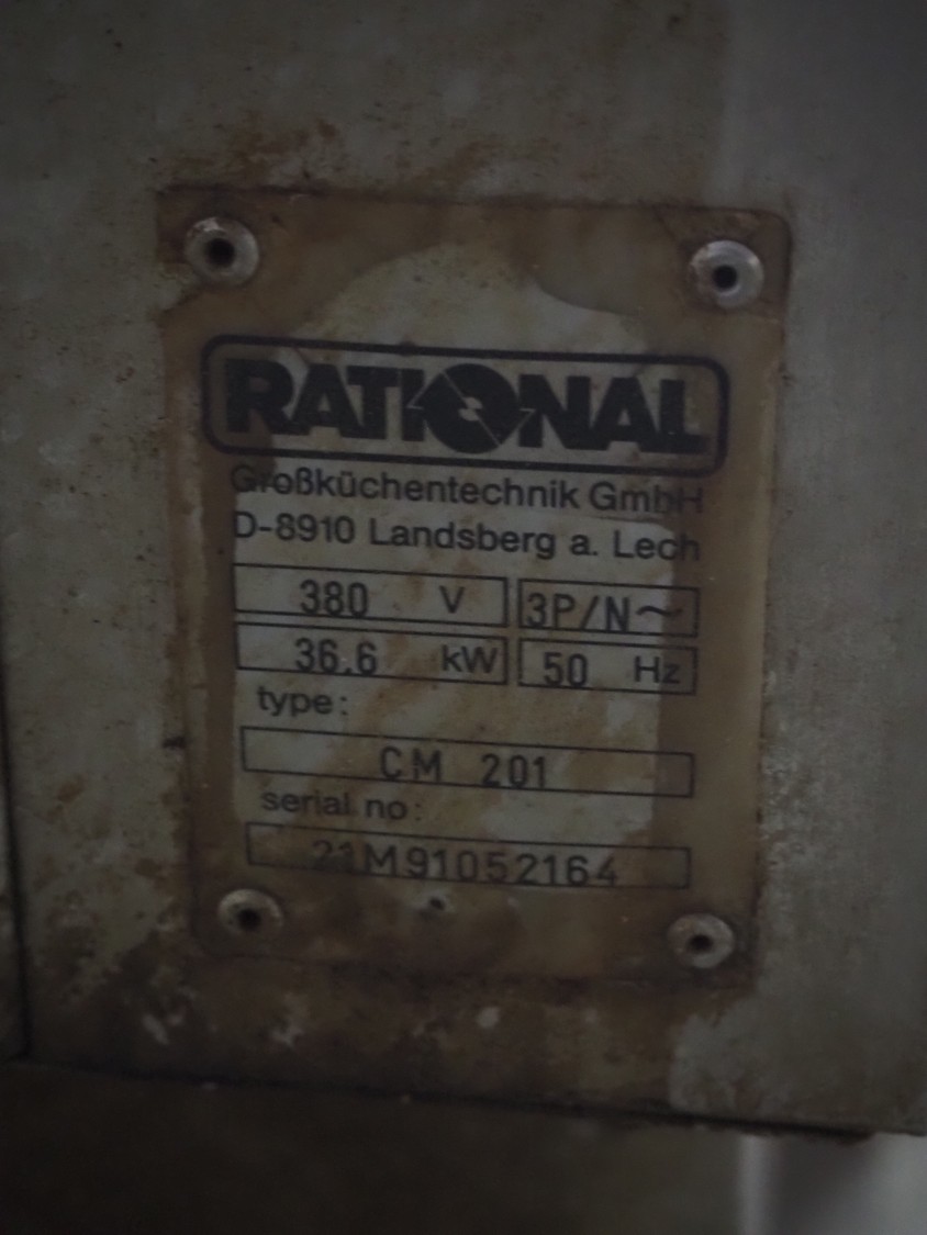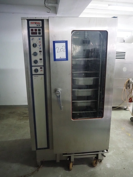 Rational combi steamer, model: CM 201, serial number: 21M91052164, 380 V, 3 Ph, 50 Hz, 36.6 kW, s/s trolley with 16 floors, floor dimensions: 530 mm x 330 mm, total dimensions: 950 mm x 950 mm x 1800 mm. Including 7 trays.