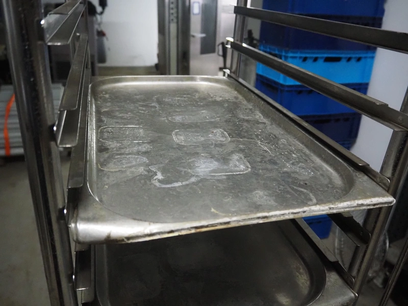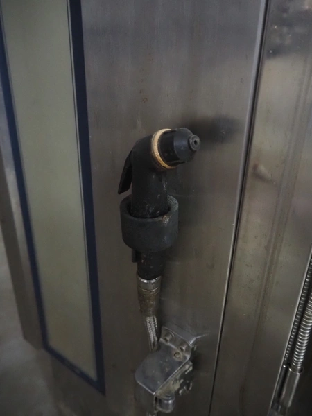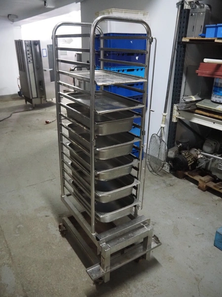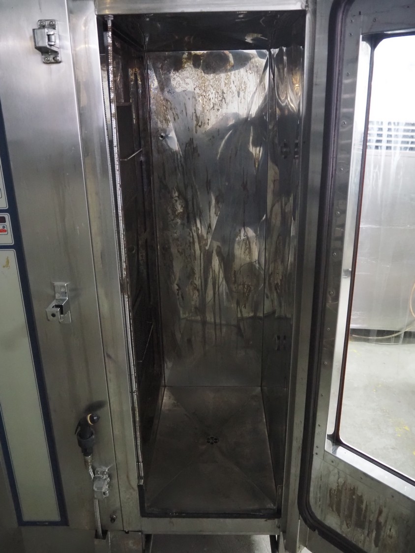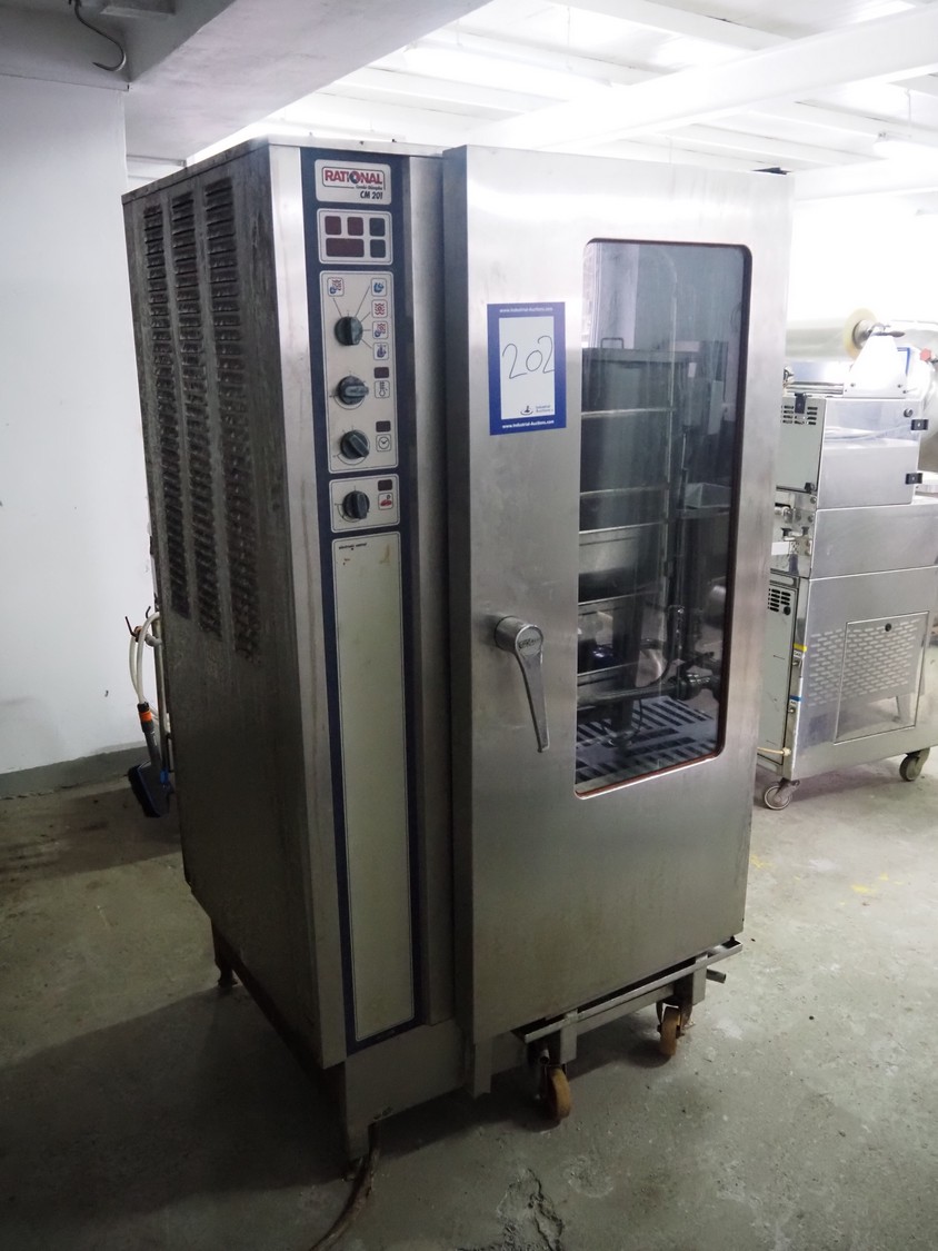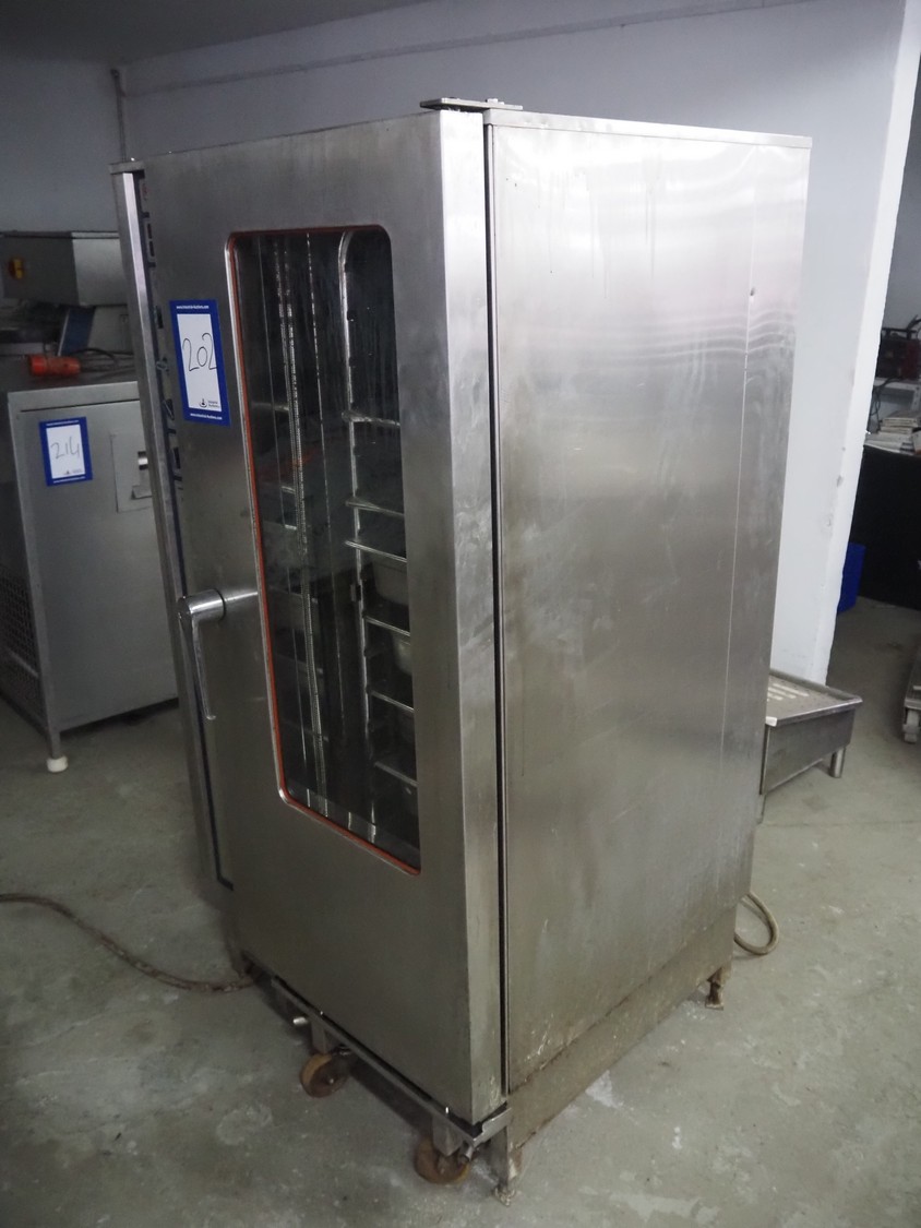 Rational combi steamer, model: CM 201, serial number: 21M91052164, 380 V, 3 Ph, 50 Hz, 36.6 kW, s/s trolley with 16 floors, floor dimensions: 530 mm x 330 mm, total dimensions: 950 mm x 950 mm x 1800 mm. Including 7 trays.