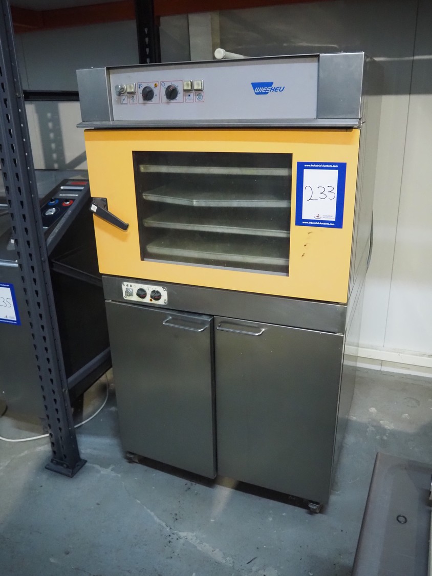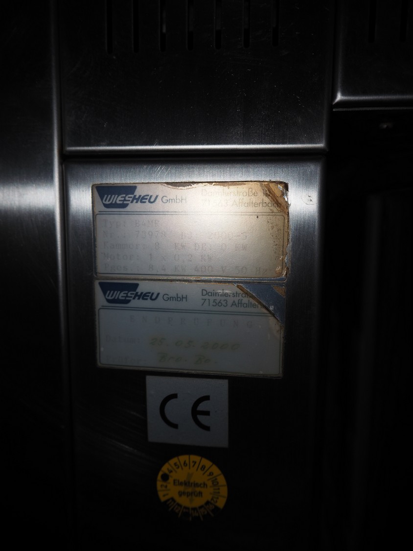 Wiesheu GmbH oven, type: B4MR, number: 73978, year of construction: 2000-5, 400 V, 50 Hz, 8 kW, 4 floors, floor dimensions: 400 mm x 600 mm, total dimensions: 950 mm x 870 mm x 1700 mm.