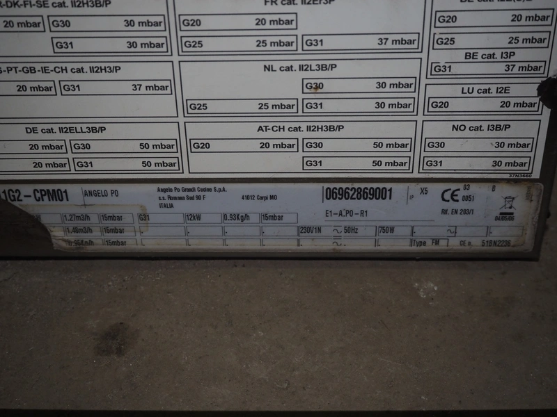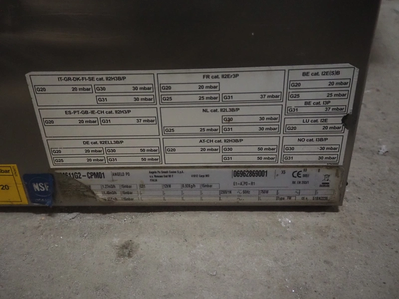 Angelo Po combisteamer, number: 06962869001, 230 V, 1 Ph, 50 Hz, 750 Watt, 6 floors, floor dimensions: 480 mm x 320 mm, total dimensions: 980 mm x 800 mm x 1600 mm.