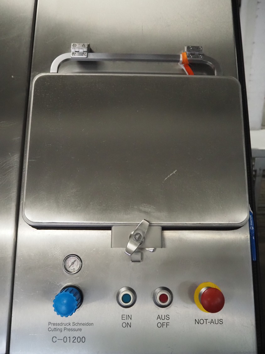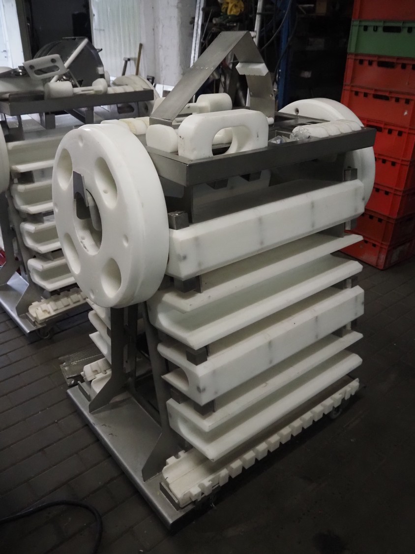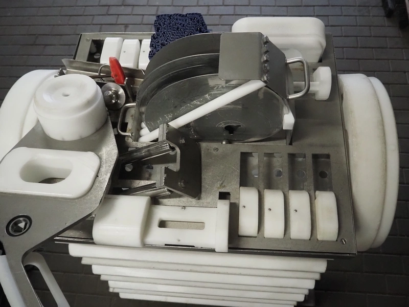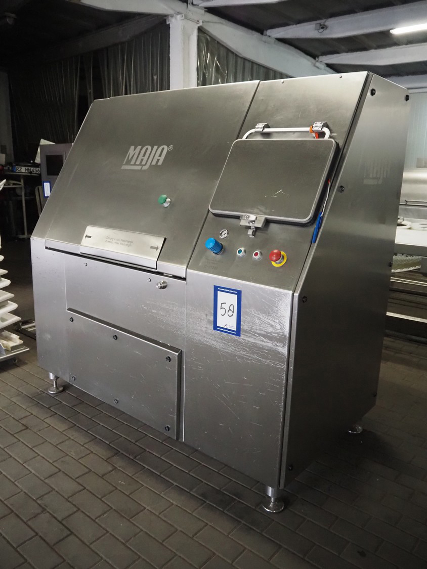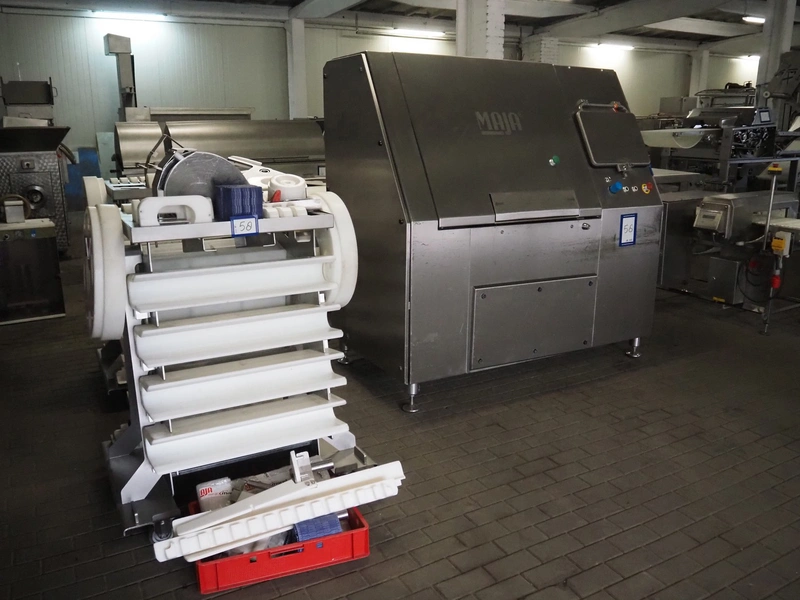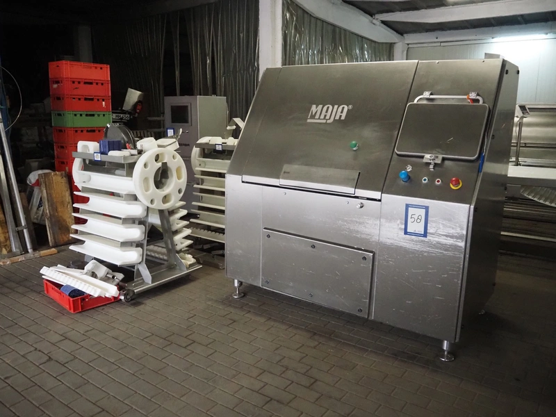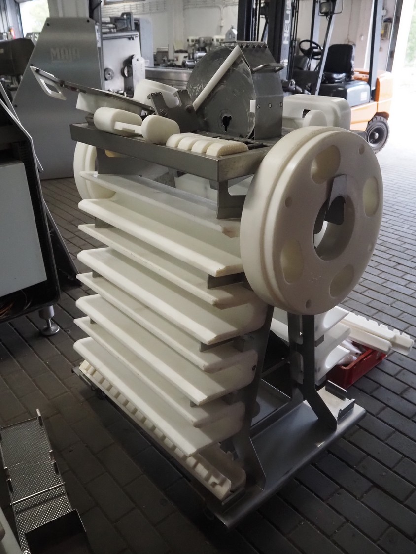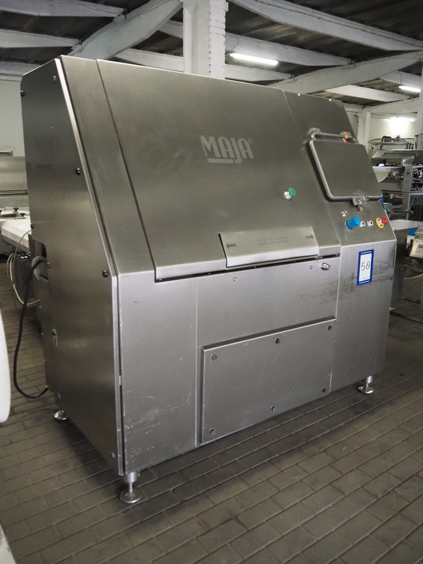 Maja portion cutter, type: C-01200, outfeed clearance: 200 mm x 100 mm, total dimensions: 1890 mm x 1070 mm x 1850 mm. Including 2 trolleys with dyes, knives and other spare parts, dimensions dyes: Ø 480 mm, dimensions knives: Ø 280 mm, total dimensions trolley: (2x) 950 mm x 800 mm x 1480 mm.