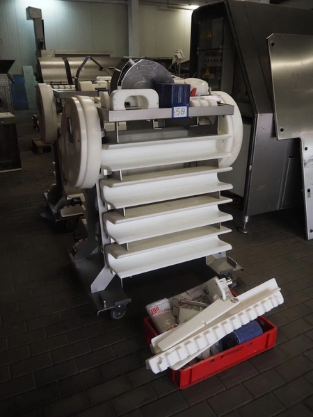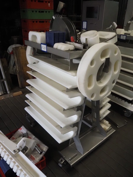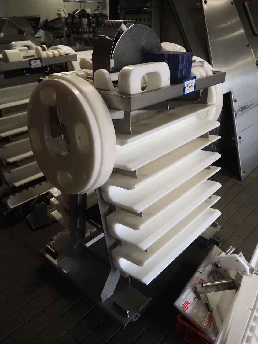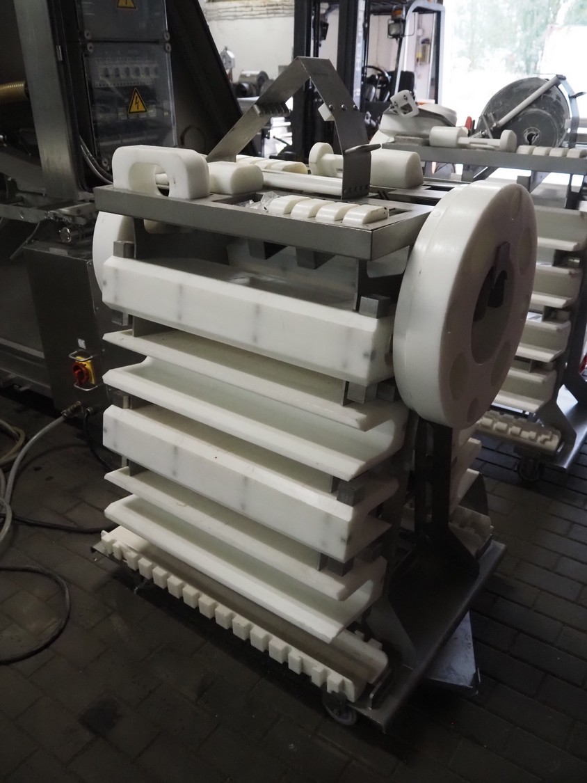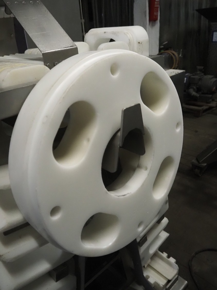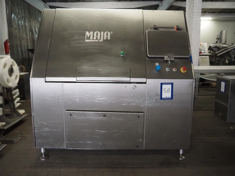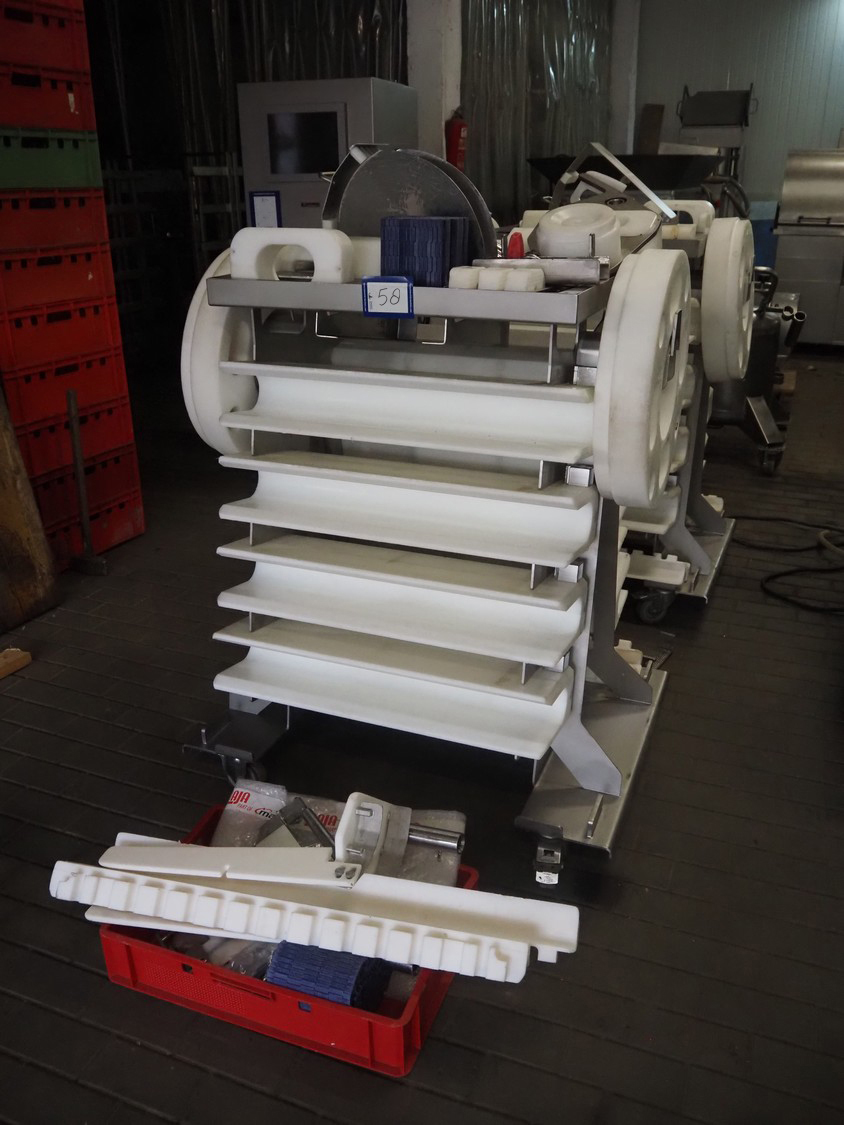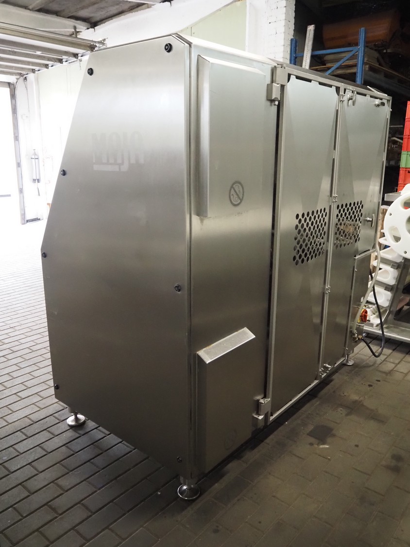 Maja portion cutter, type: C-01200, outfeed clearance: 200 mm x 100 mm, total dimensions: 1890 mm x 1070 mm x 1850 mm. Including 2 trolleys with dyes, knives and other spare parts, dimensions dyes: Ø 480 mm, dimensions knives: Ø 280 mm, total dimensions trolley: (2x) 950 mm x 800 mm x 1480 mm.