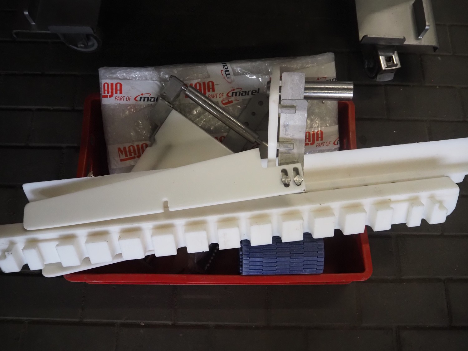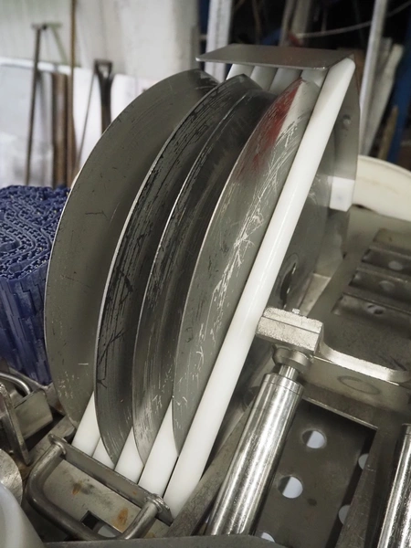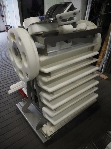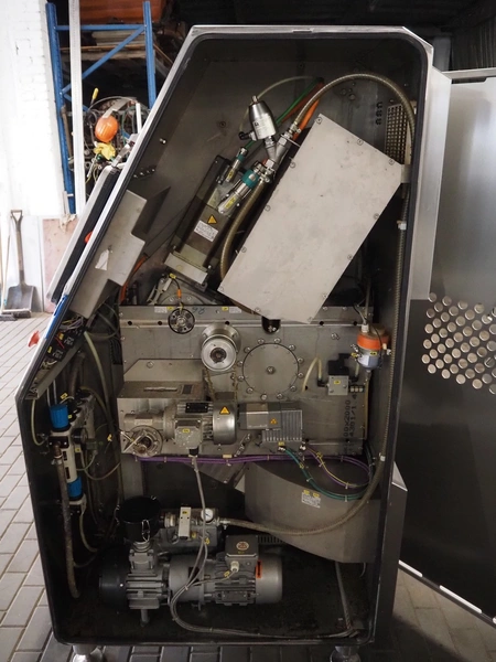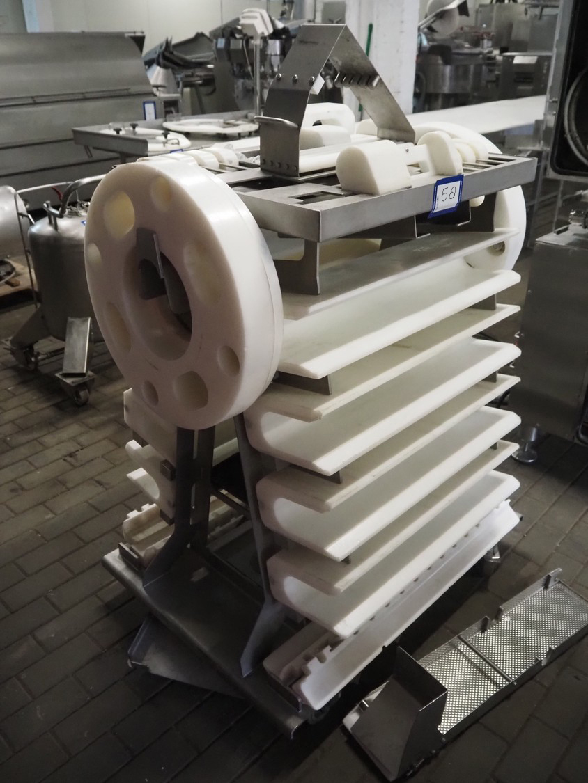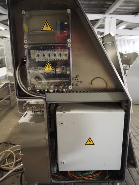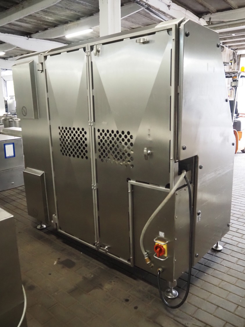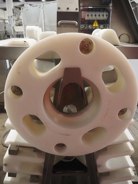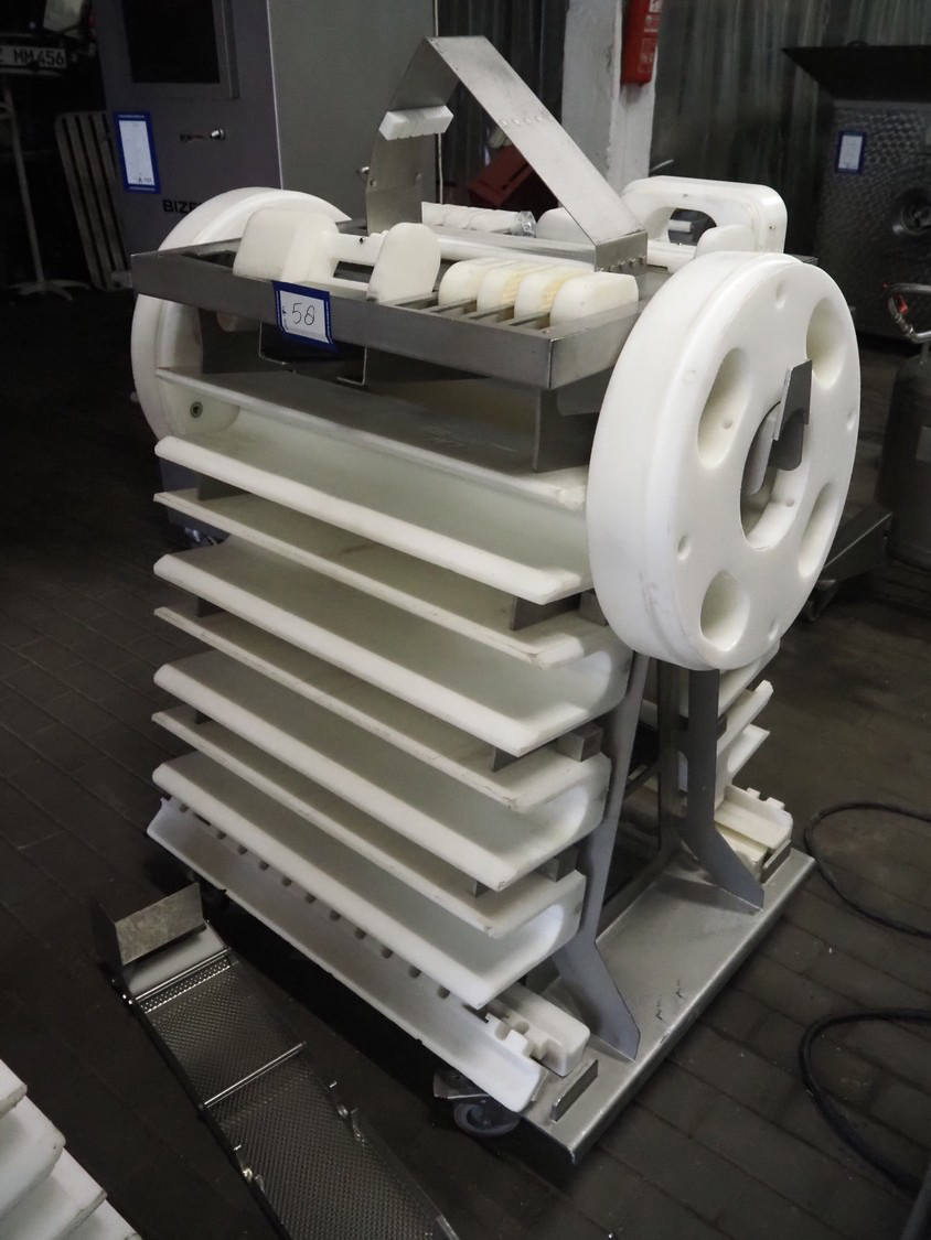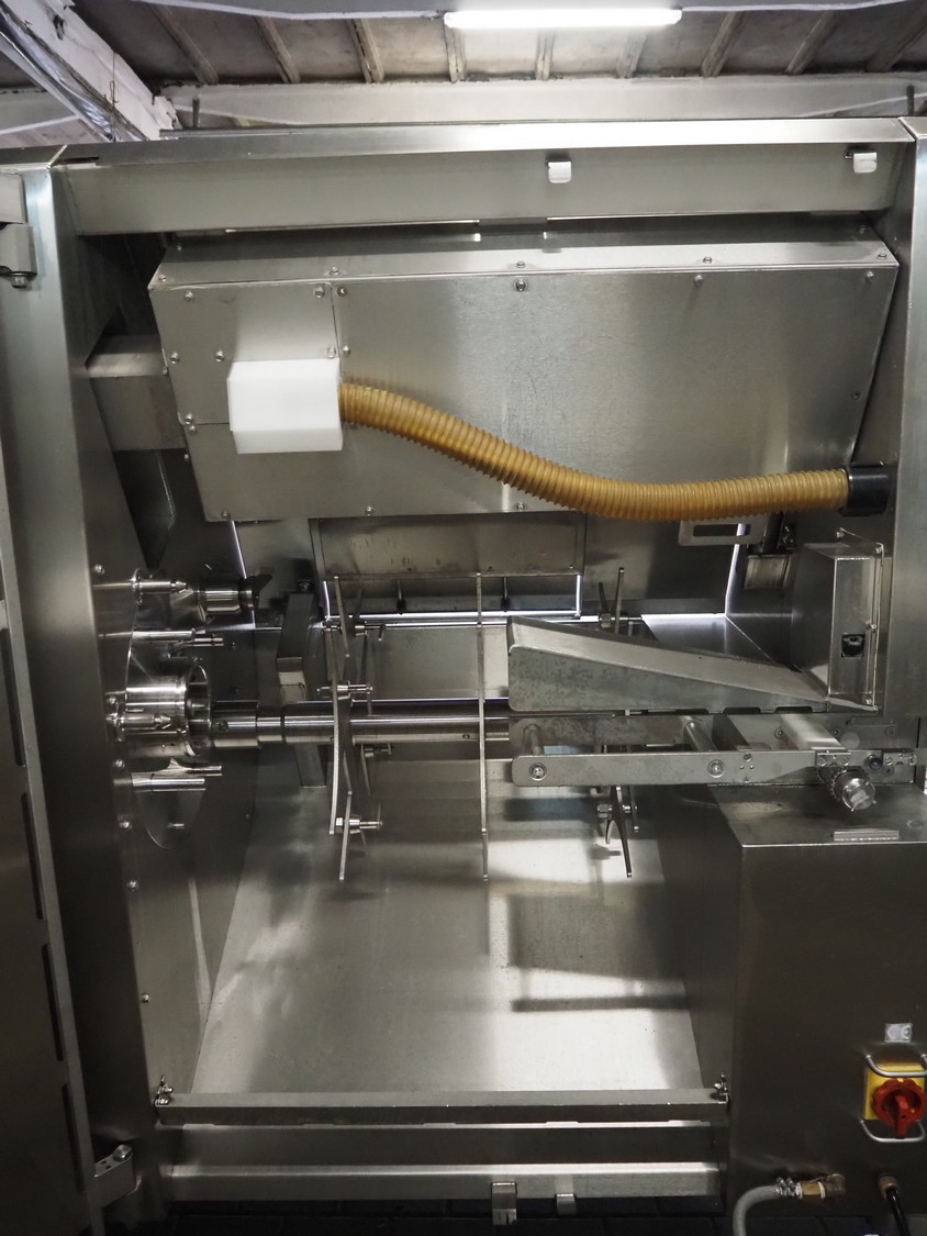 Maja portion cutter, type: C-01200, outfeed clearance: 200 mm x 100 mm, total dimensions: 1890 mm x 1070 mm x 1850 mm. Including 2 trolleys with dyes, knives and other spare parts, dimensions dyes: Ø 480 mm, dimensions knives: Ø 280 mm, total dimensions trolley: (2x) 950 mm x 800 mm x 1480 mm.