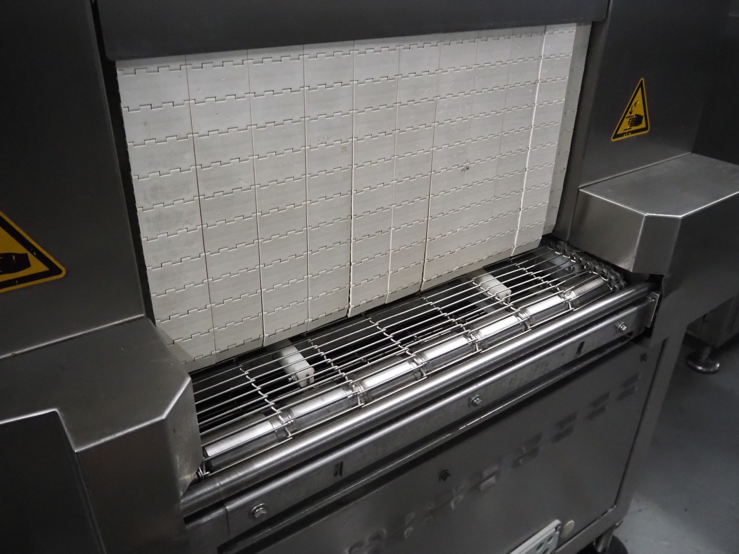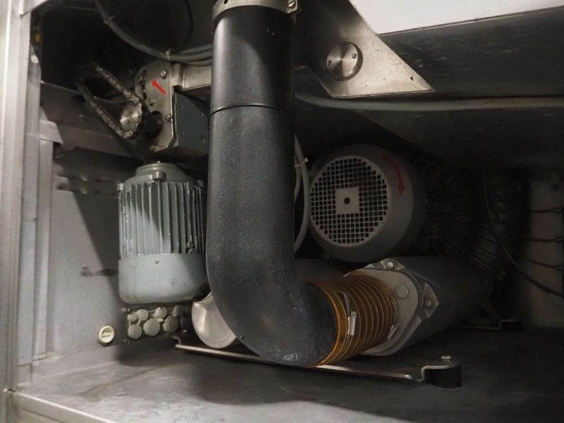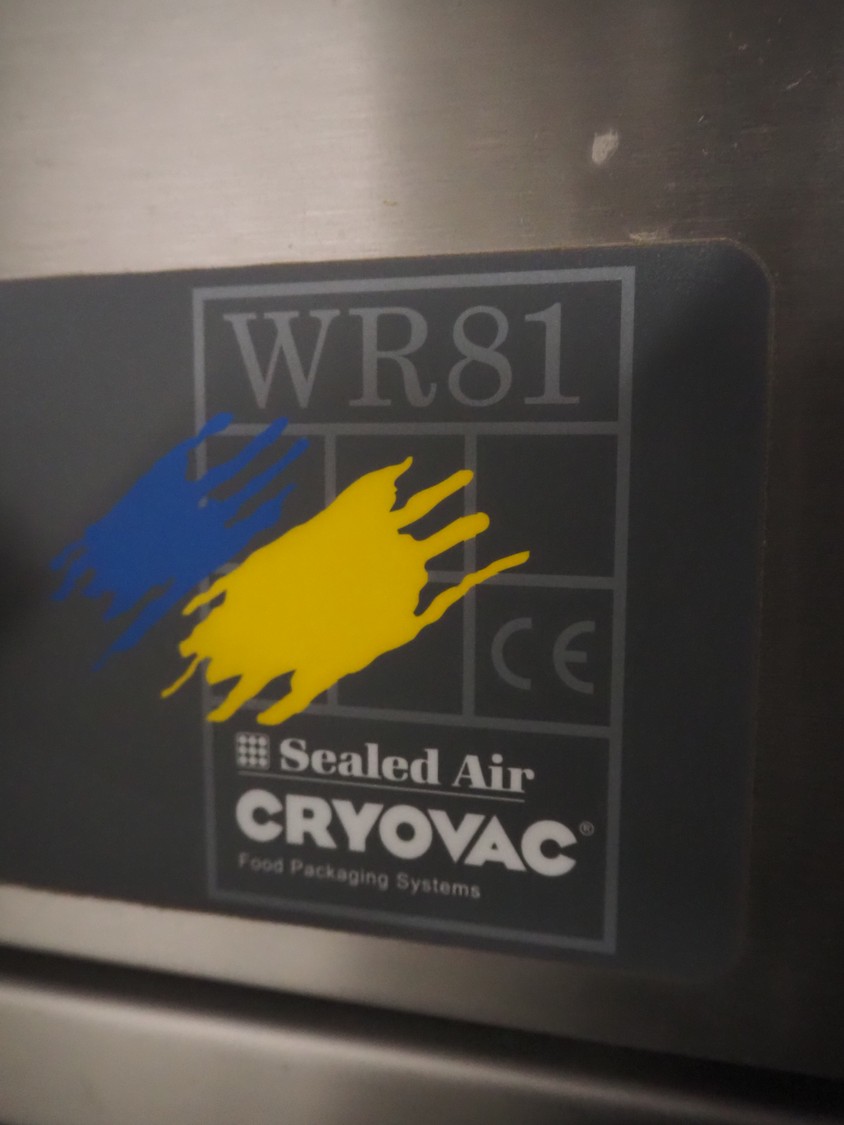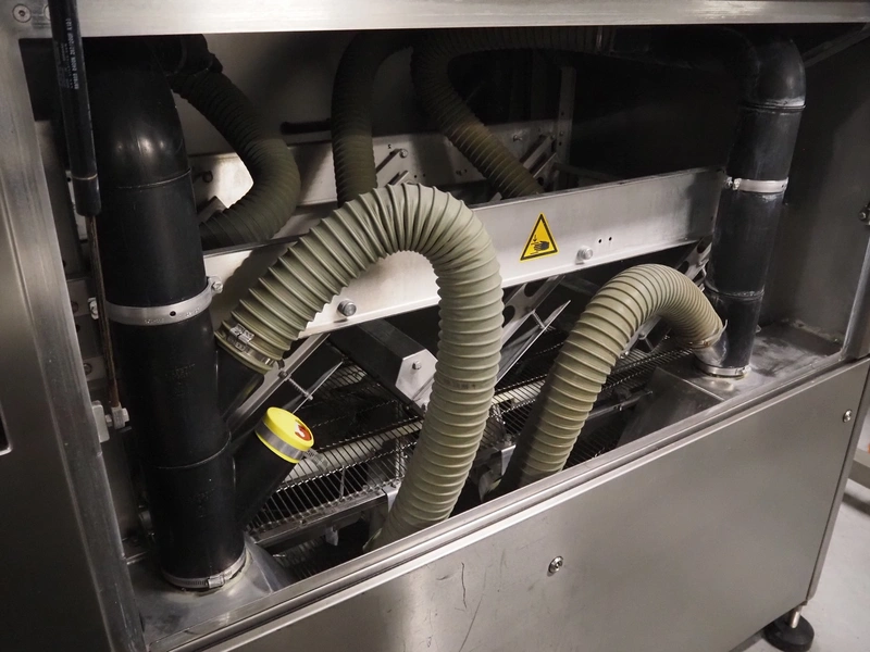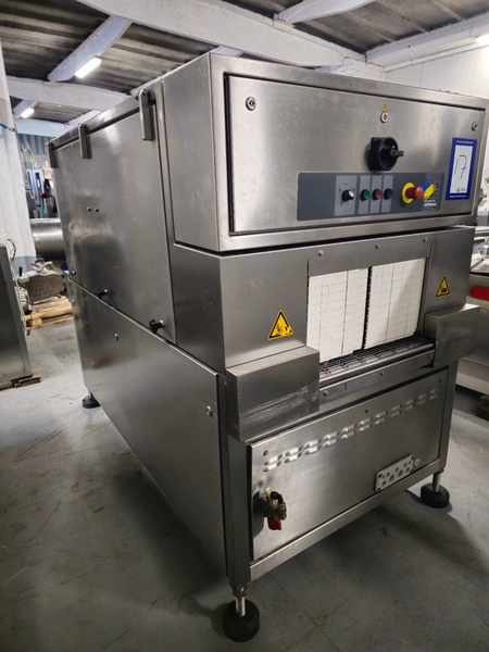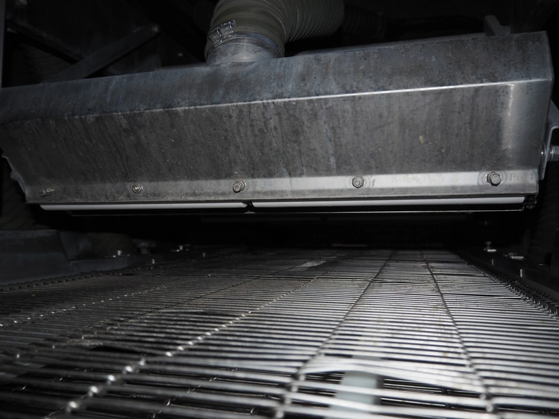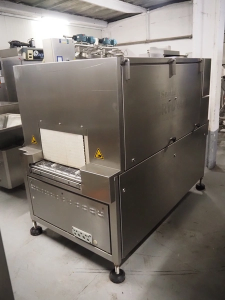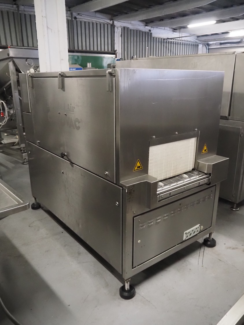 Cryovac drying tunnel, model: WR81, s/s mesh belt, belt width: 550 mm, clearance: 560 mm x 300 mm, (3x) blowers, working width blower: (3x) 550 mm, total dimensions: 2050 mm x 1170 mm x 1700 mm.