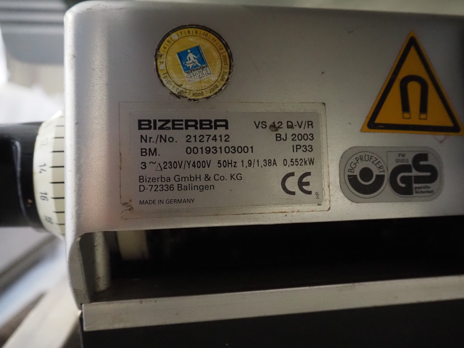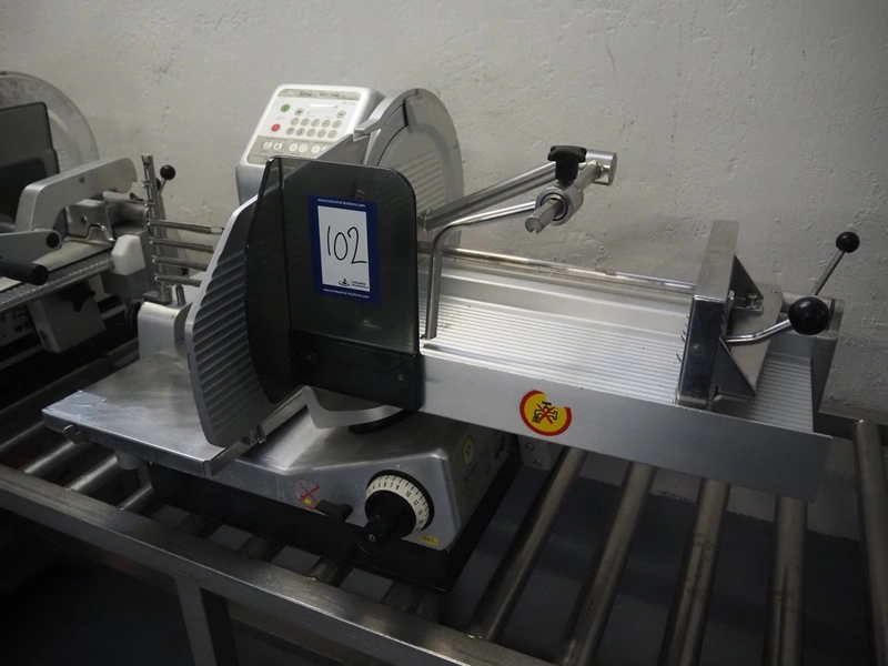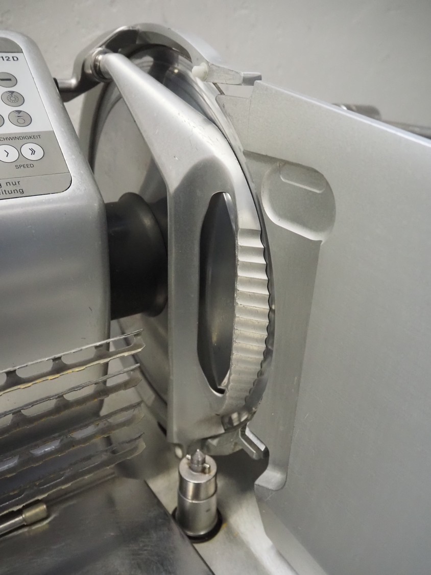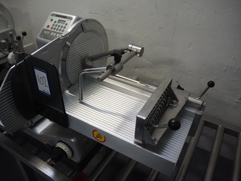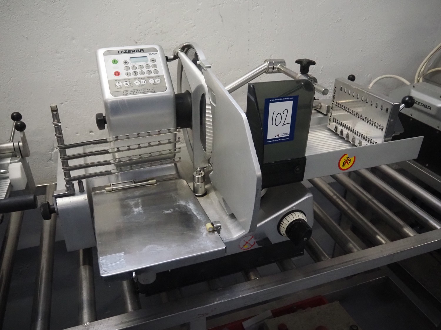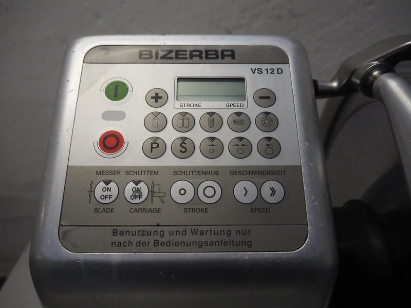 Bizerba automatic slicer, model: VS 12 D-V/R, number: 2127412, year of construction: 2003, 230/400 V, 3 Ph, 50 Hz, 1.9/1.38 A, 0.552 kW, dimensions: 1000 mm x 650 mm x 500 mm.