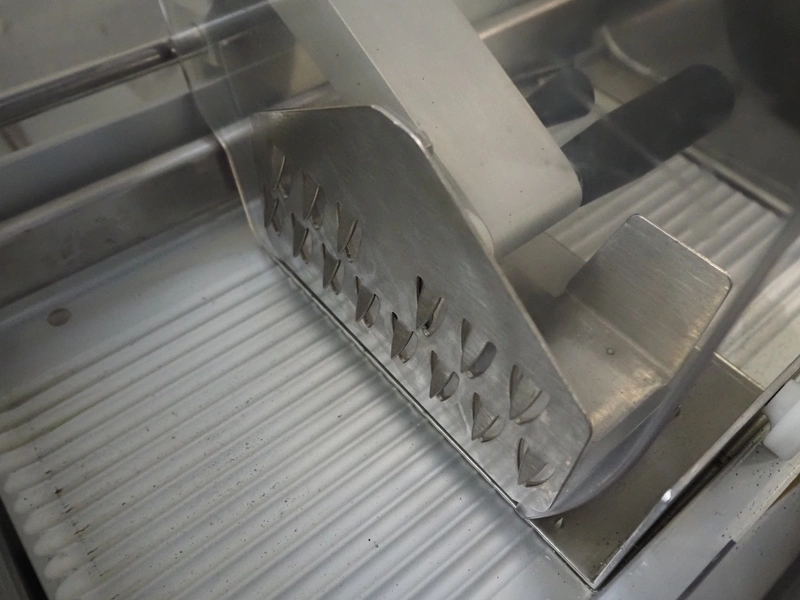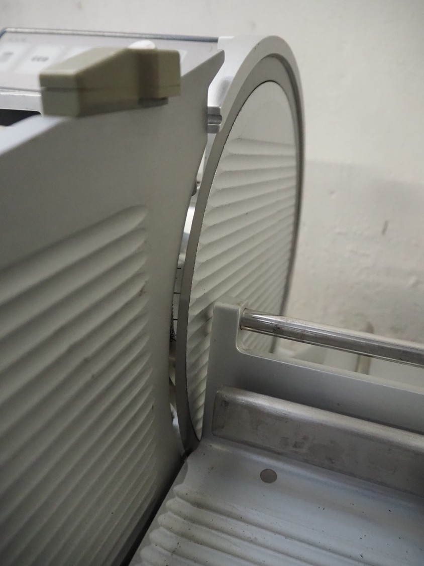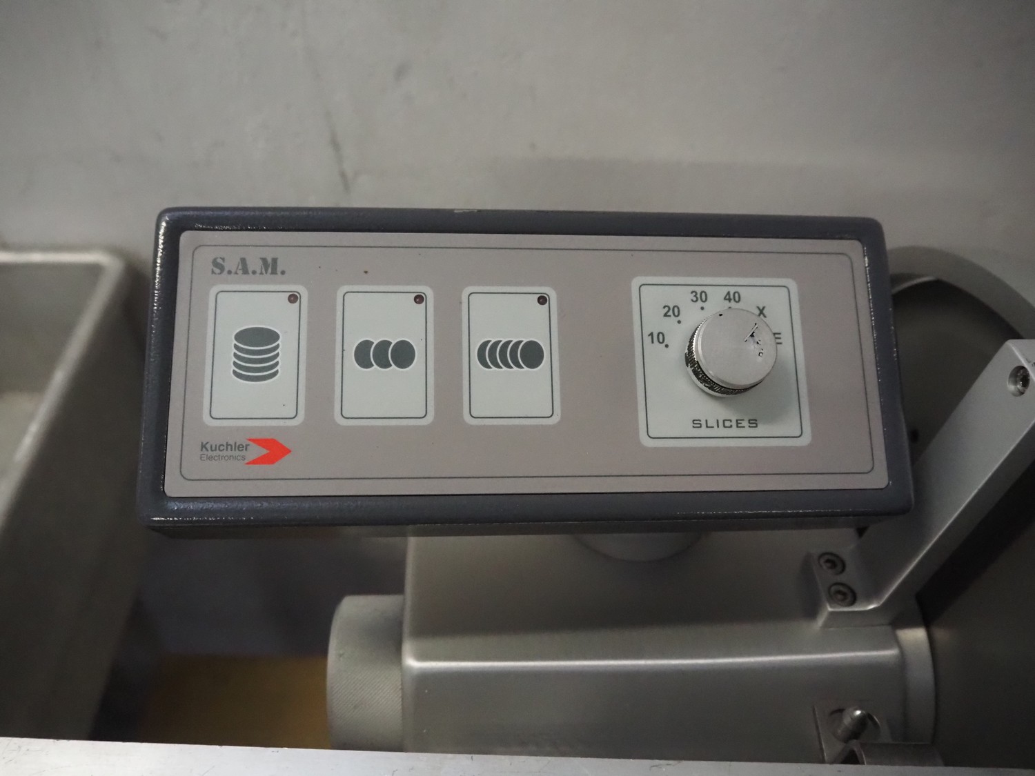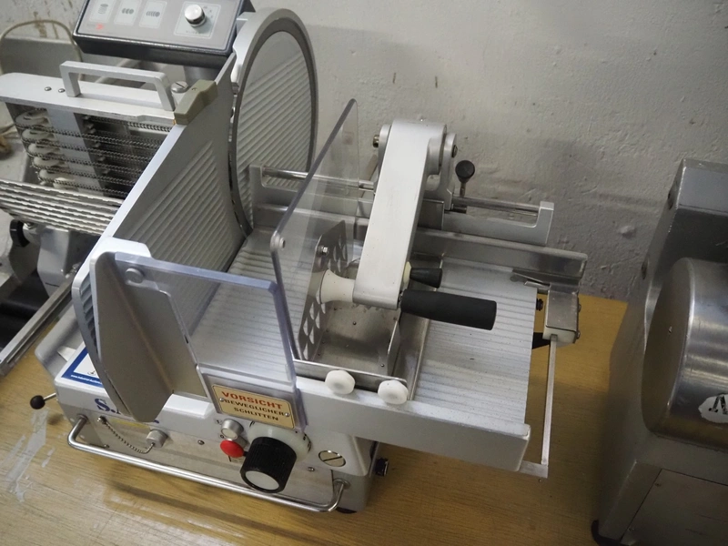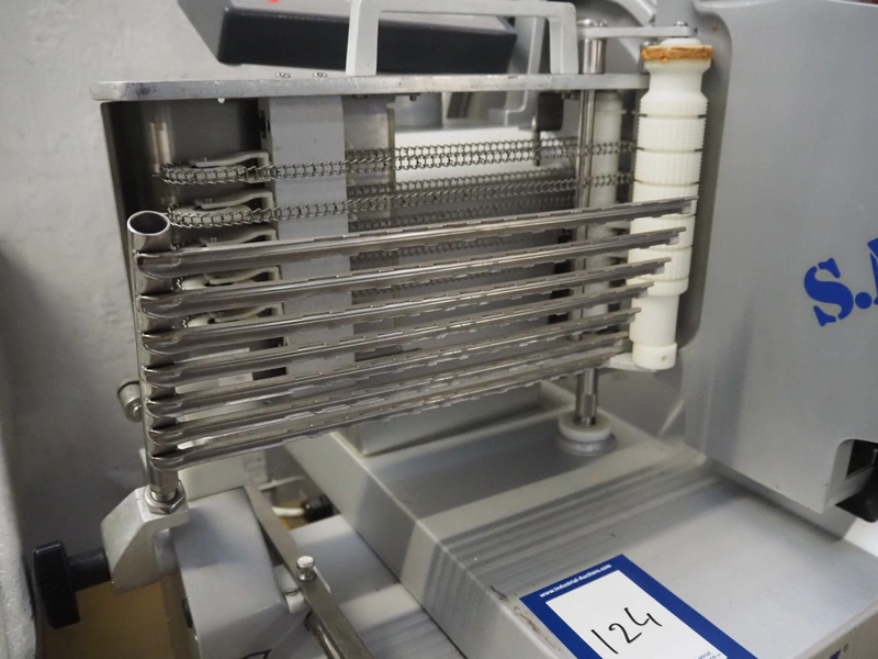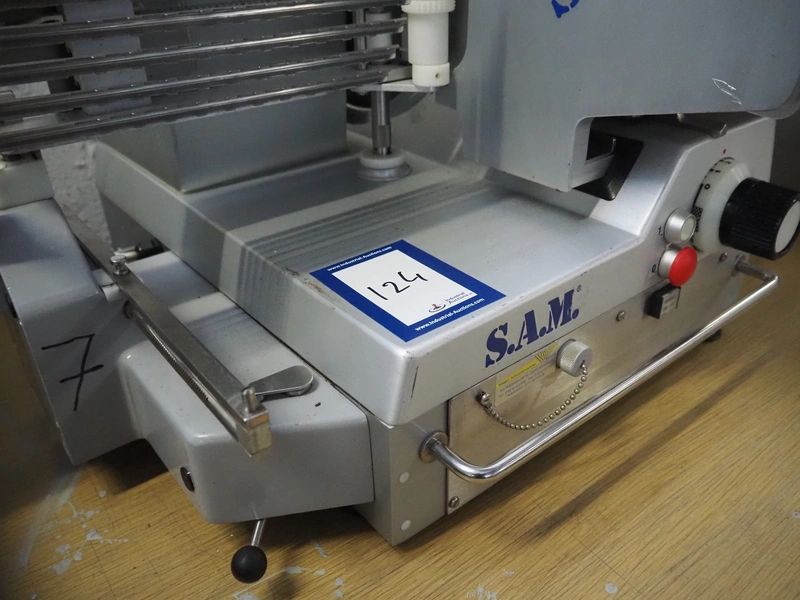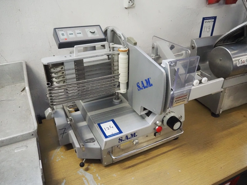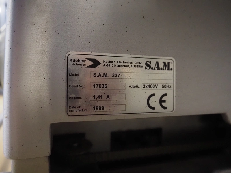 S.A.M. automatic slicer, model: S.A.M. 337 i, serial number: 17636, year of construction: 1999, 400 V, 3 Ph, 50 Hz, 1.41 A, dimensions: 800 mm x 700 mm x 500 mm.