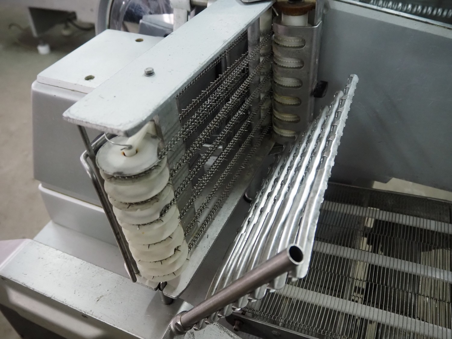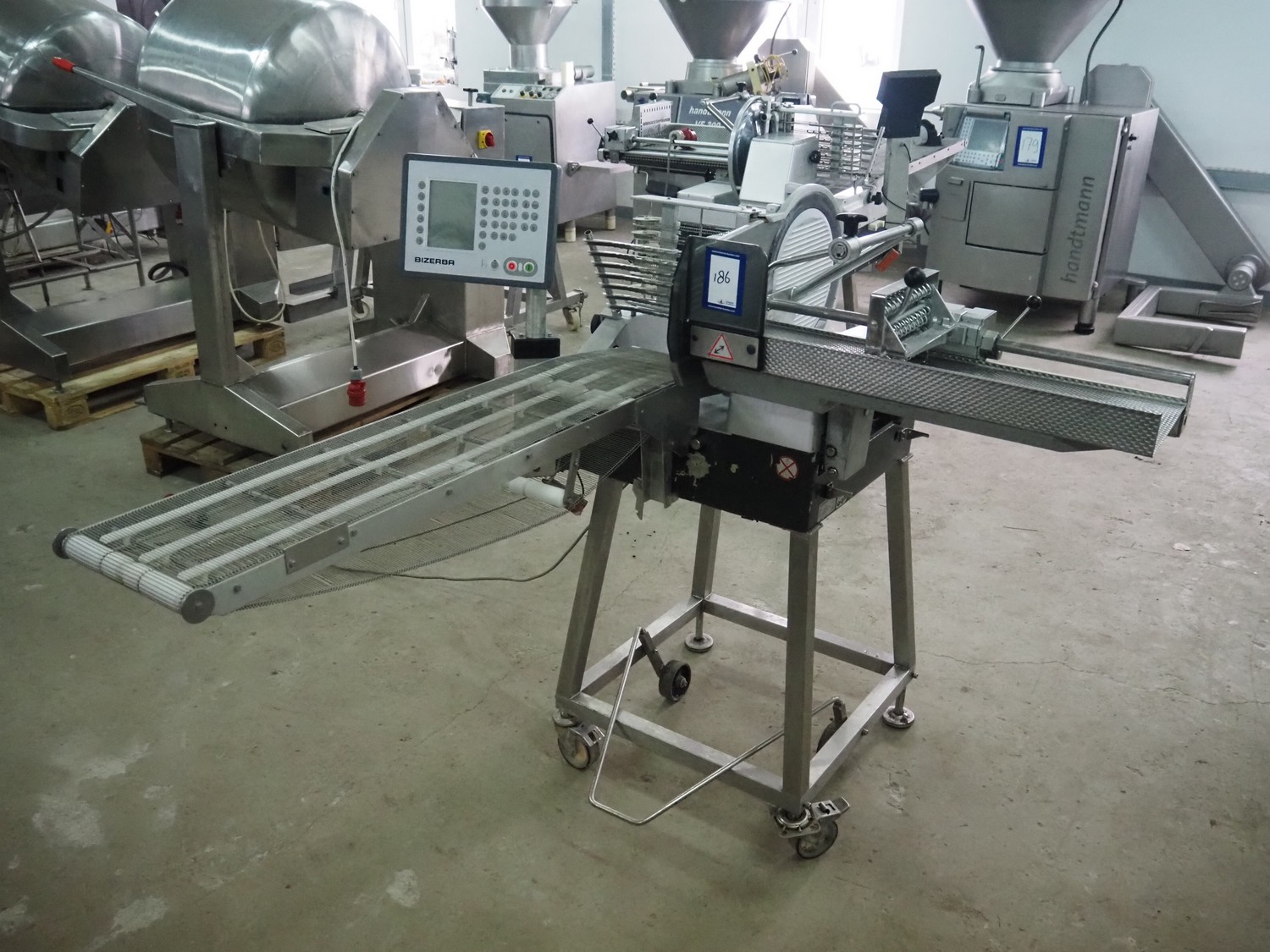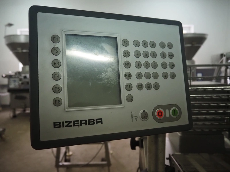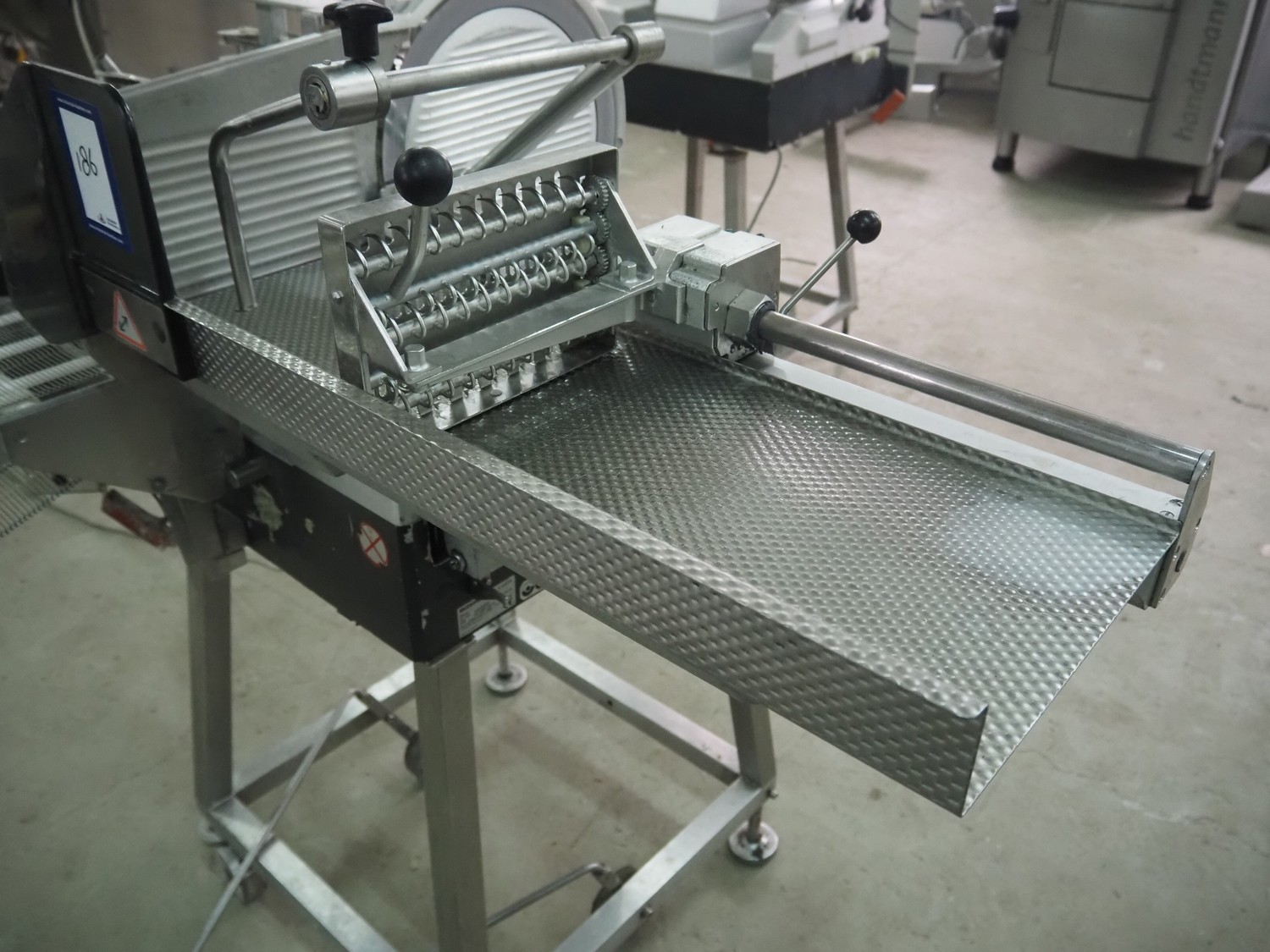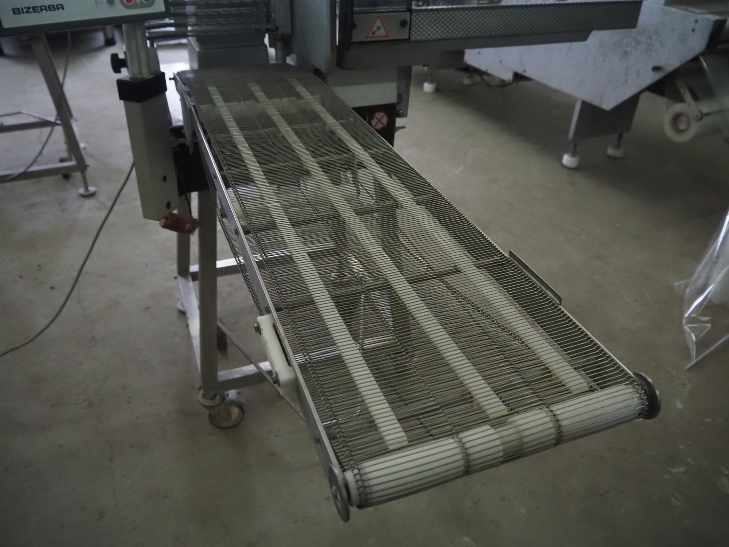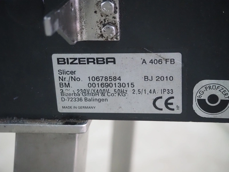 Bizerba mobile automatic slicer, model: A 406 FB, number: 10678584, year of construction: 2010, 230/400 V, 3 Ph, 50 Hz, 2.5/1.4 A, s/s mesh belt, belt width: 250 mm, total dimensions: 1320 mm x 1600 mm x 1350 mm. Including knife sharpener.