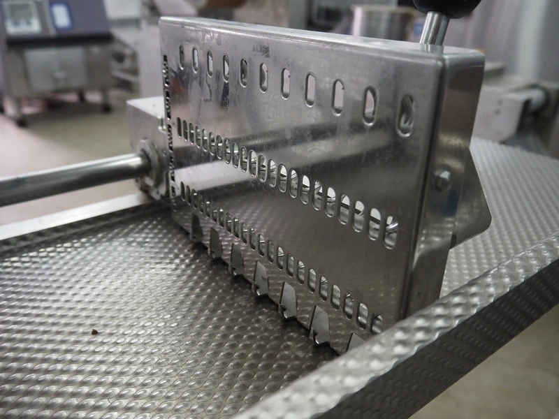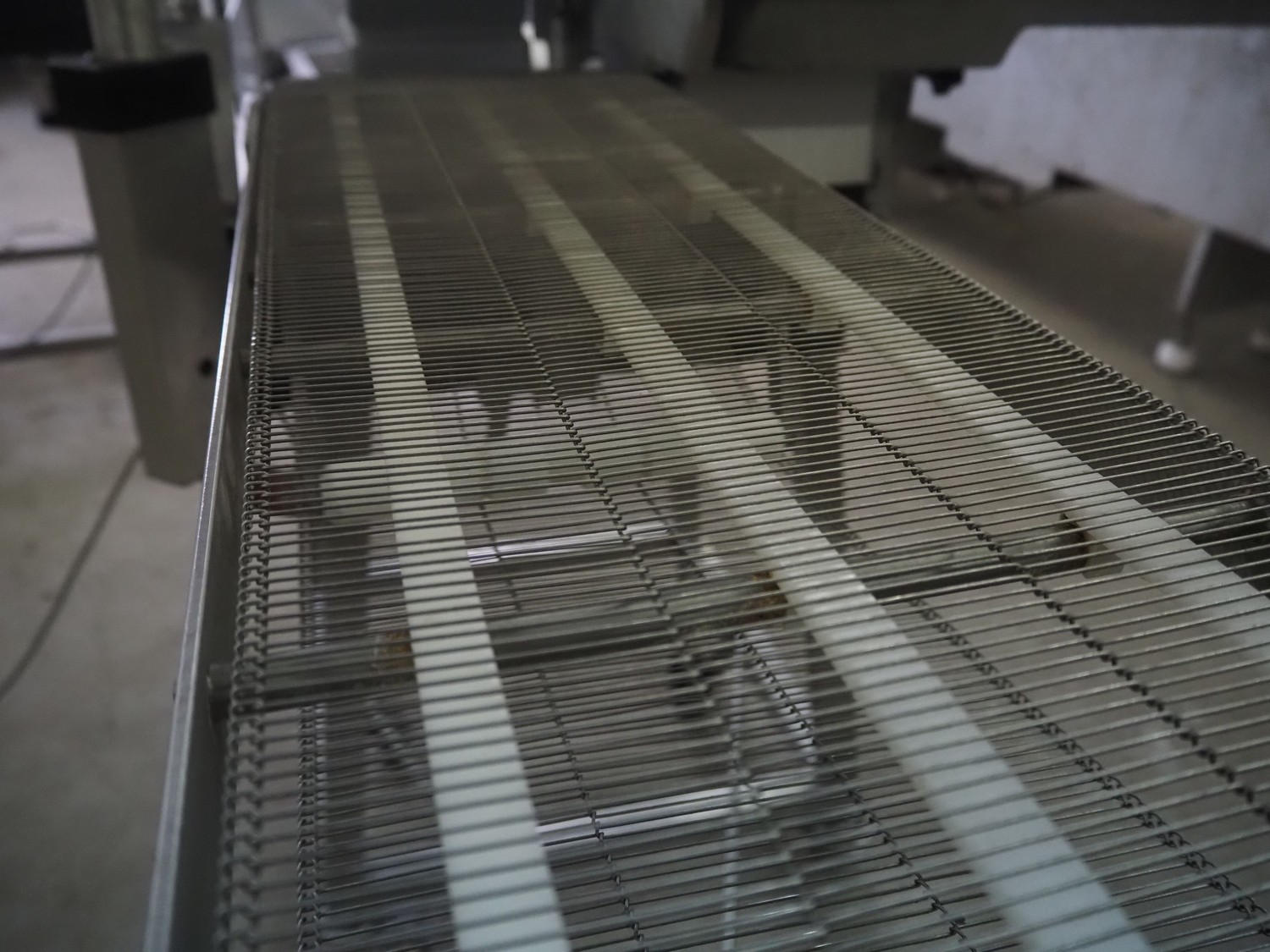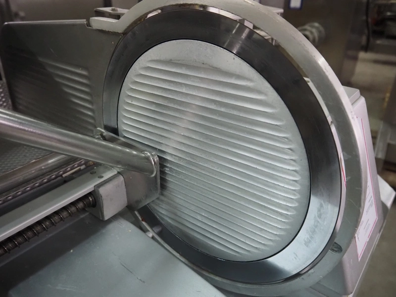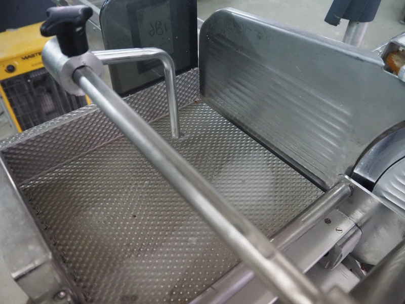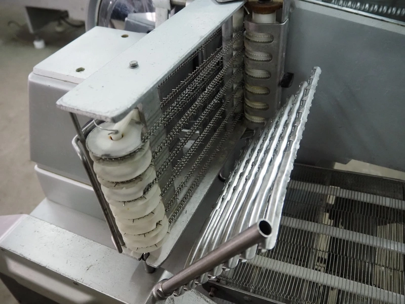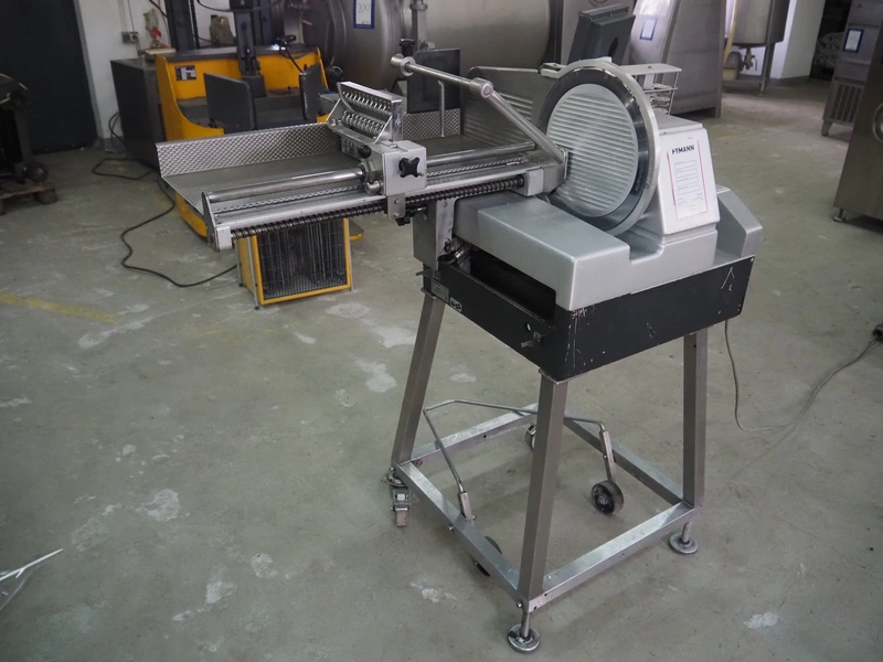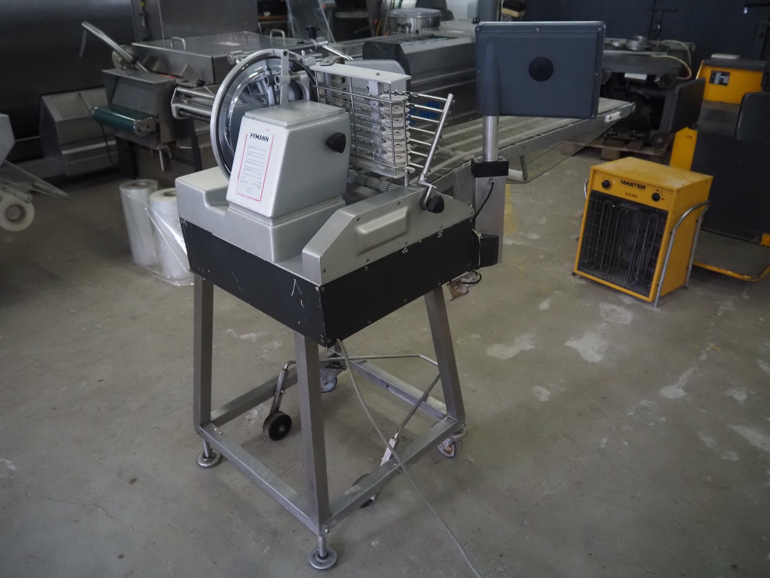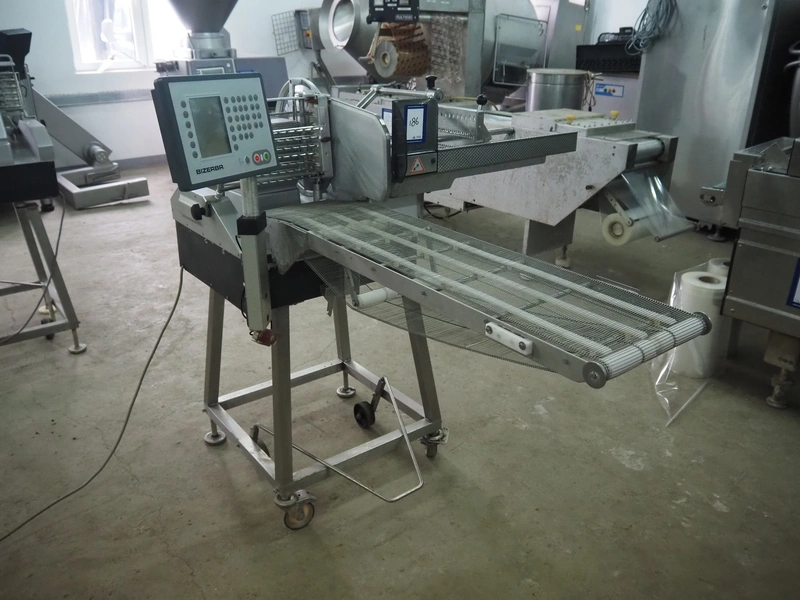 Bizerba mobile automatic slicer, model: A 406 FB, number: 10678584, year of construction: 2010, 230/400 V, 3 Ph, 50 Hz, 2.5/1.4 A, s/s mesh belt, belt width: 250 mm, total dimensions: 1320 mm x 1600 mm x 1350 mm. Including knife sharpener.