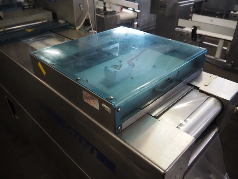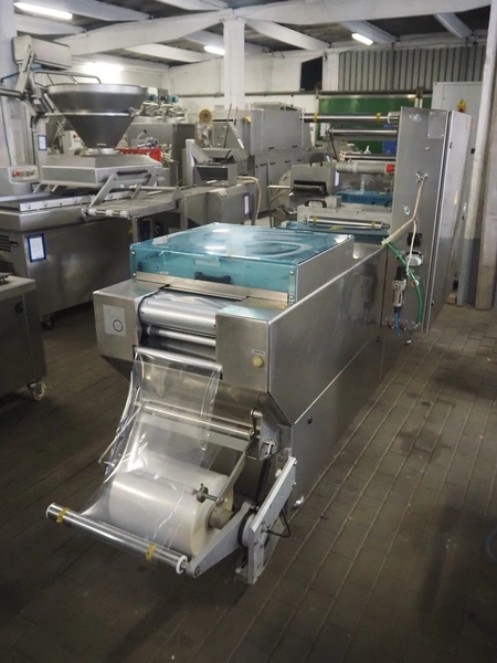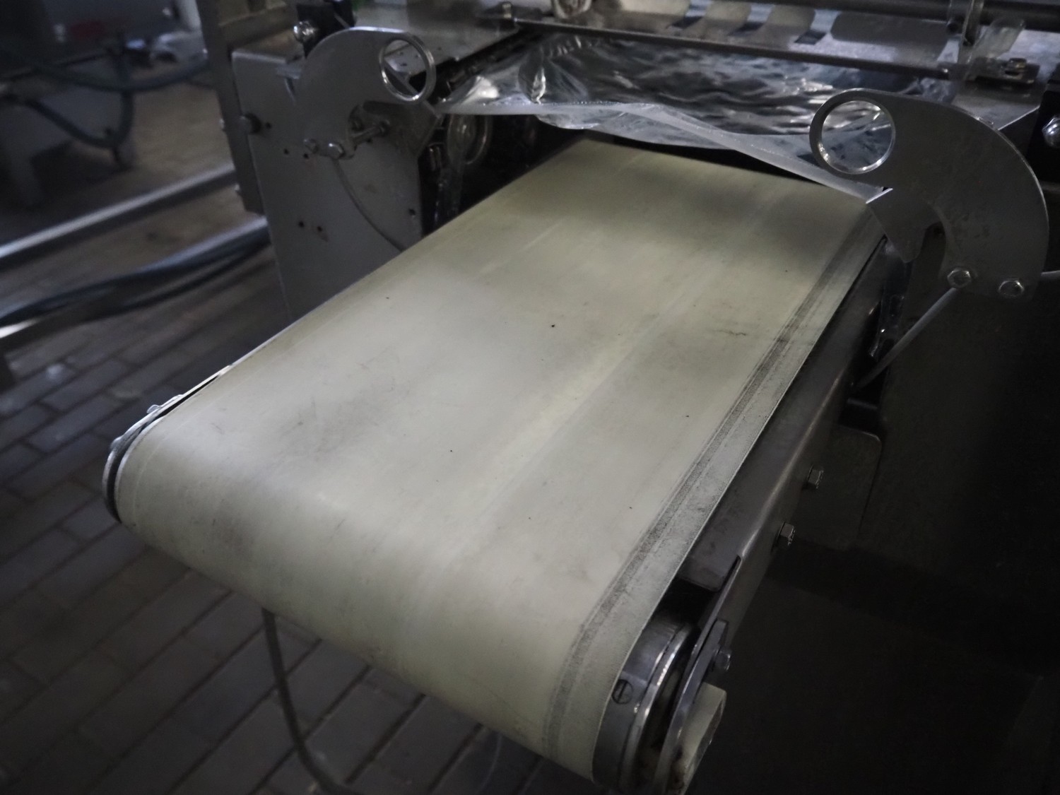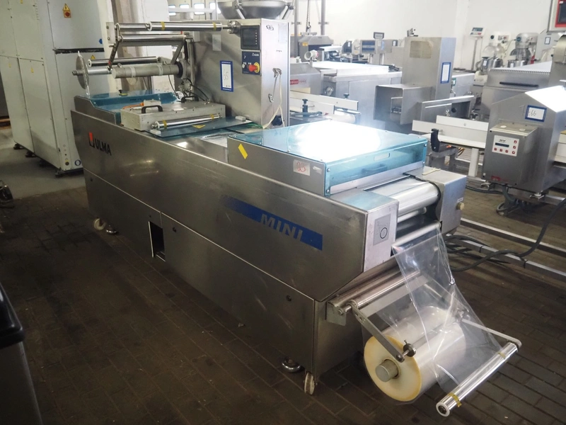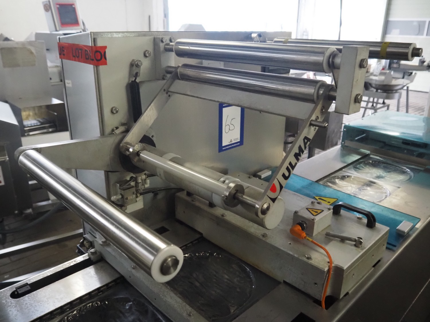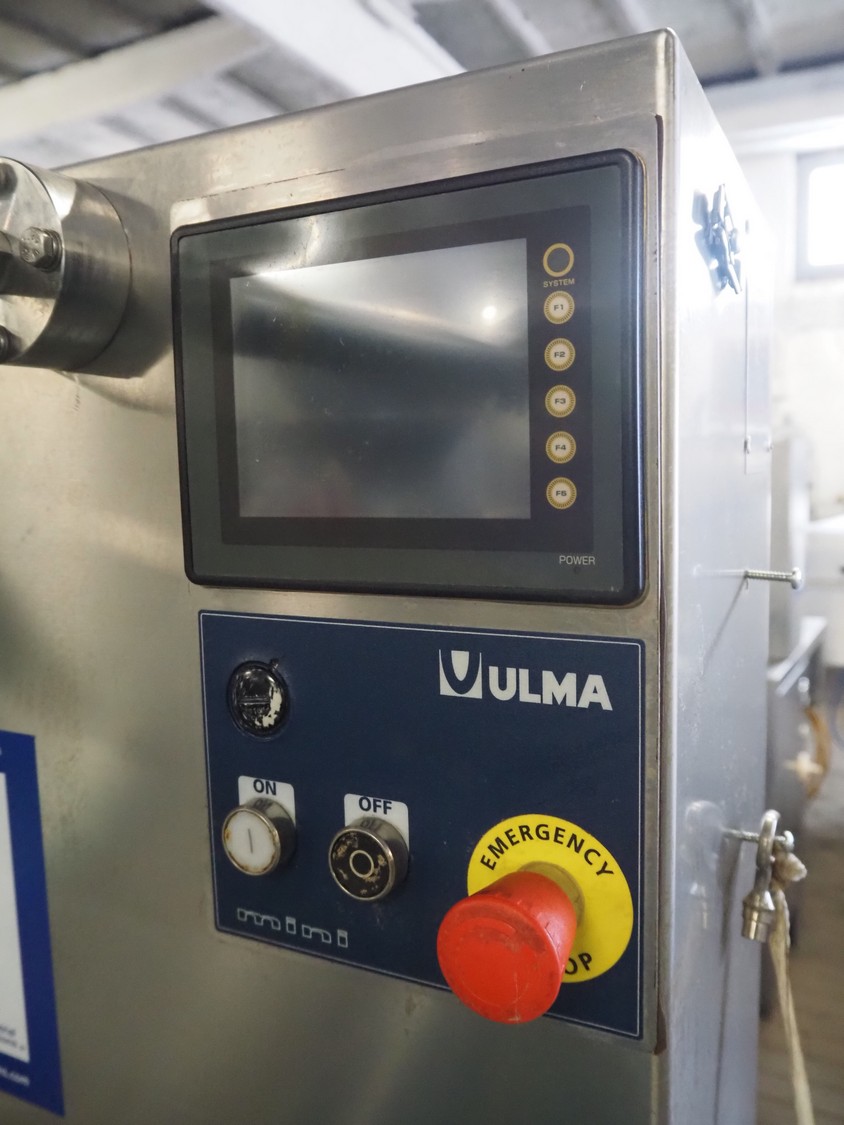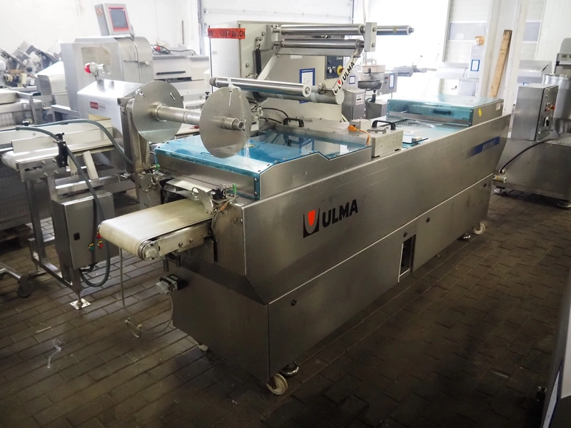 Ulma thermoformer, model: TF-MINI, number: 3011632, year of construction: 2008, 380 V, 50 Hz, 15 A, 17 kW, bottom film width: 330 mm, dye: Ø 280 mm, plastic outfeed belt, belt width: 265 mm, Busch vacuum pump, type: RA 0100 F 503, capacity: 120 m³ per hour, total dimensions: 3650 mm x 950 mm x 1600 mm.
