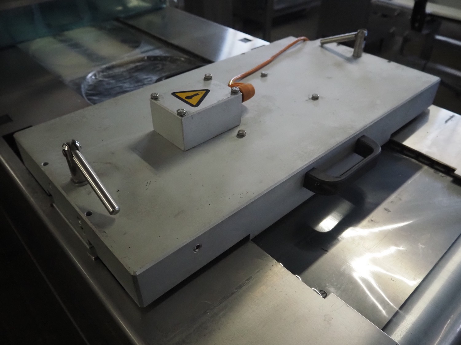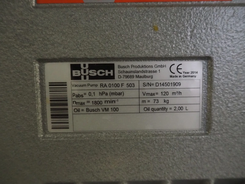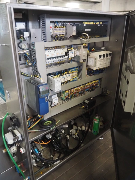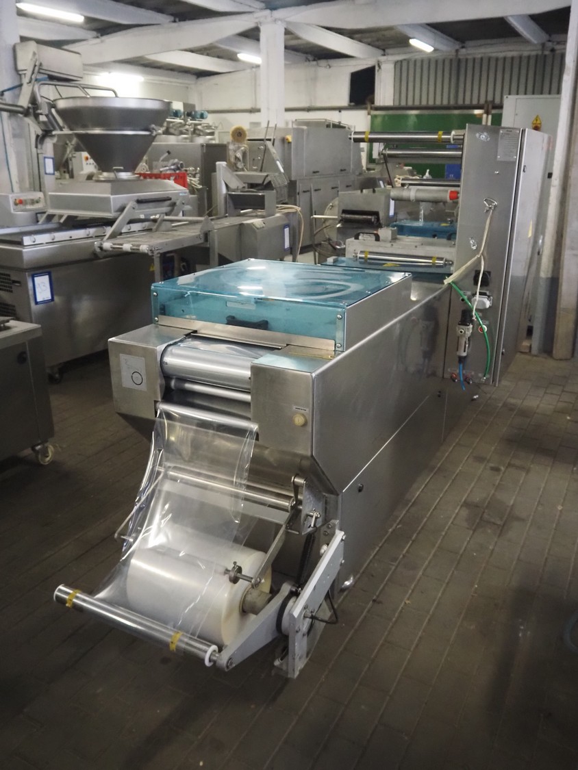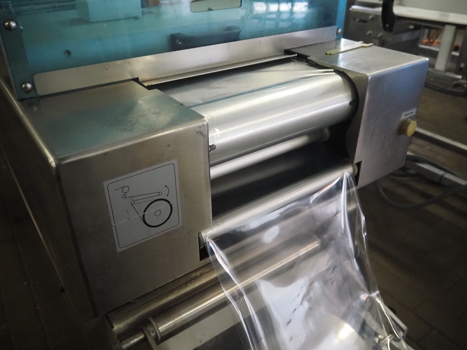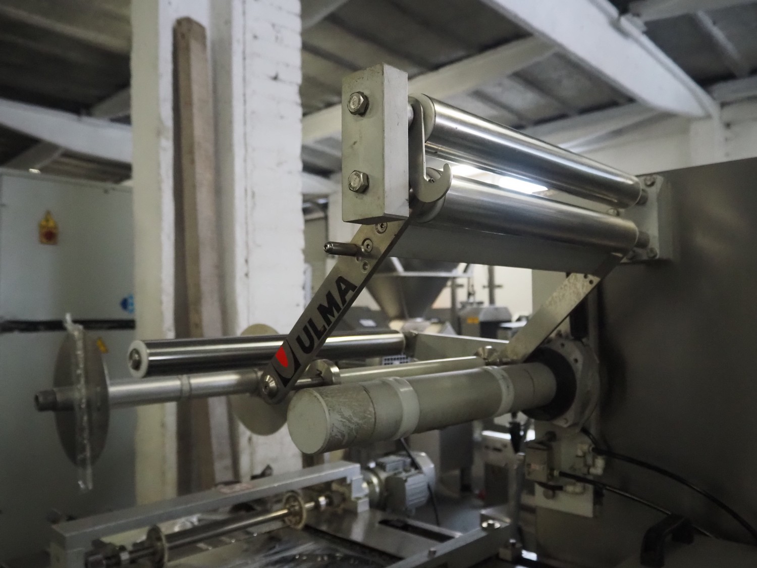 Ulma thermoformer, model: TF-MINI, number: 3011632, year of construction: 2008, 380 V, 50 Hz, 15 A, 17 kW, bottom film width: 330 mm, dye: Ø 280 mm, plastic outfeed belt, belt width: 265 mm, Busch vacuum pump, type: RA 0100 F 503, capacity: 120 m³ per hour, total dimensions: 3650 mm x 950 mm x 1600 mm.