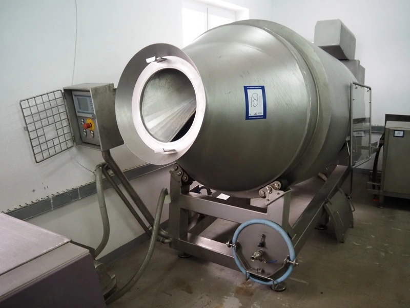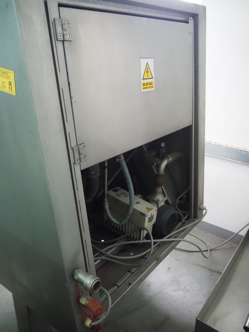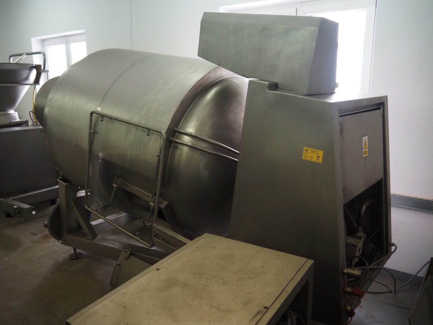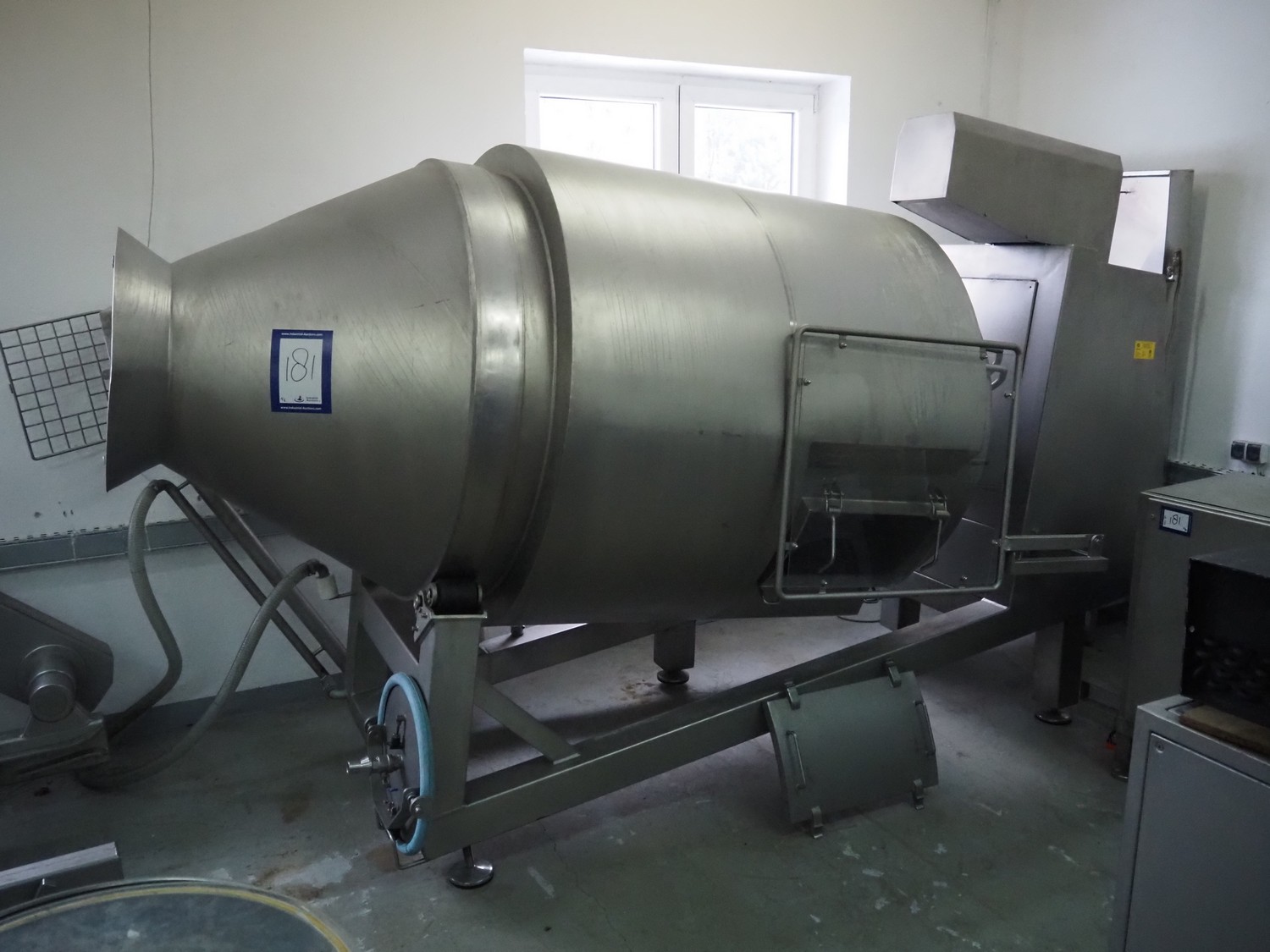 Karpowicz cooled vacuum tumbler, model: MK-2000C, serial number: 5252, volume tumbler: 2000 liter, ZTP TEPRO vacuum pump, type pump: AT 40 A, serial number: 1293, year of construction: 2015, capacity: 38 m³/h, dimensions tumbler: 3500 mm x 1650 mm x 2050 mm, dimensions cooling unit: 970 mm x 580 mm x 940 mm.