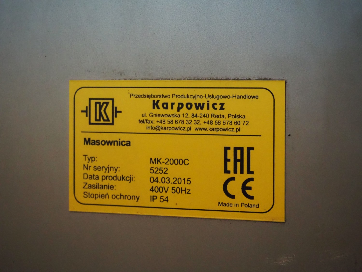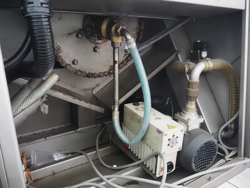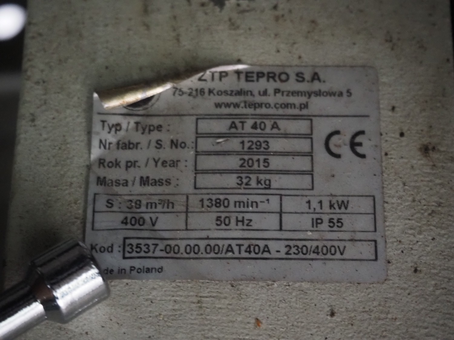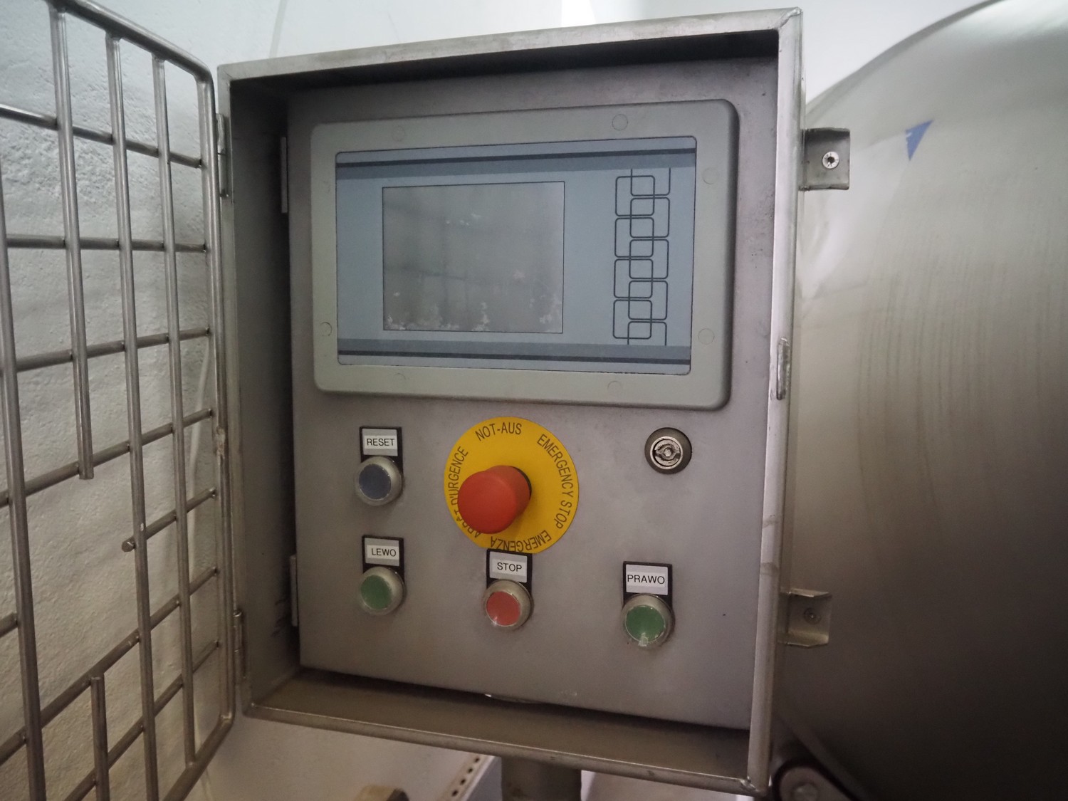 Karpowicz cooled vacuum tumbler, model: MK-2000C, serial number: 5252, volume tumbler: 2000 liter, ZTP TEPRO vacuum pump, type pump: AT 40 A, serial number: 1293, year of construction: 2015, capacity: 38 m³/h, dimensions tumbler: 3500 mm x 1650 mm x 2050 mm, dimensions cooling unit: 970 mm x 580 mm x 940 mm.