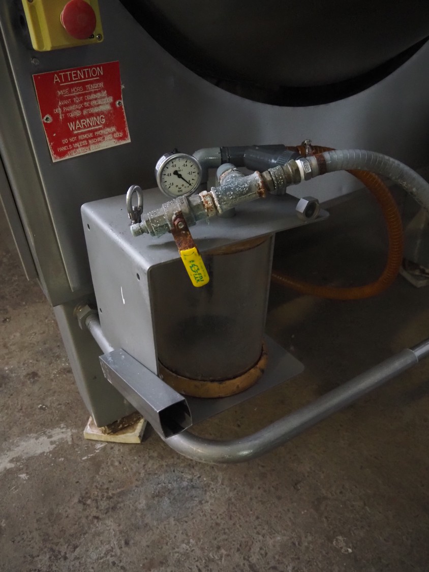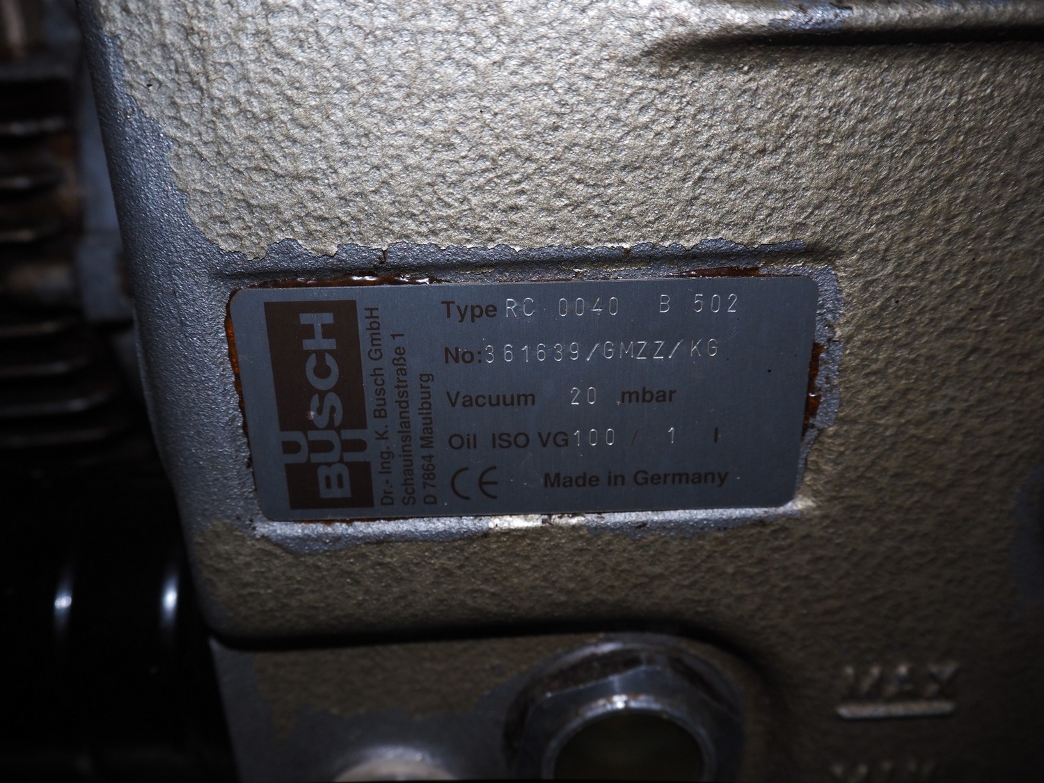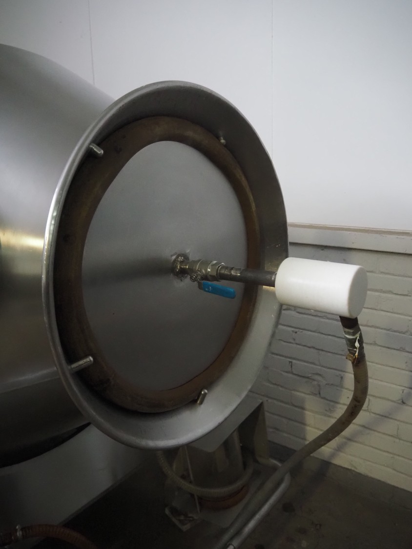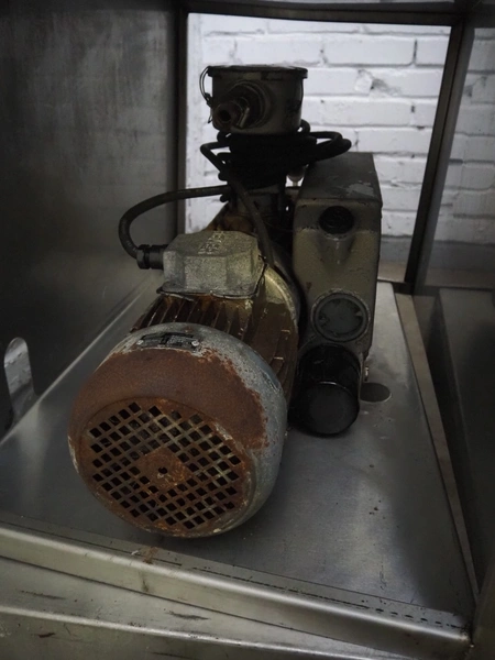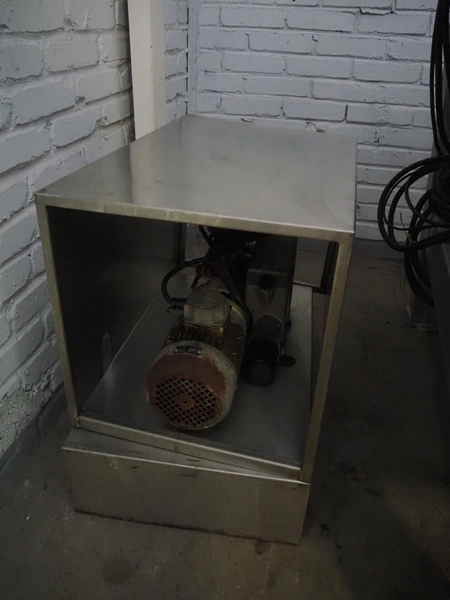 Vacuum tumbler, volume: 1000 liter, dimensions: 2700 mm x 1600 mm x 1900. Including Busch vacuum pump, type: RC 0040 B 502, capacity: 40 m³ per hour, dimensions: 800 mm x 500 mm x 700 mm.