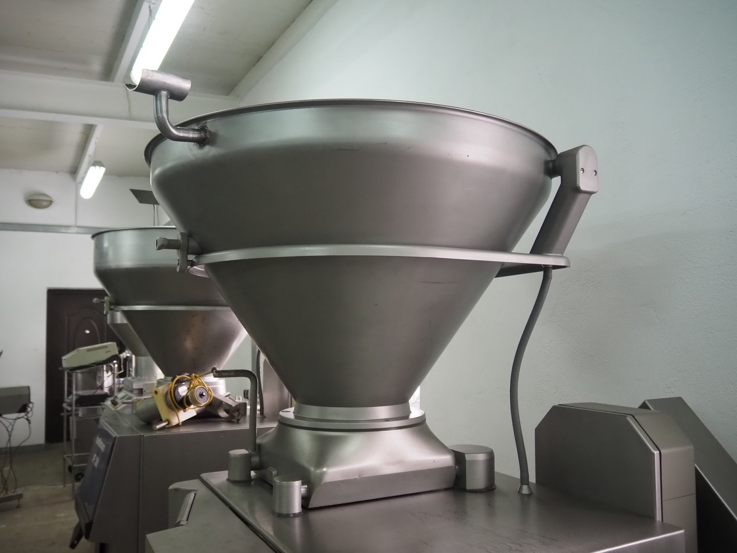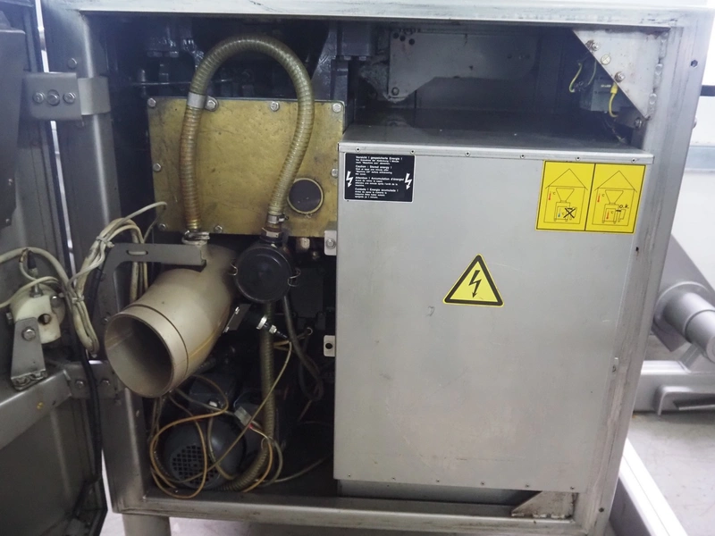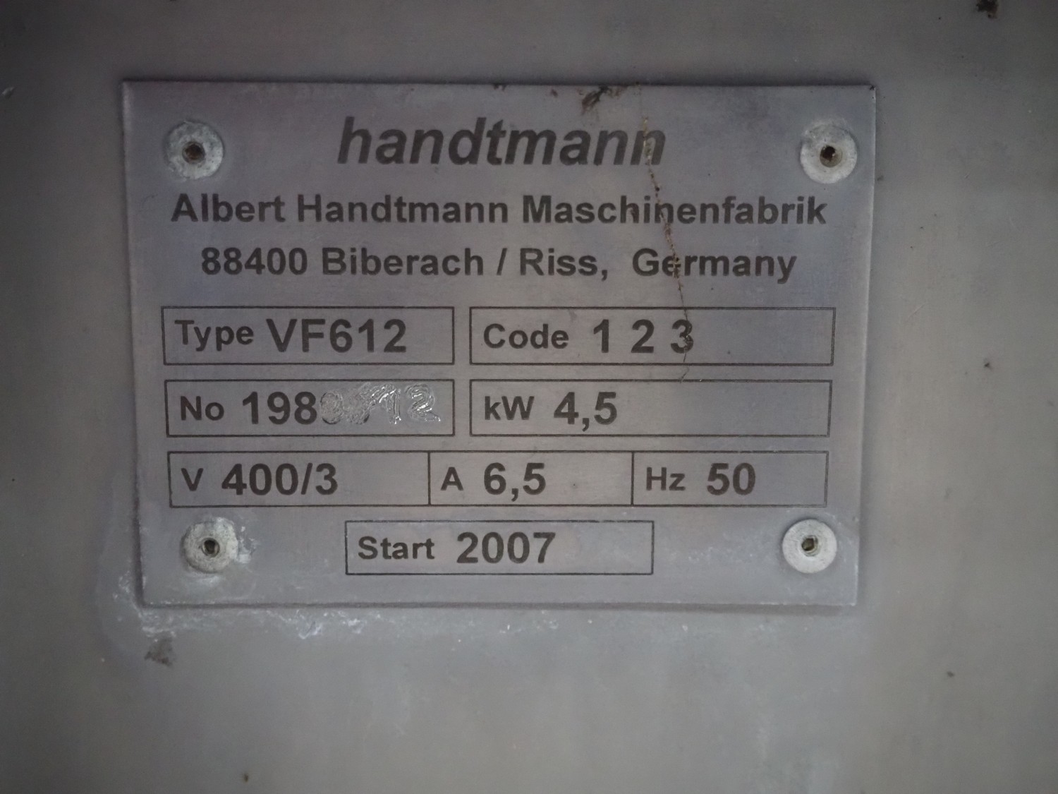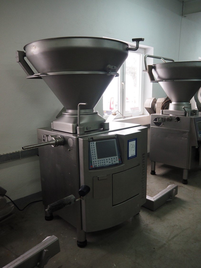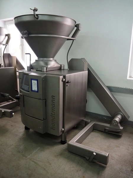 Handtmann vacuum filling machine with lifter for 200 liter meat bins, type: VF612, year of construction: 2007, 400 V, 3 Ph, 50 Hz, 6.5 A, 4.5 kW, dimensions: 2100 mm x 1400 mm x 2000 mm.