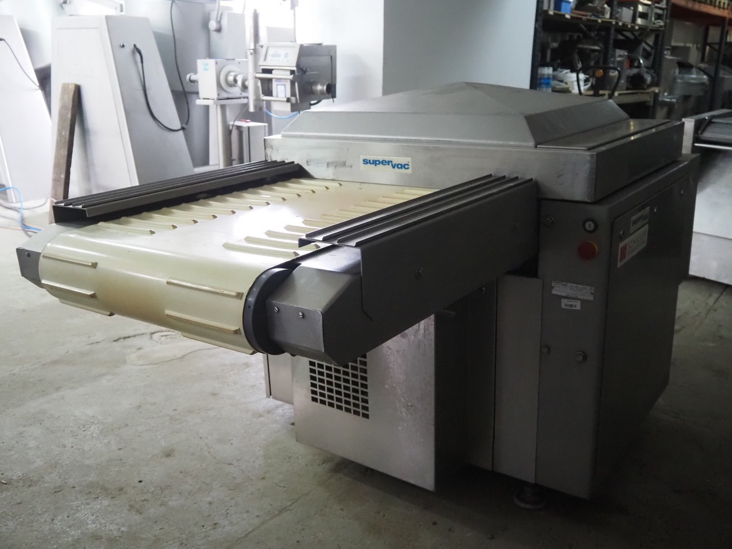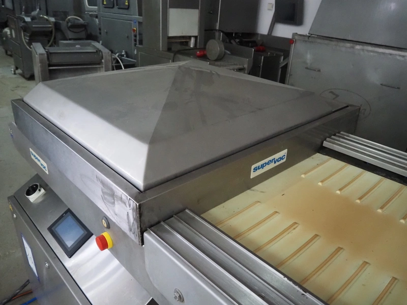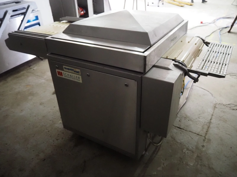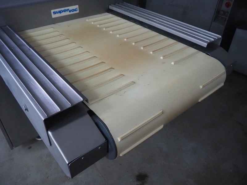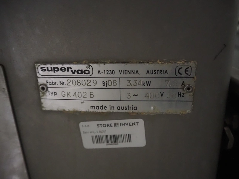 Supervac belt vacuum machine, type: GK402B, number: 208029, year of construction: 08, 400 V, 3 Ph, 50 Hz, 7.8 A, 3.34 kW, plastic belt, belt width: 620 mm, seal length: 720 mm, total dimensions: 2300 mm x 1200 mm x 1160 mm.