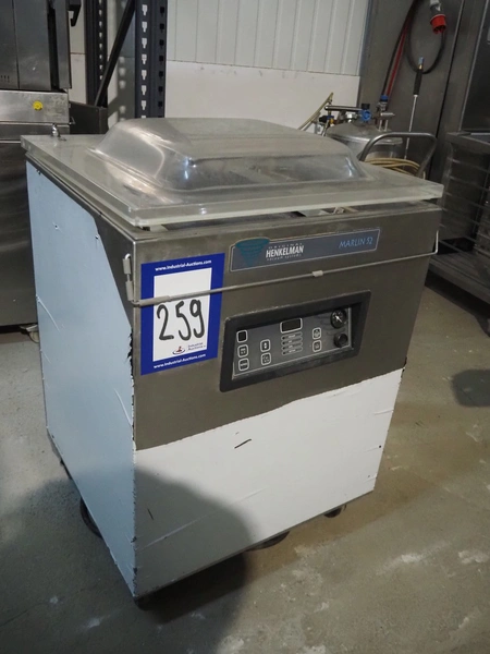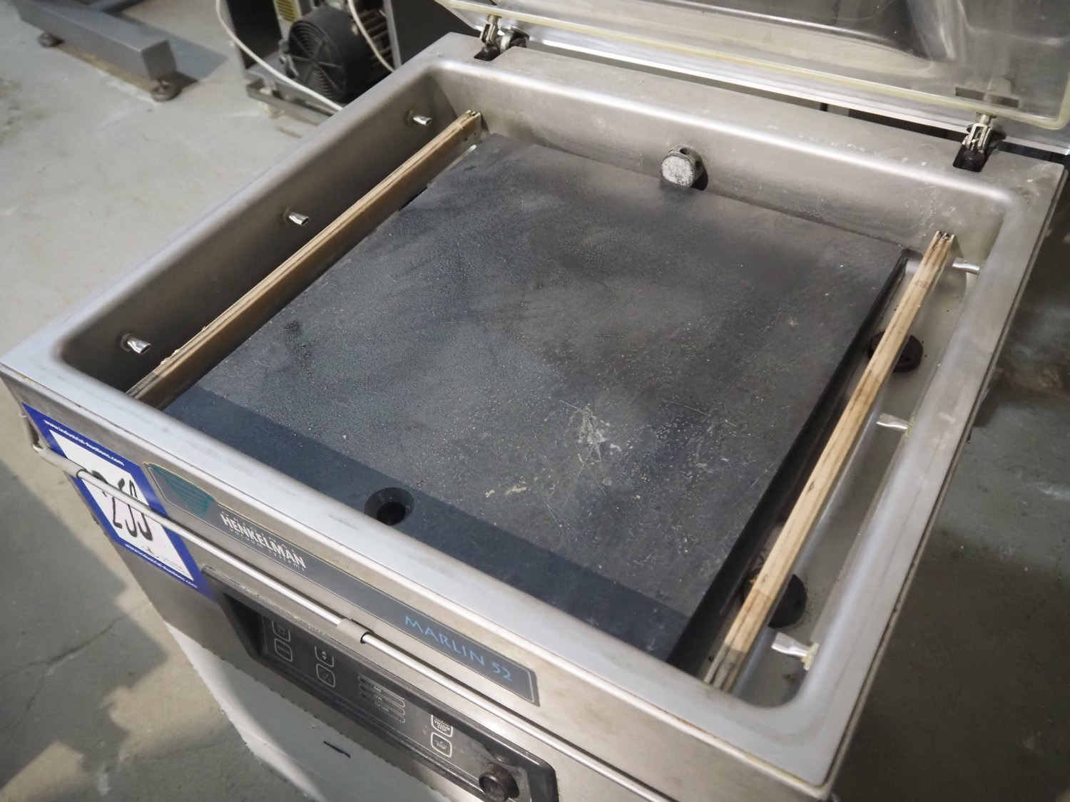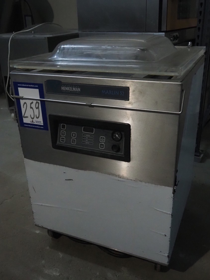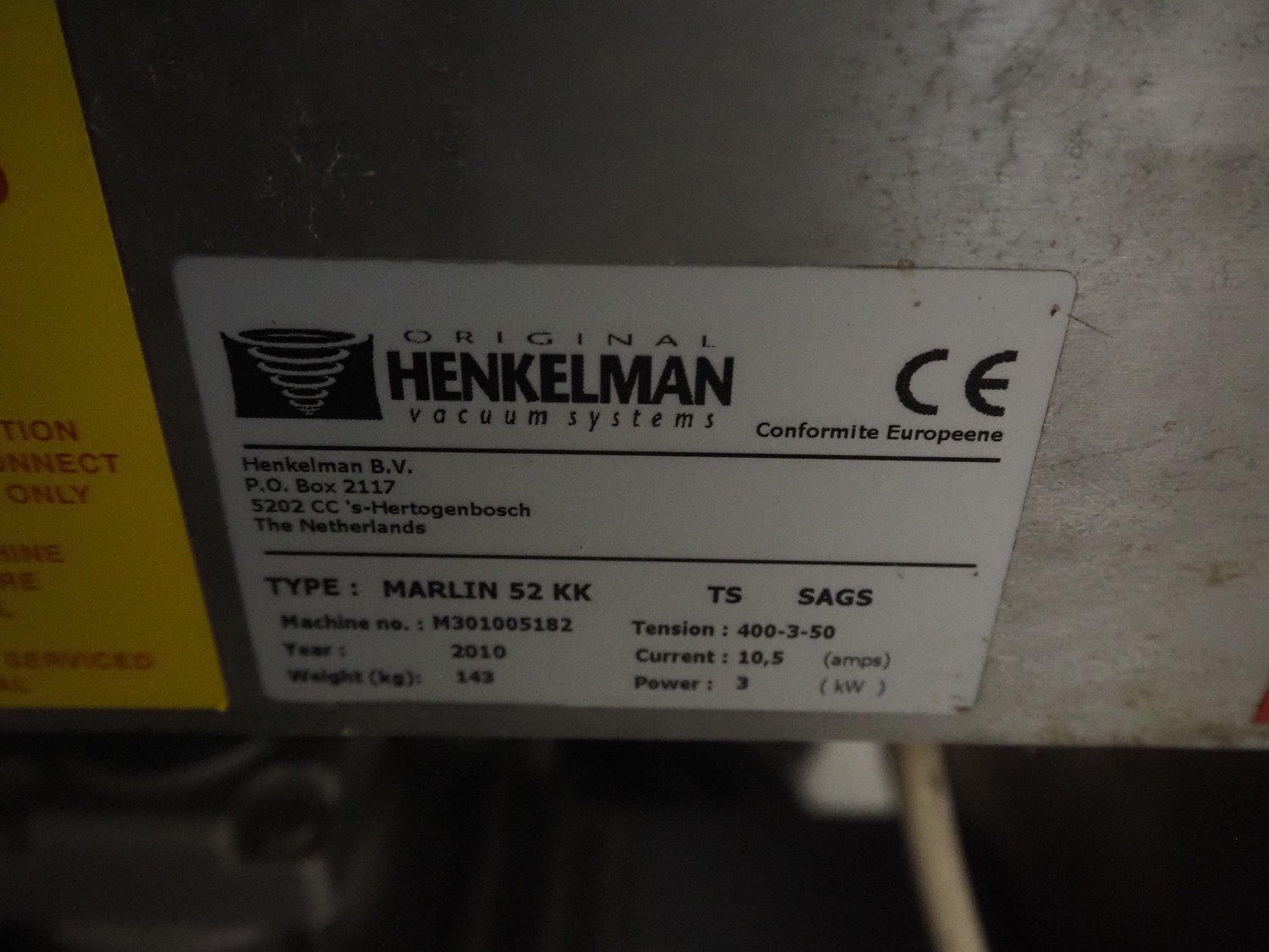 Henkelman B.V. mobile vacuum machine, type: MARLIN 52 KK, serial number: M301005182, year of construction: 2010, 400 V, 3 Ph, 50 Hz, 10.5 Amp, 3 kW, machine weight: 143 kg, seal length: (2x) 520 mm, chamber: 500 mm x 460 mm x 140 mm, Busch vacuum pump, pump type: RA 0063 F 5K3, serial number: 100025924, capacity: 63 m³ per hour, total dimensions: 680 mm x 700 mm x 1030 mm.