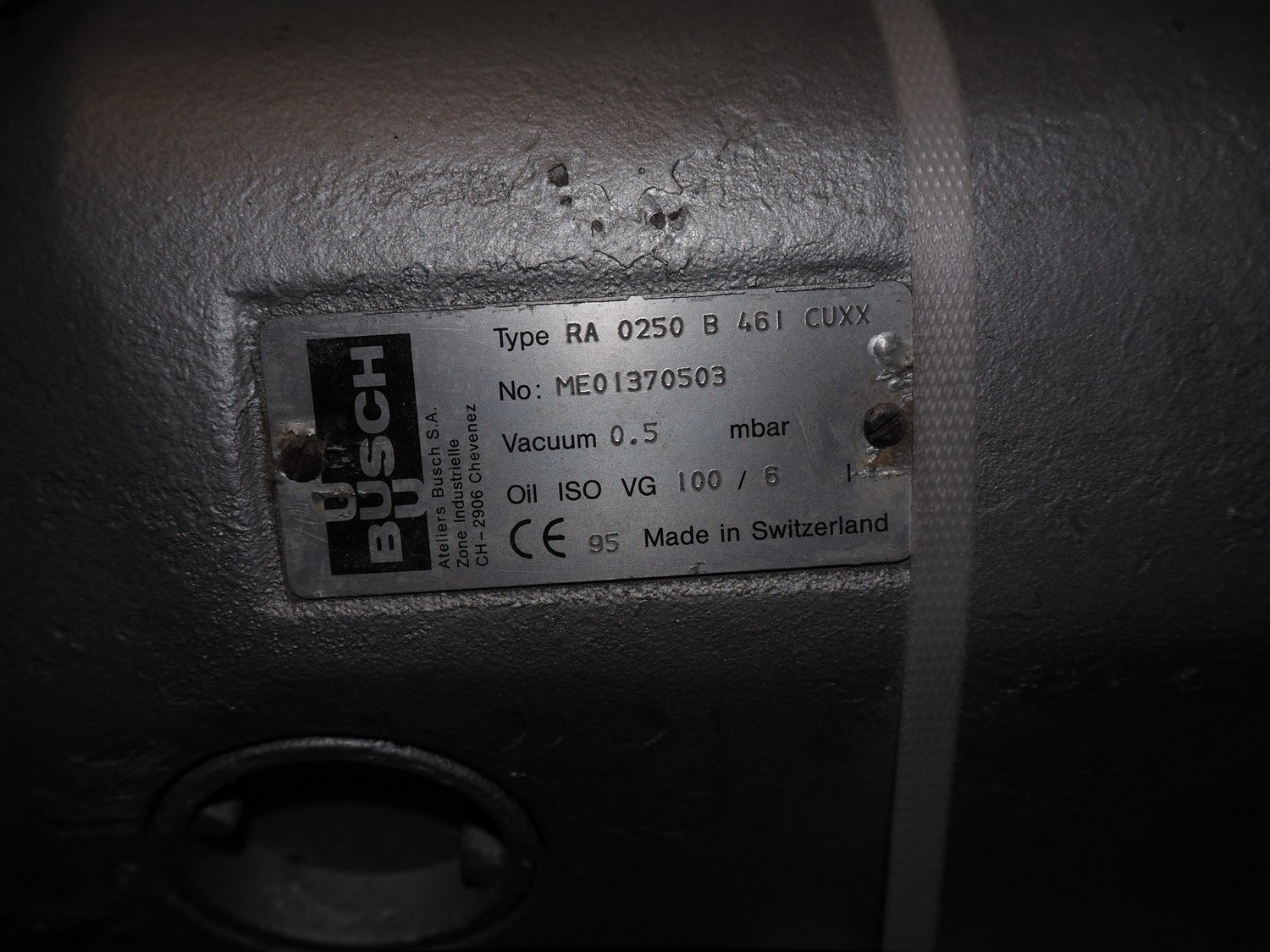 Busch vacuum pump, type: RA 0250 B 461 CUXX, number: ME01370503, year of construction: 1995, capacity: 250 m³ per hour, dimensions: 1000 mm x 600 mm x 550 mm.