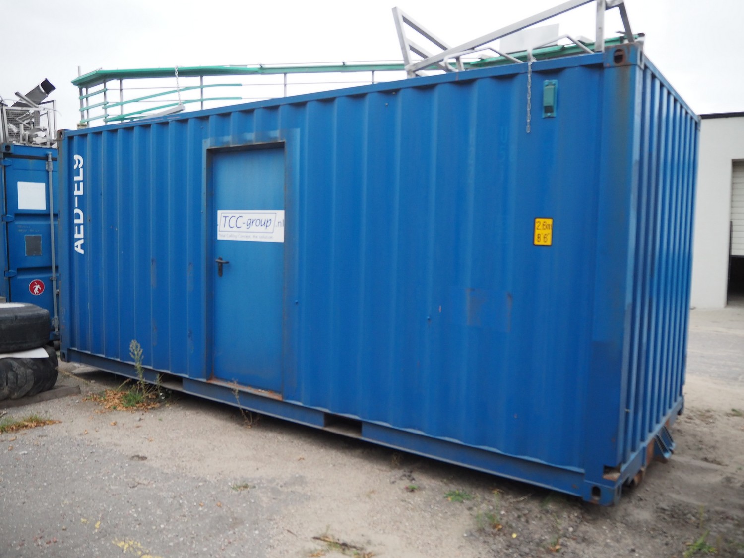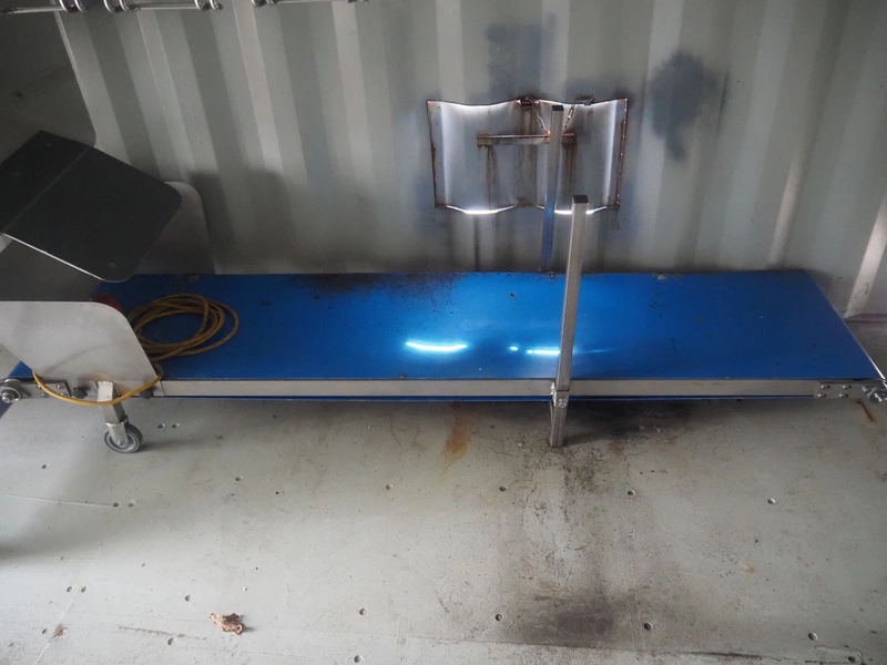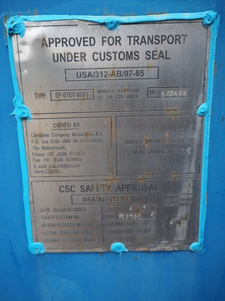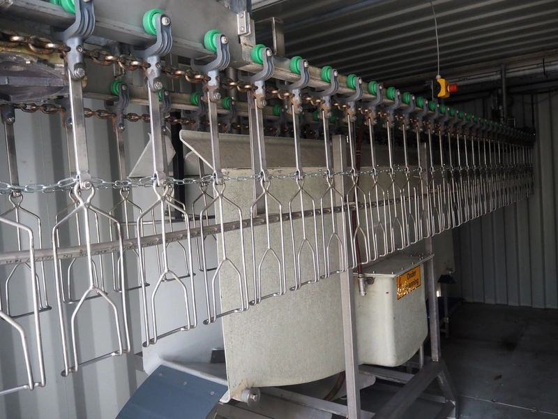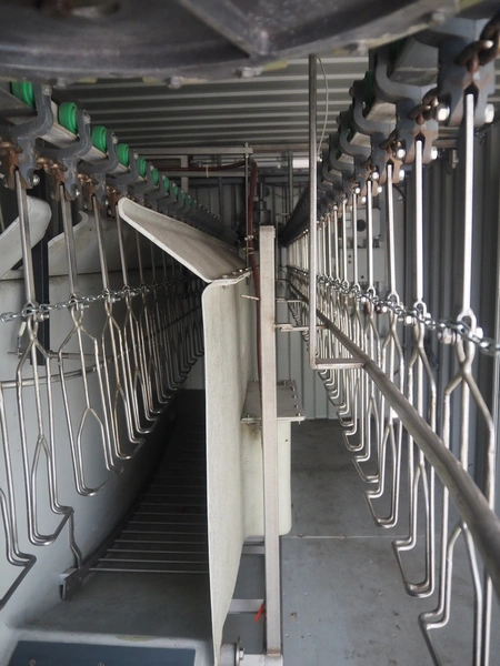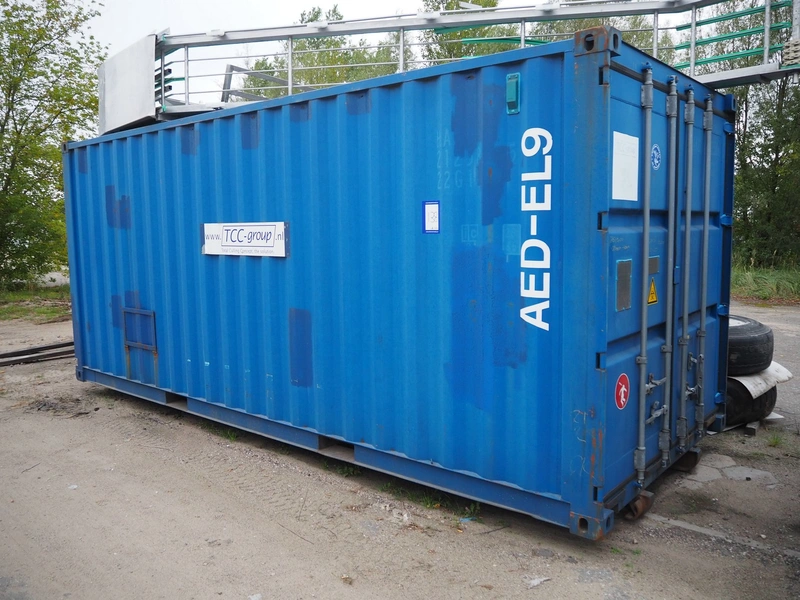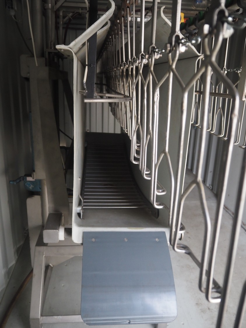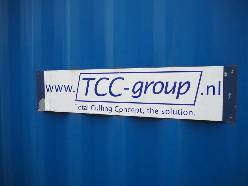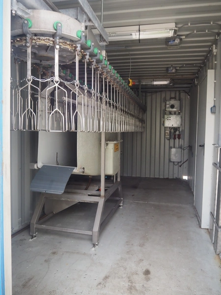 Steel 20 ft. container with Stork stunning line for chicken, model stunning line: B-5, length stunning line: 2200 mm, type container: SP-STDT-02(F), identification number: HAKU 212586 5, container weight: 2185 kg, inside volume: 33.2 m³, loading capacity: 30480 kg, total dimensions container: 5900 mm x 2350 mm x 2390 mm. Not sea worthy.