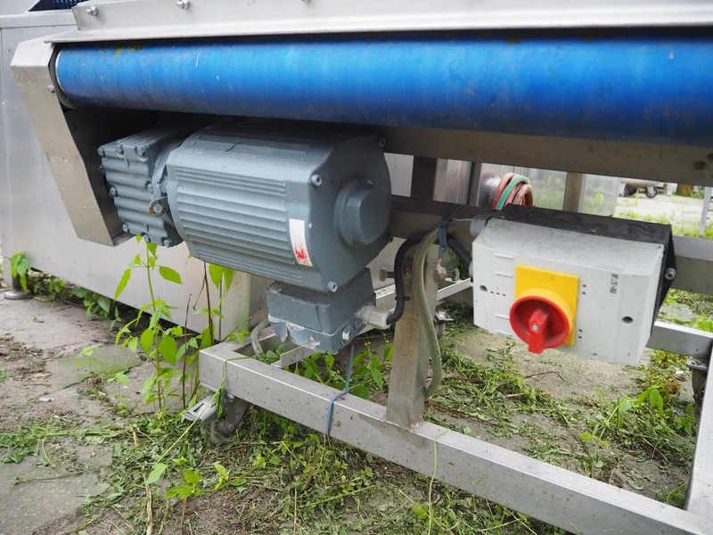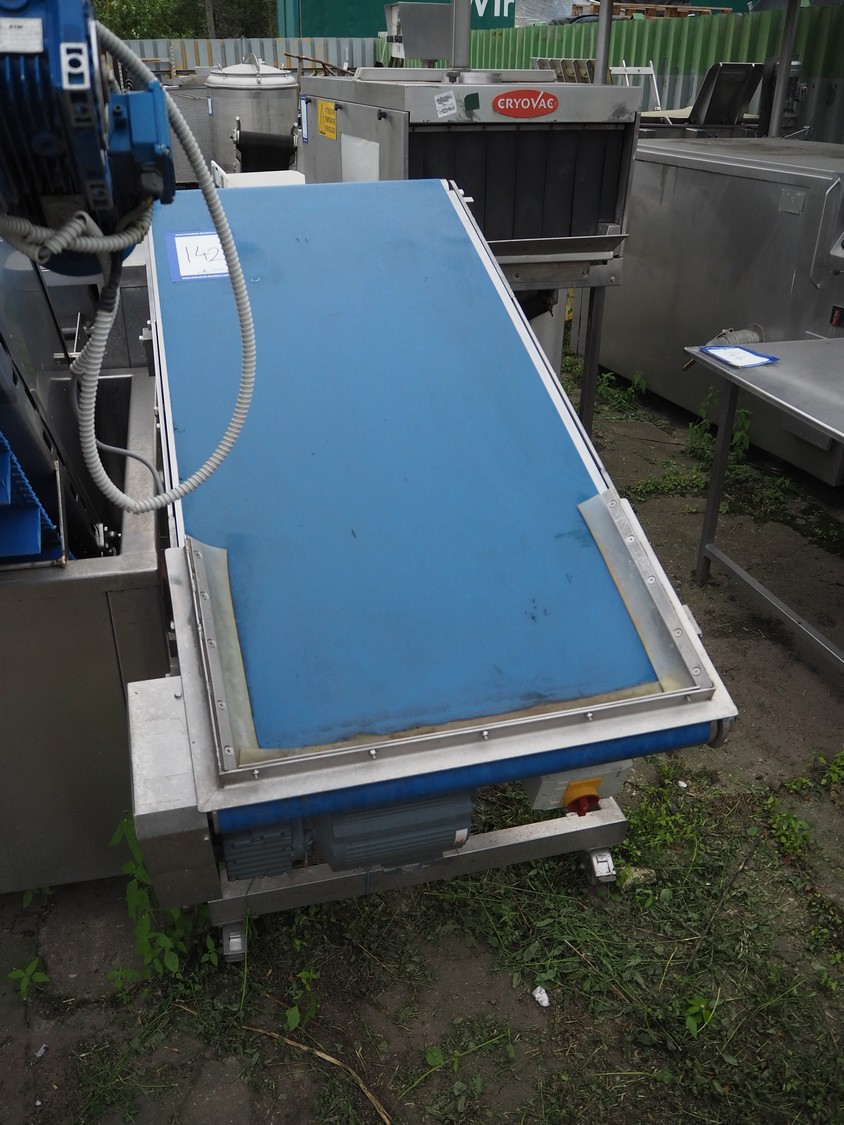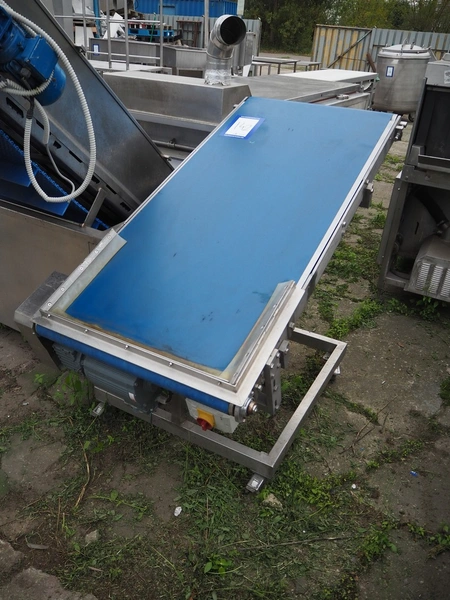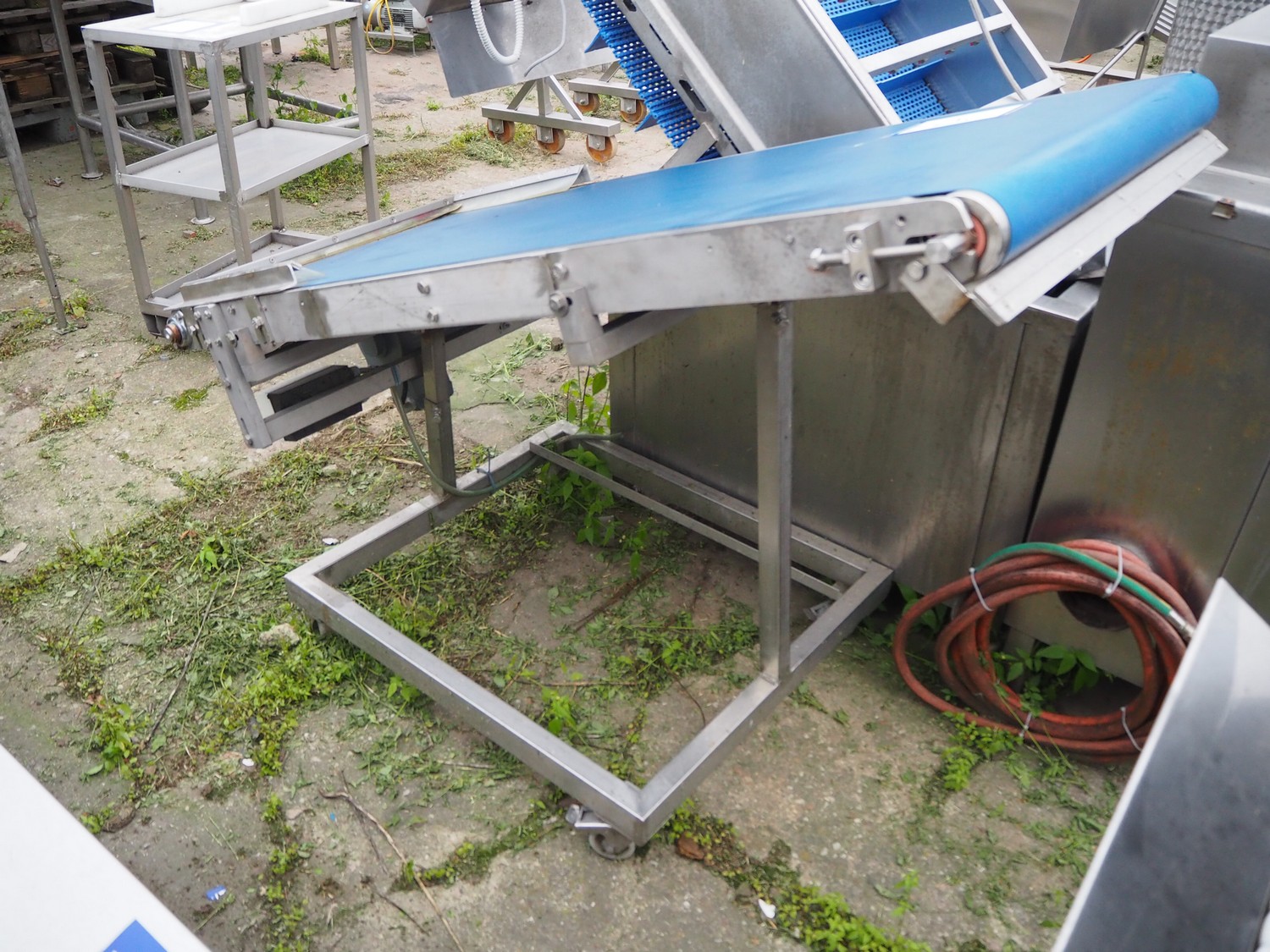 Mobile elevating belt, s/s frame, plastic belt, belt width: 700 mm, elevating height: 1200 mm, total dimensions: 1500 mm x 900 mm x 1200 mm.