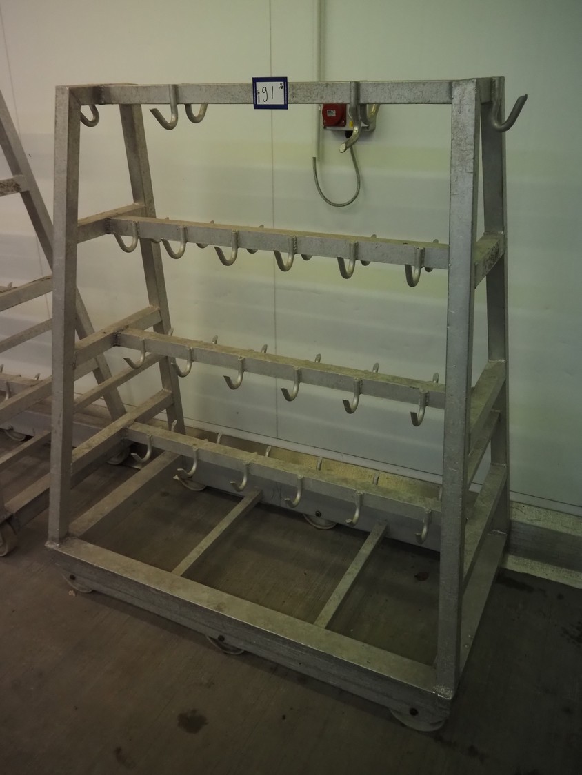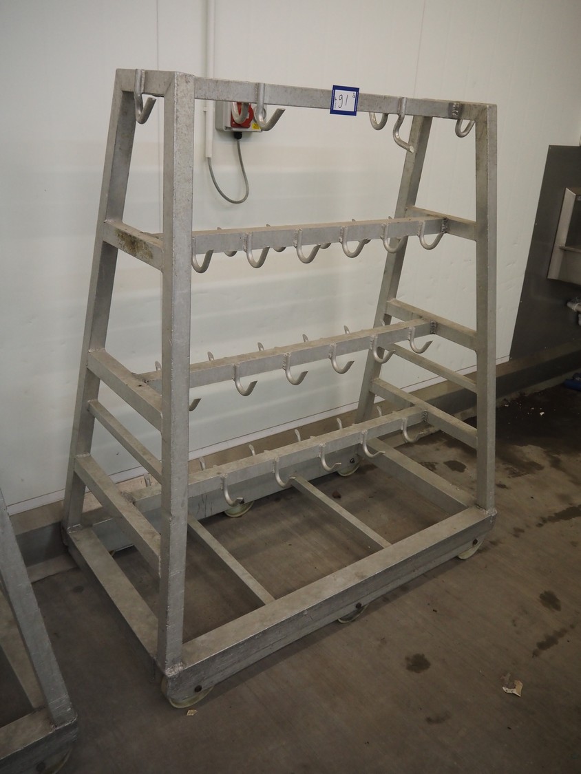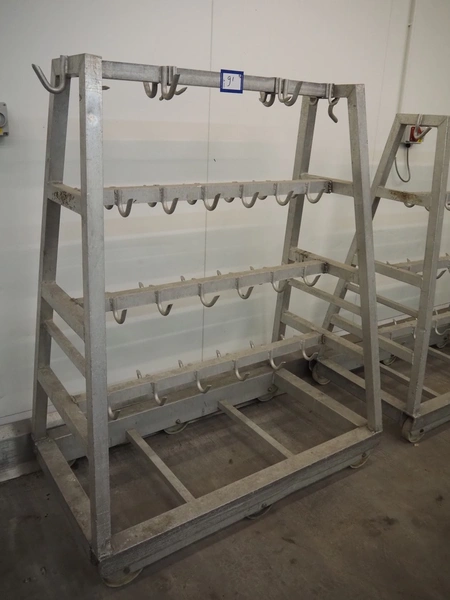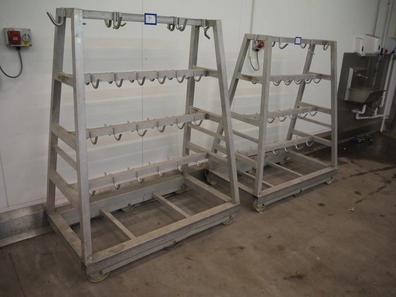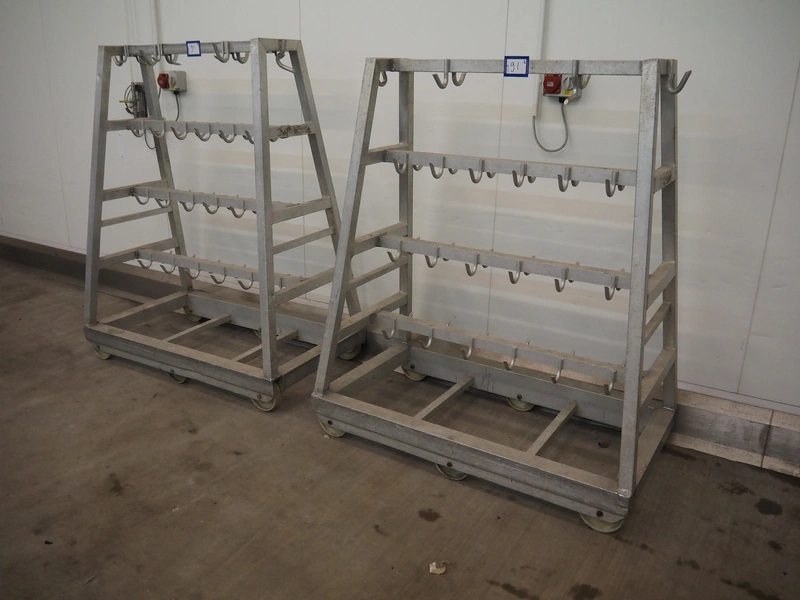 2 Aluminum trolleys with hooks, dimensions: 1570 mm x 670 mm x 1850 mm.