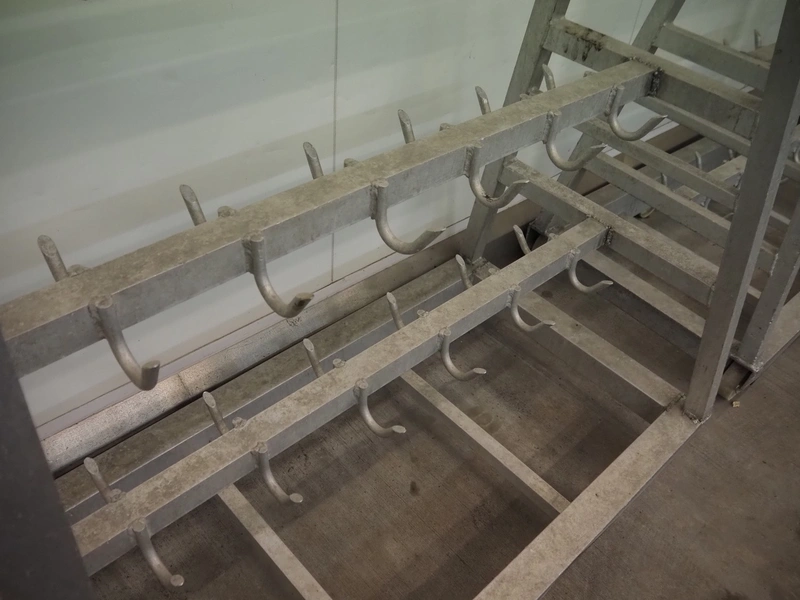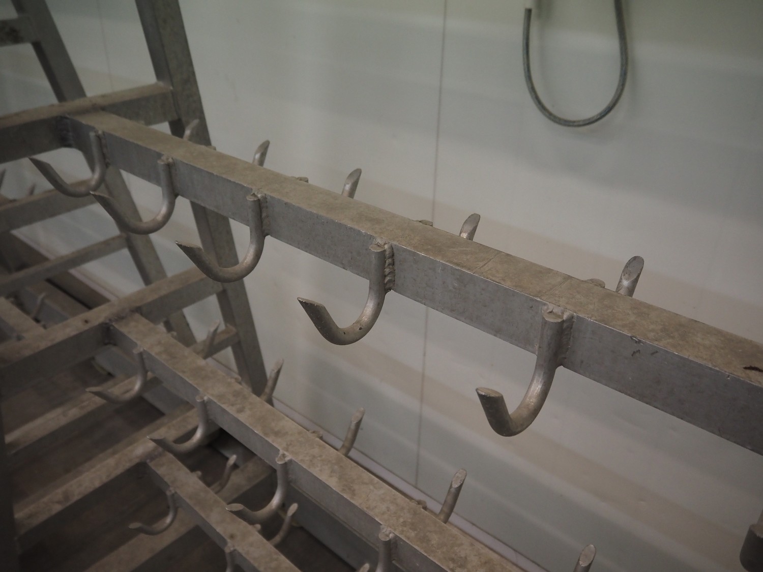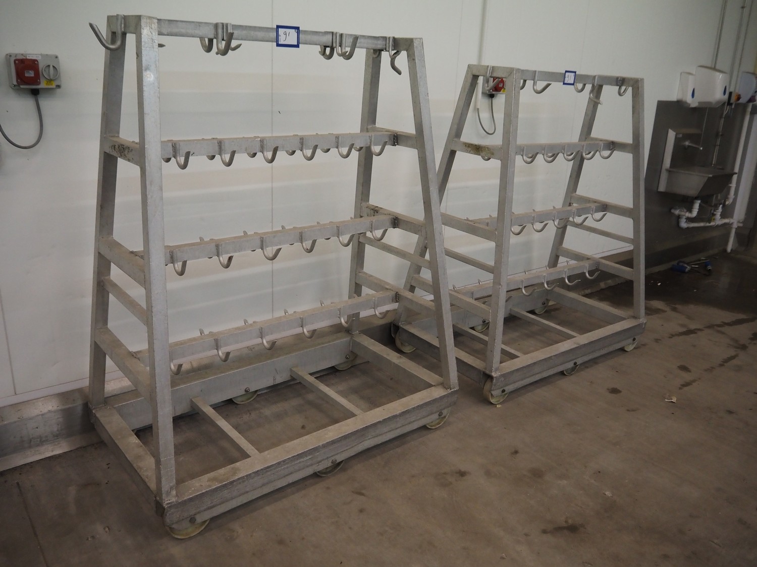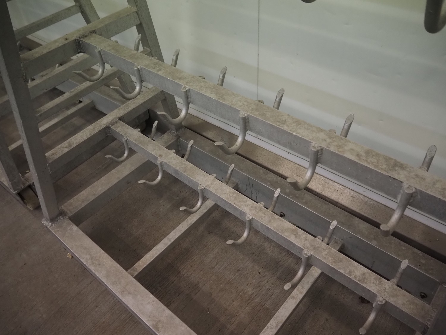 2 Aluminum trolleys with hooks, dimensions: 1570 mm x 670 mm x 1850 mm.