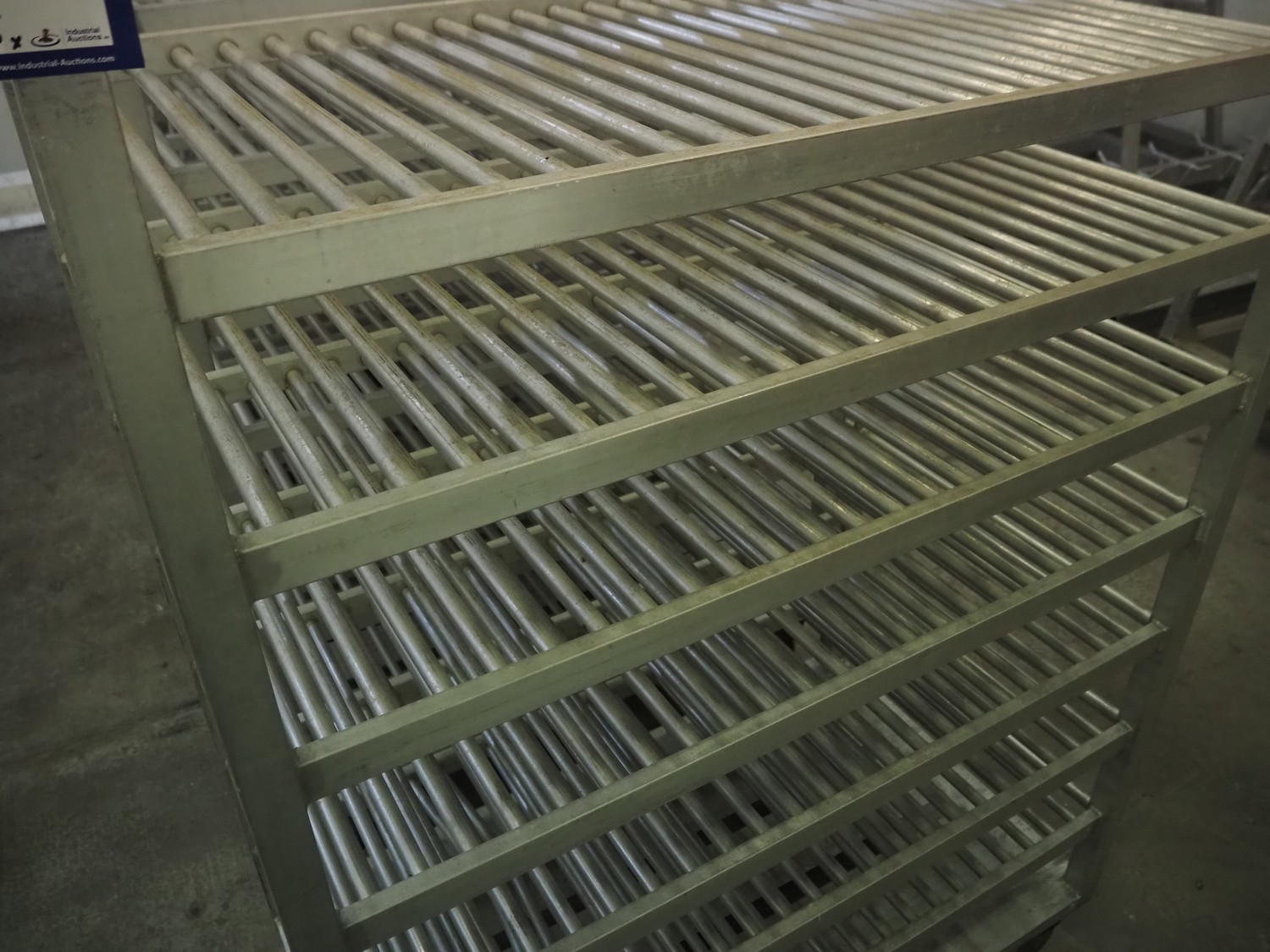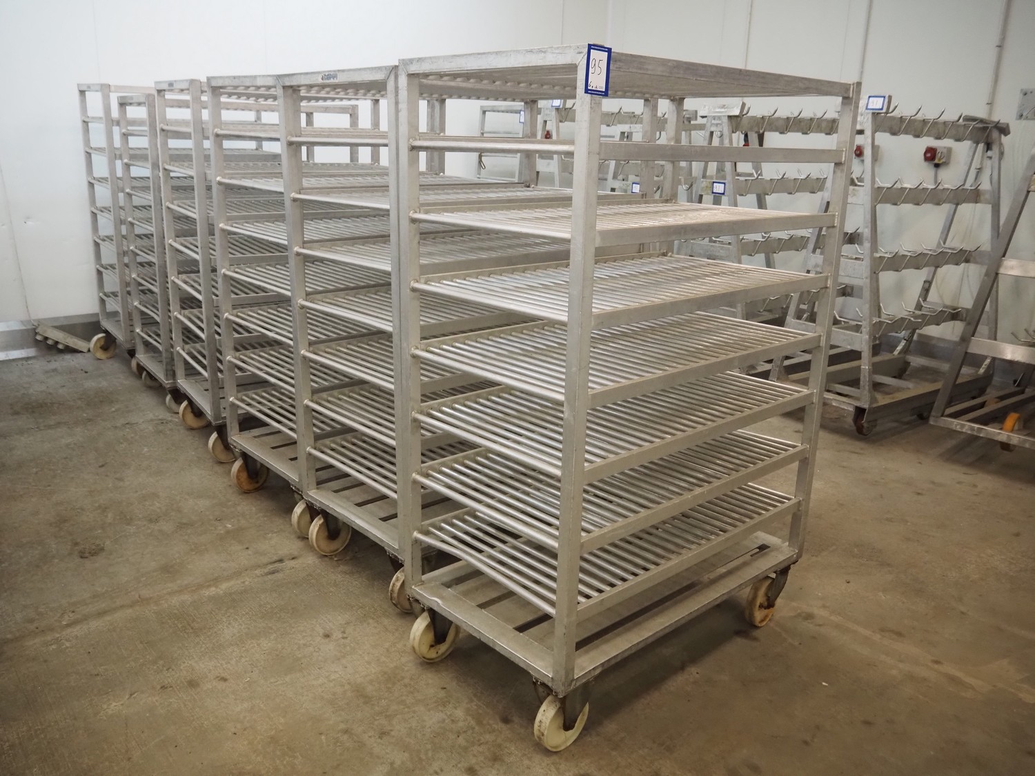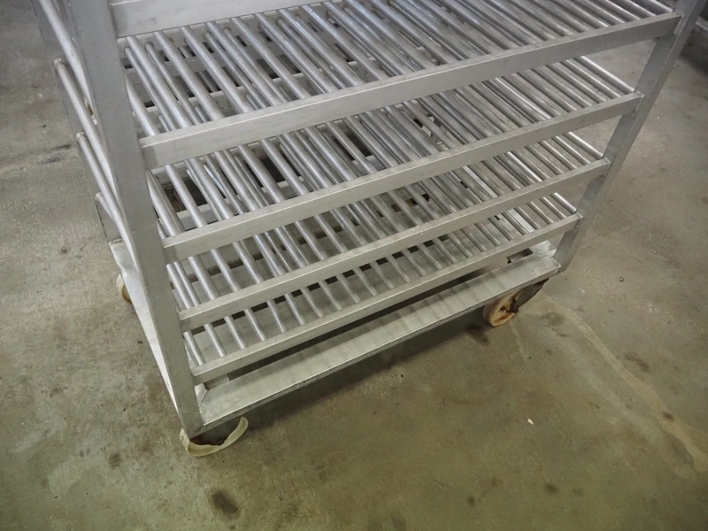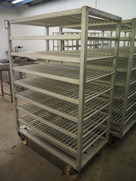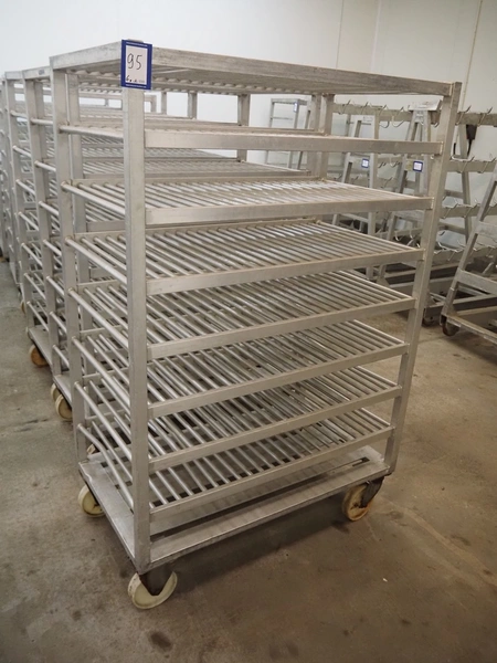 6 aluminum trolleys with 9 floors, floor dimensions: 1200 mm x 600 mm, total dimensions: (6x) 1200 mm x 690 mm x 1800 mm.