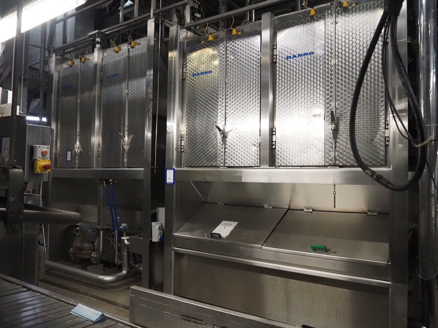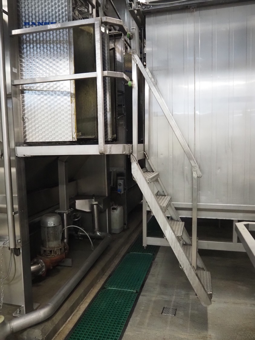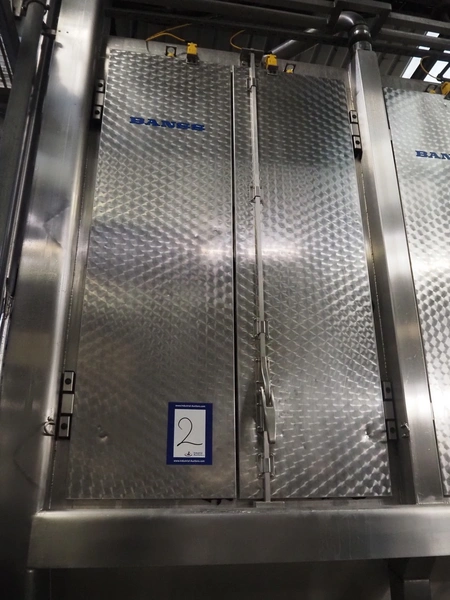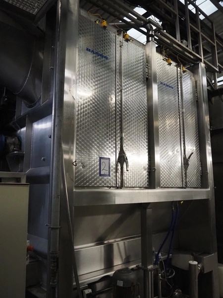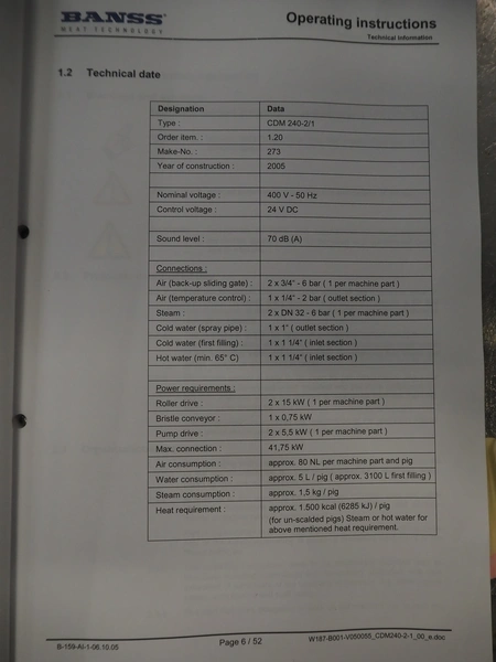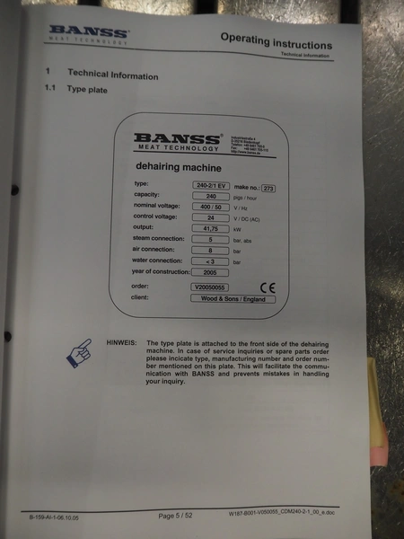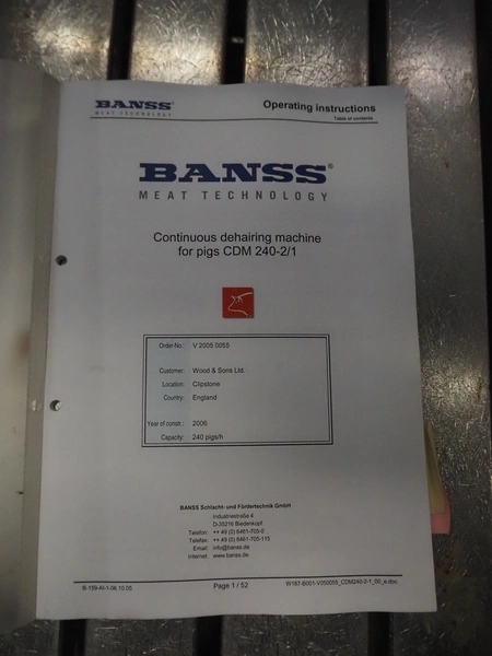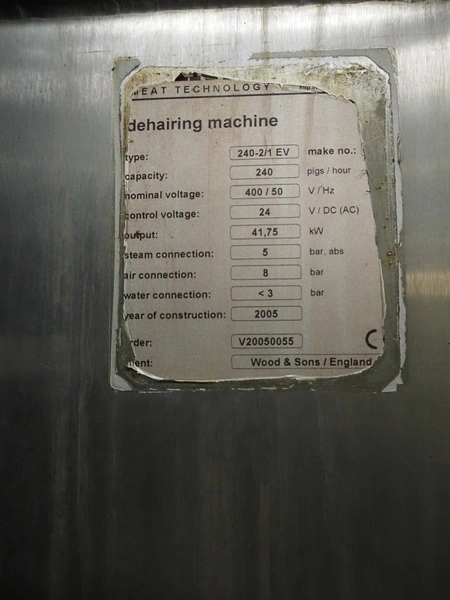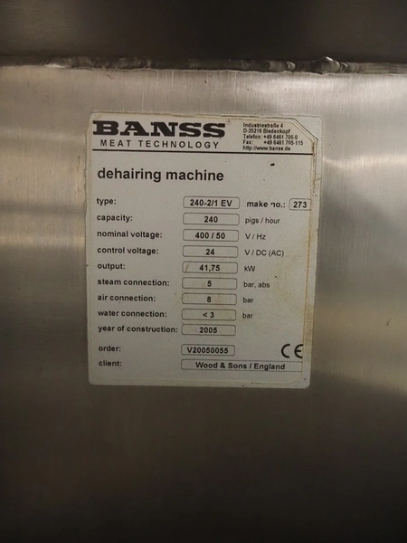 Banss Schlacht- und Fördertechnik GmbH continuous dehairing machine, type: 240-2/1 EV, serial number: 273, year of construction: 2005, 400 V, 50 Hz, 41.75 kW, capacity: 240 pigs / 120 sows per hour, dimensions: (2x) 3500 mm x 2200 mm x 3800 mm.