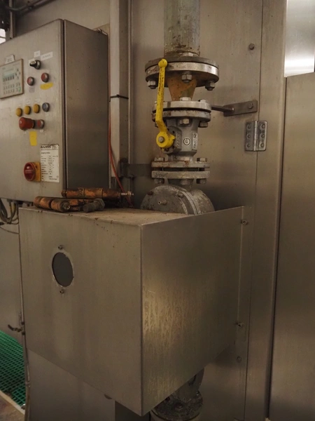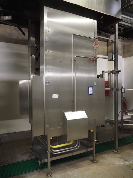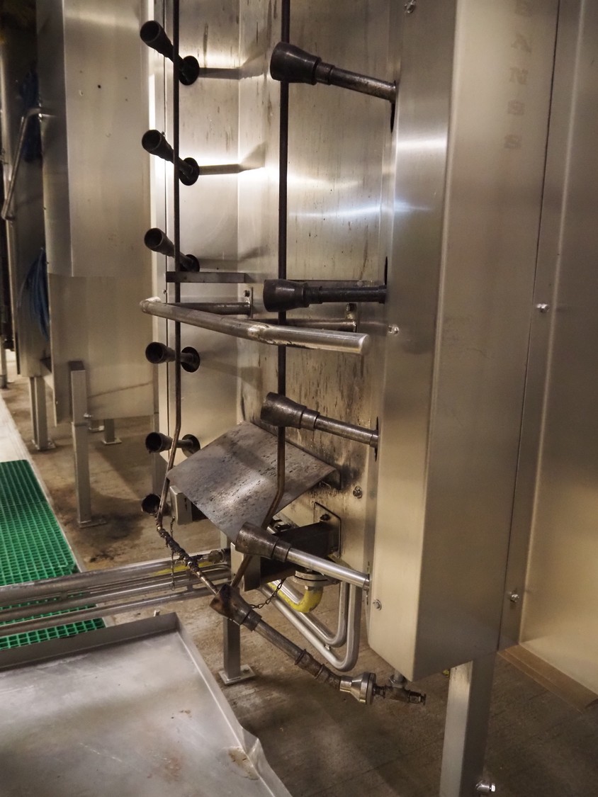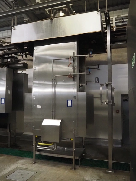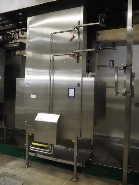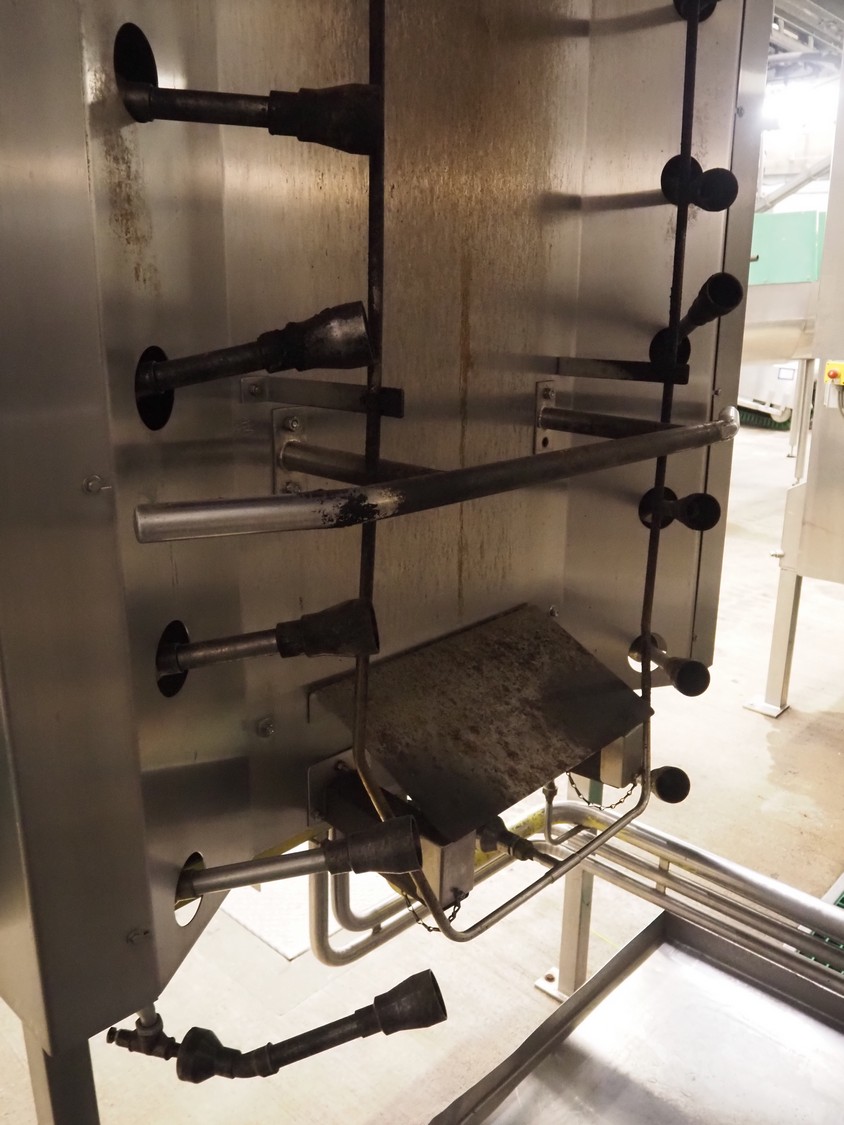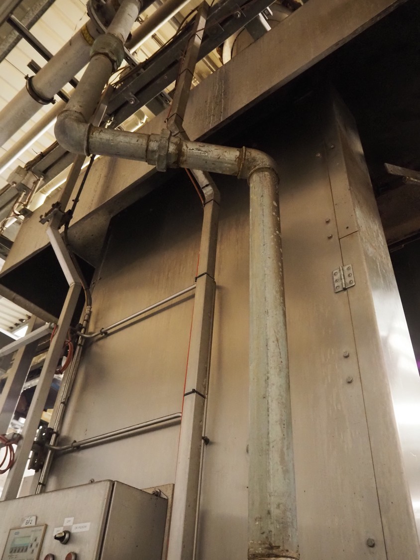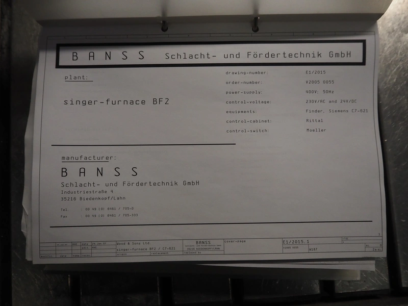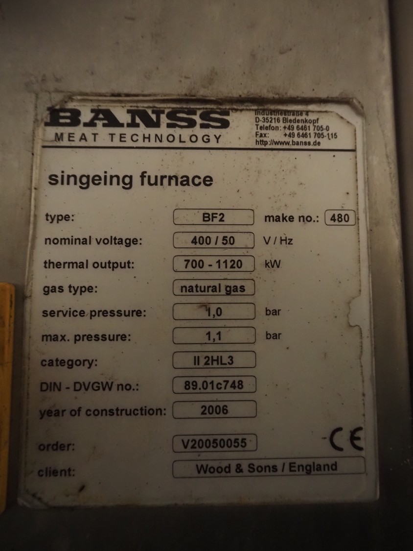 Banss Schlacht- und Fördertechnik GmbH singeing furnace, type: BF2, serial number: 480, year of construction: 2006, 400 V, 50 Hz, heated with natural gas, 700-1120 kW, working width: 2300 mm, total dimensions: 900 mm x 1000 mm x 4000 mm and 900 mm x 600 mm x 4000 mm. Including cooled tube rail.