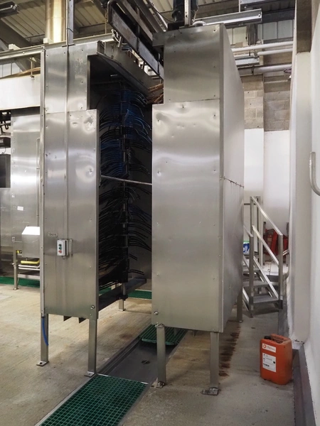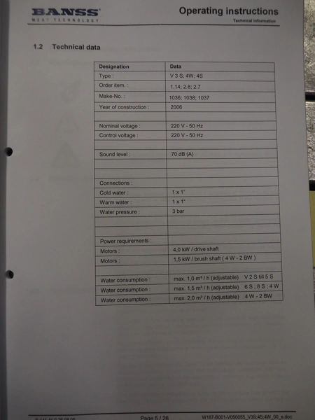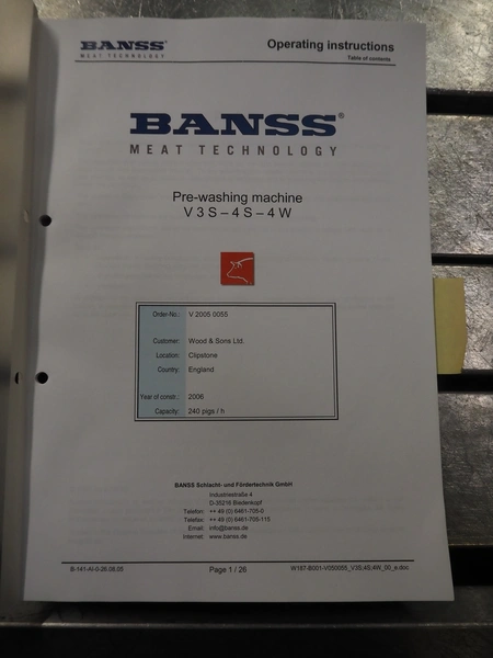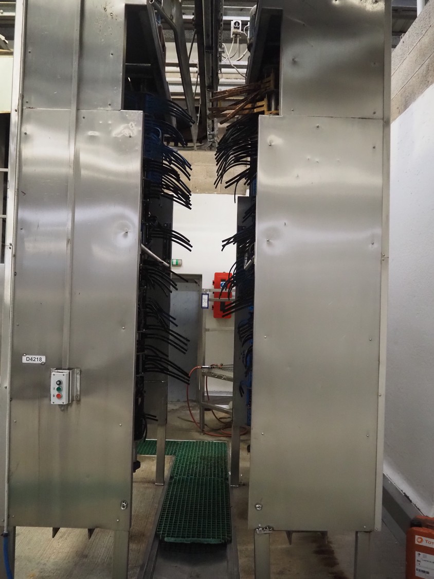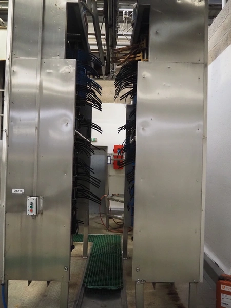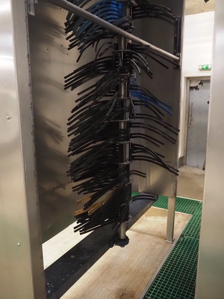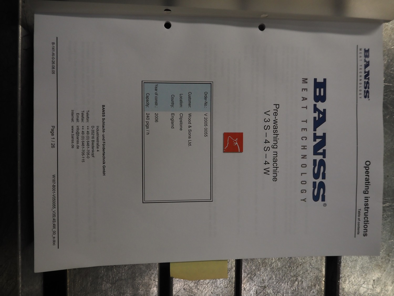 Banss Schlacht- und Fördertechnik GmbH pre-washing machine, type: V3S, serial number: 1036, year of construction: 2006, 400 V, 50 Hz, 12 kW, 3 whips, whip length: 2500 mm, total dimensions: (2x) 2150 mm x 700 mm x 4200 mm.