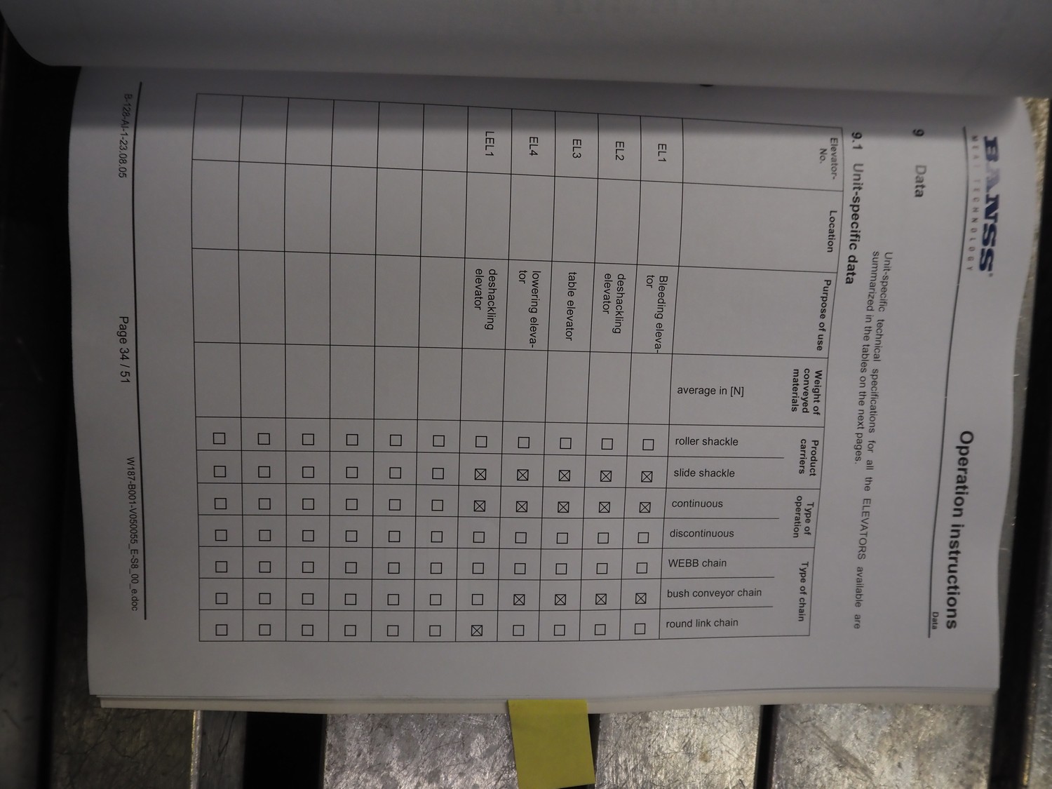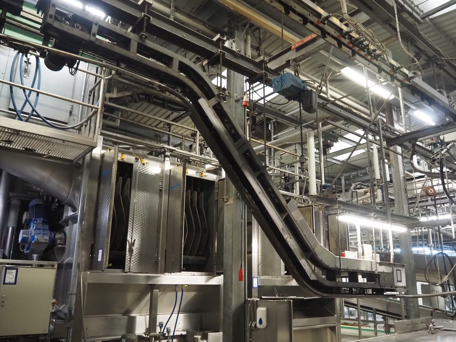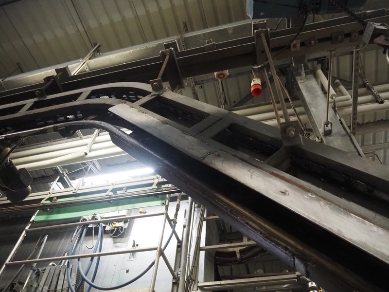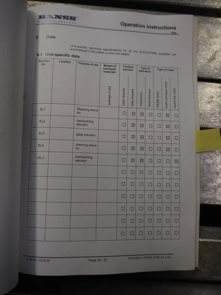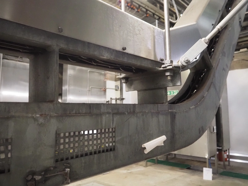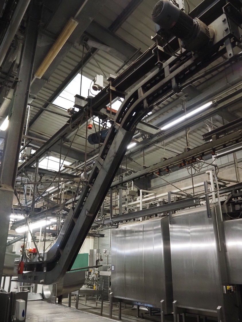 Banss Schlacht- und Fördertechnik GmbH slide shackle continuous bush conveyor chain elevator, year of construction: 2006, 230/400 V, 50 Hz, 3.0 kW, elevating height: 2400 mm, total dimensions: 5500 mm x 250 mm x 2500 mm.