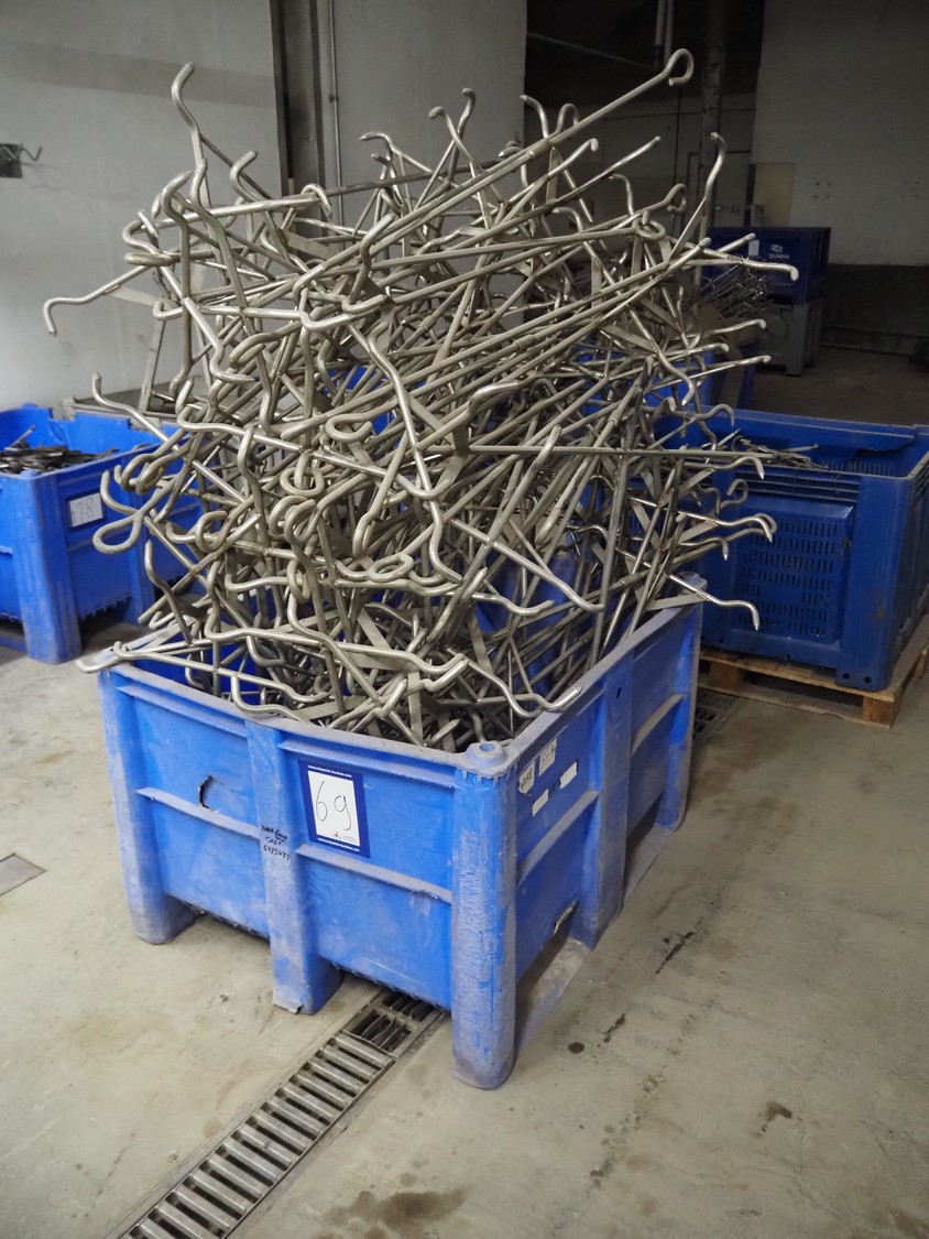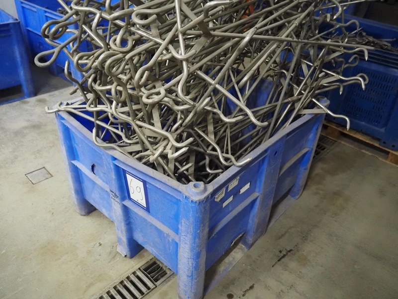 Pallet box with s/s organ hooks, dimensions: 520 mm x 520 mm x 1160 mm.